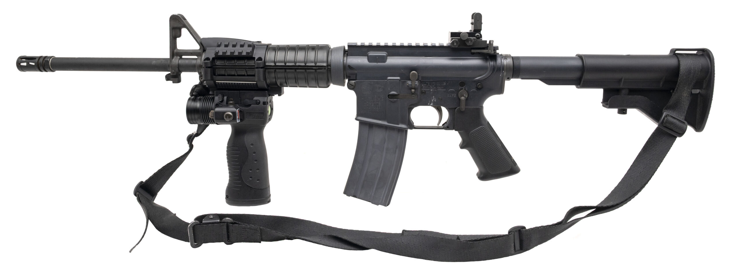 SN: BD001700. 1994 production, .223 Remington with a 16" barrel. Bore is bright with strong rifling. Semi-auto tactical carbine Sig Sauer STL-300J red laser & flashlight combo vertical grip, accessory rail adapters, and front sight post w/flip-up rear iron sight. Very good condition overall. Comes equipped with a sling.