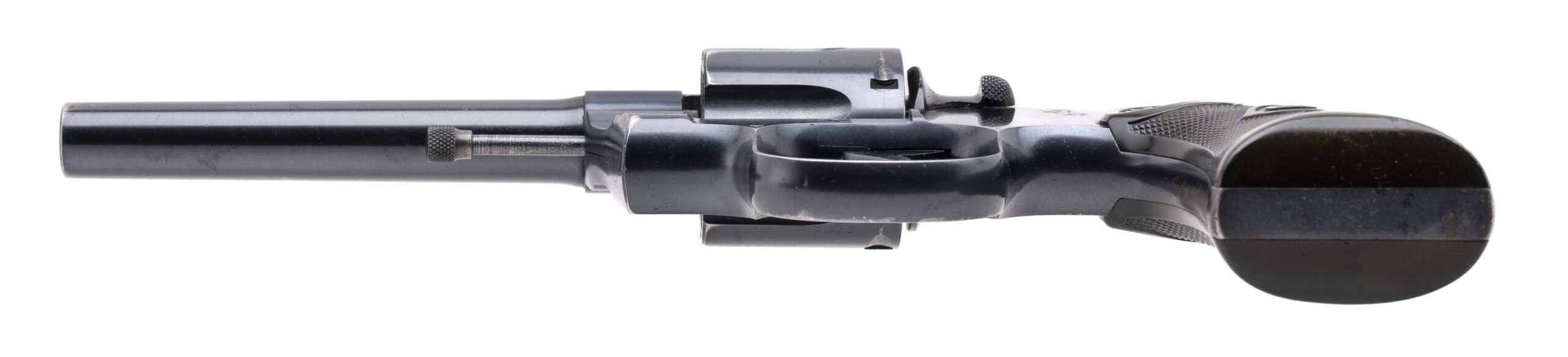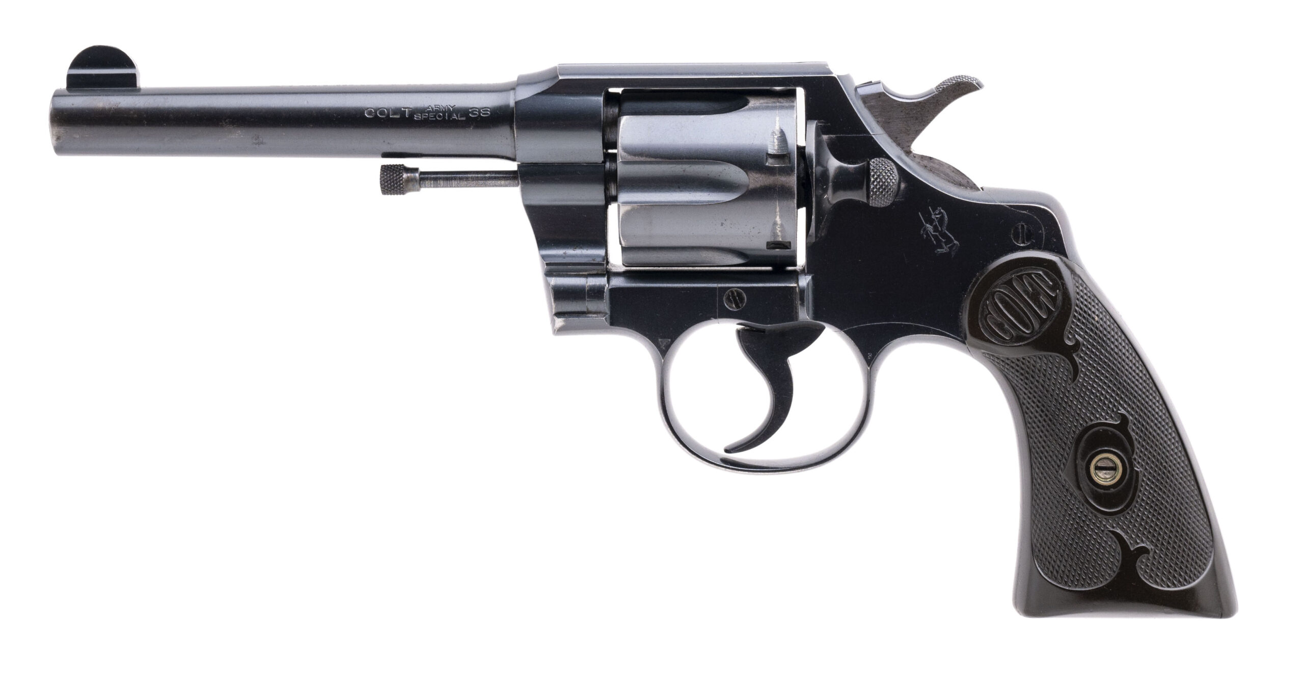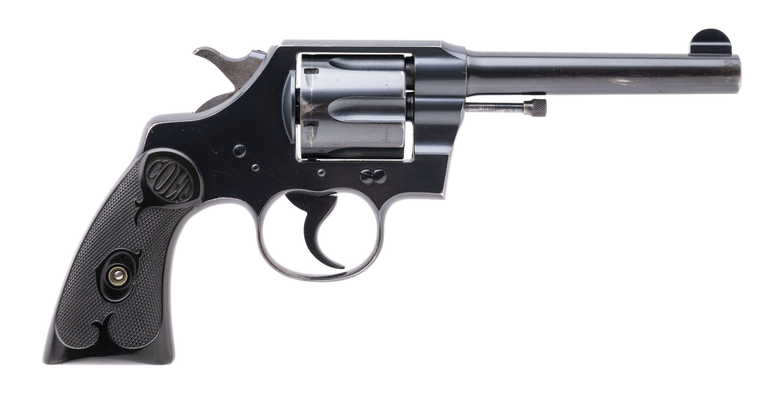 SN: 474655. made in 1922. .38 Special with a 5" barrel. Bore is bright with strong rifling. Pre-war double action Colt revolver. Blue finish is in very good condition with expected wear near the muzzle, and light handling wear on the grip frame. Colt grips are in very good condition with strong checkering. Action locks up tight. Overall very good condition.