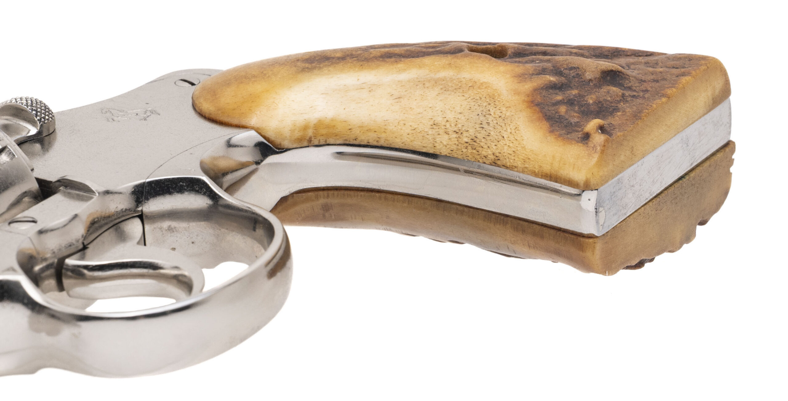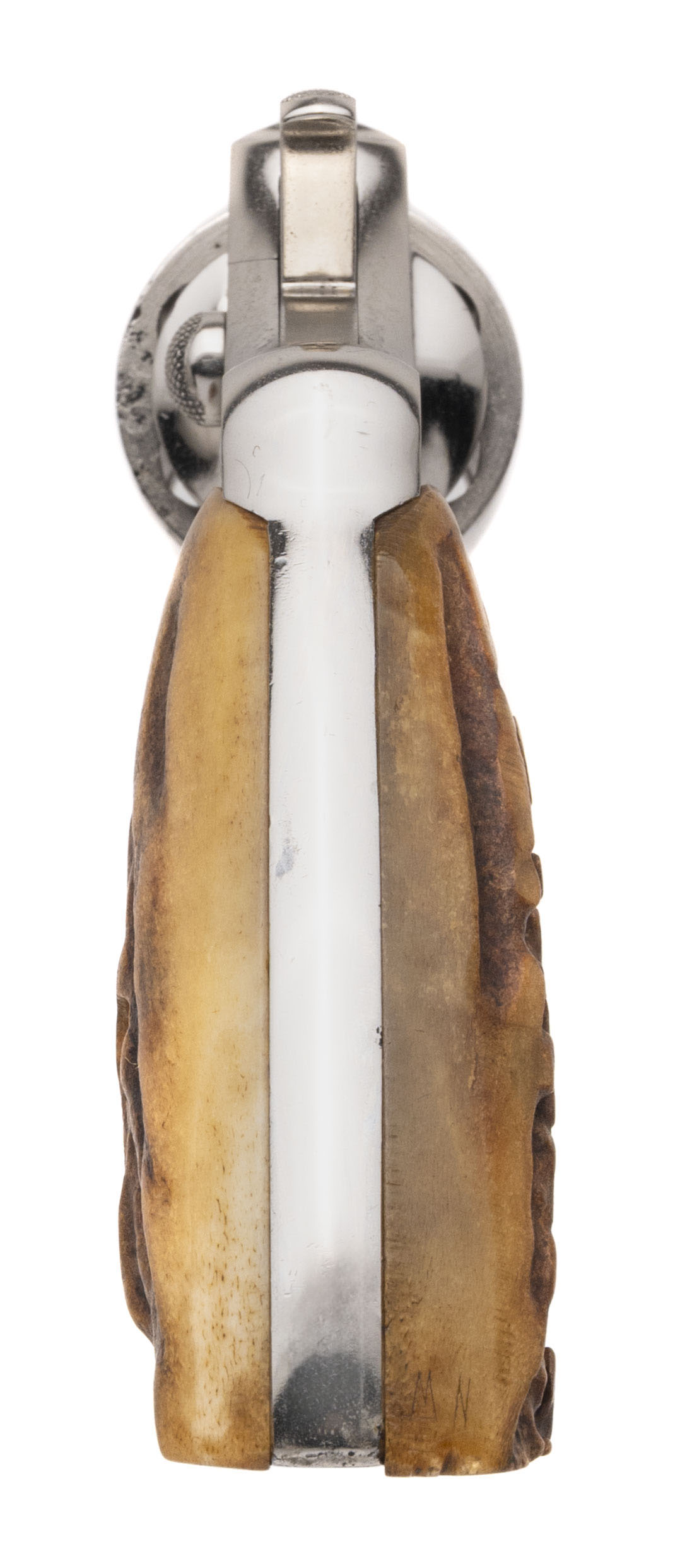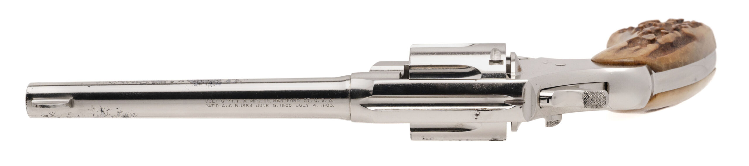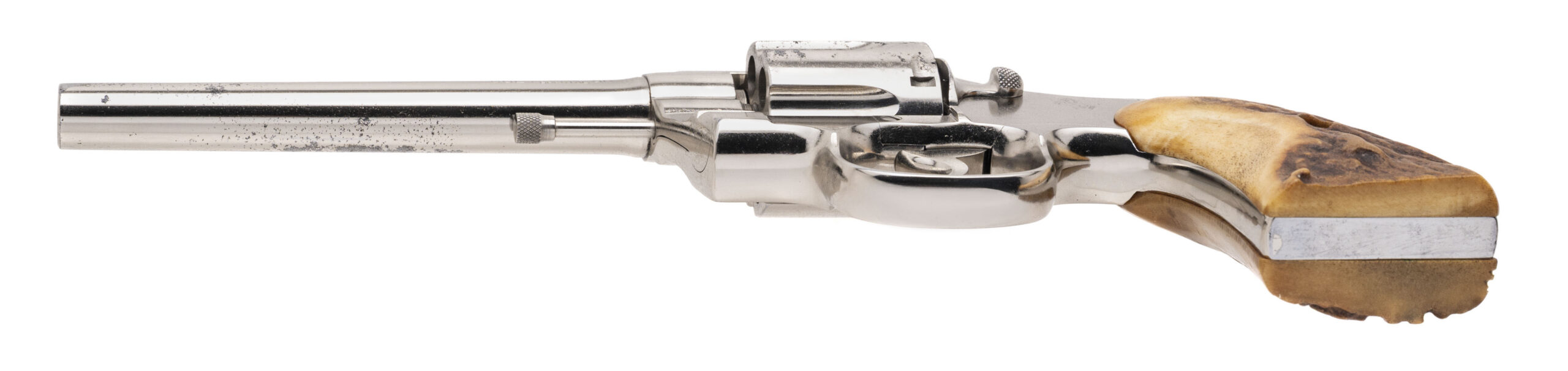 SN: 439309. 1919 production, .38 Special with a 6" barrel. Bore is excellent. Pre-War double action revolver with a bladed front sight and genuine Stag grips. Metal shows moderate wear but has been professionally refinished. The overall condition is good.