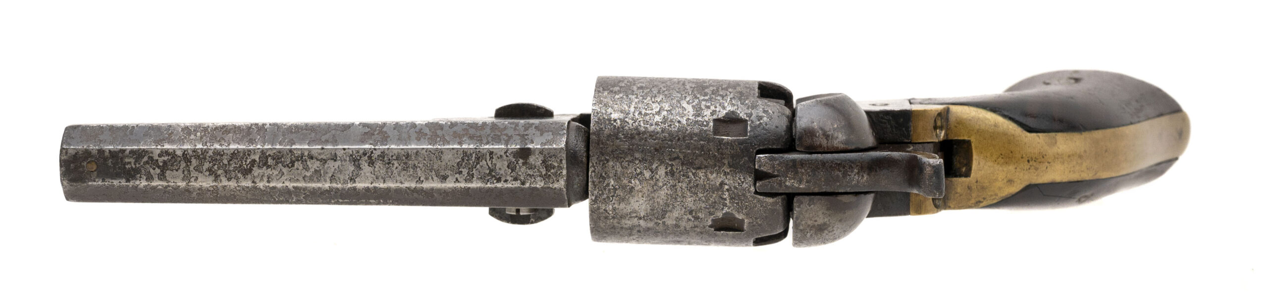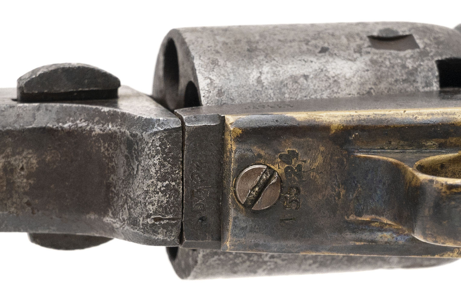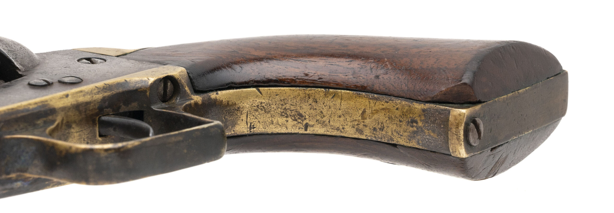 Serial No. 15524, made in 1850, .31 caliber, 4” octagonal barrel. Bore is fair with oxidation visible in the grooves, rifling remains present. Serial numbers are matching with a faint cylinder scene visible. Metal is mostly a dark grey patina with surface oxidation noted throughout. Grips show wear with a repair present on the right side. Action indexes correctly but does not function when trigger is pulled.