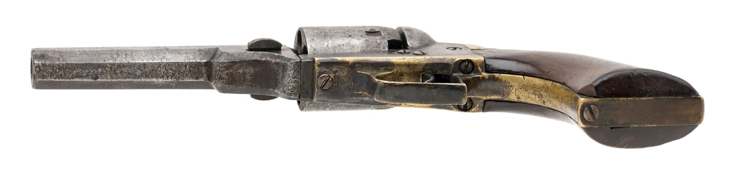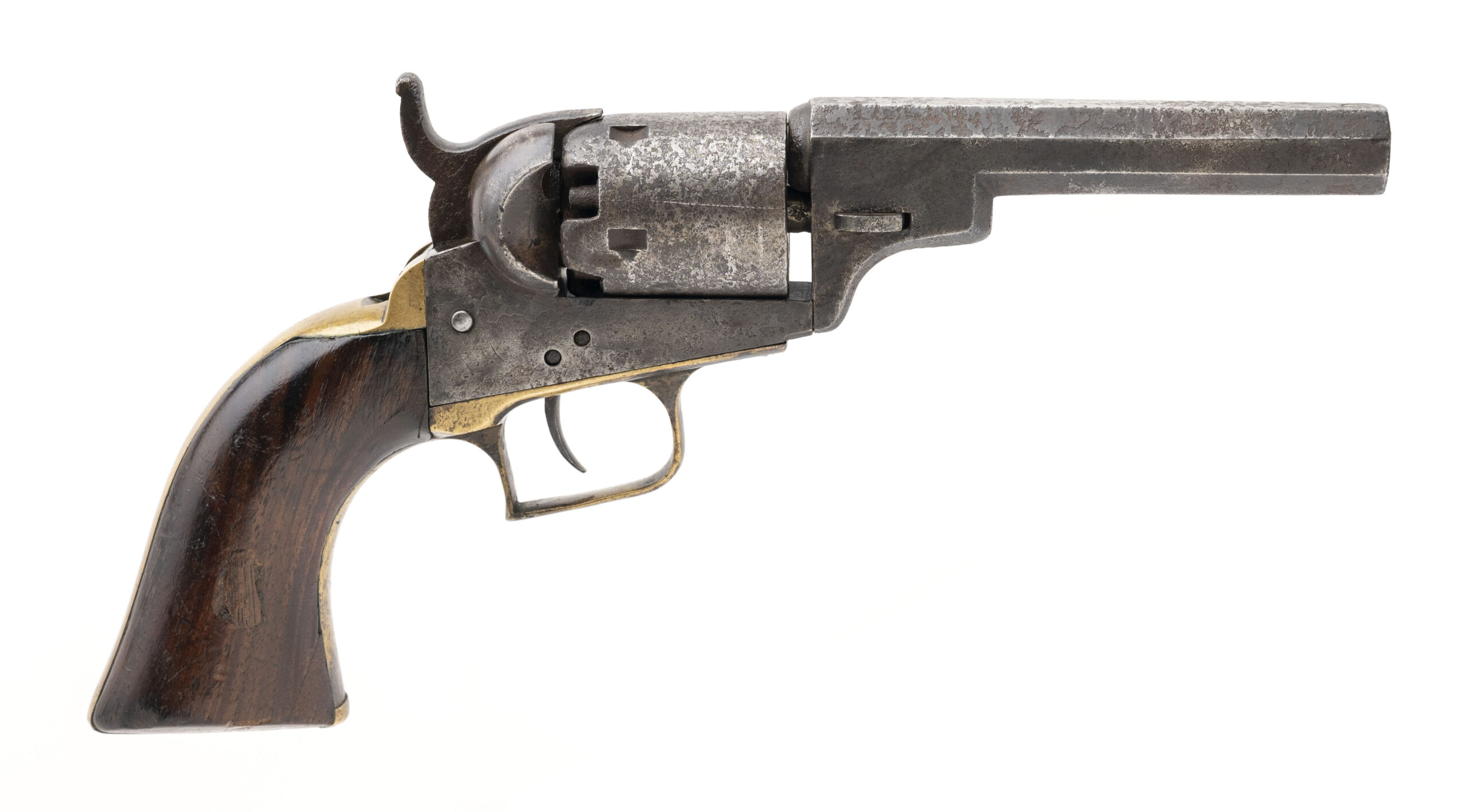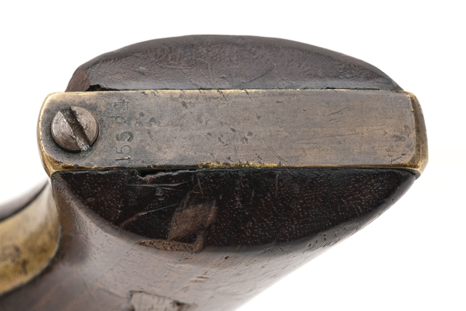 Serial No. 15524, made in 1850, .31 caliber, 4” octagonal barrel. Bore is fair with oxidation visible in the grooves, rifling remains present. Serial numbers are matching with a faint cylinder scene visible. Metal is mostly a dark grey patina with surface oxidation noted throughout. Grips show wear with a repair present on the right side. Action indexes correctly but does not function when trigger is pulled.