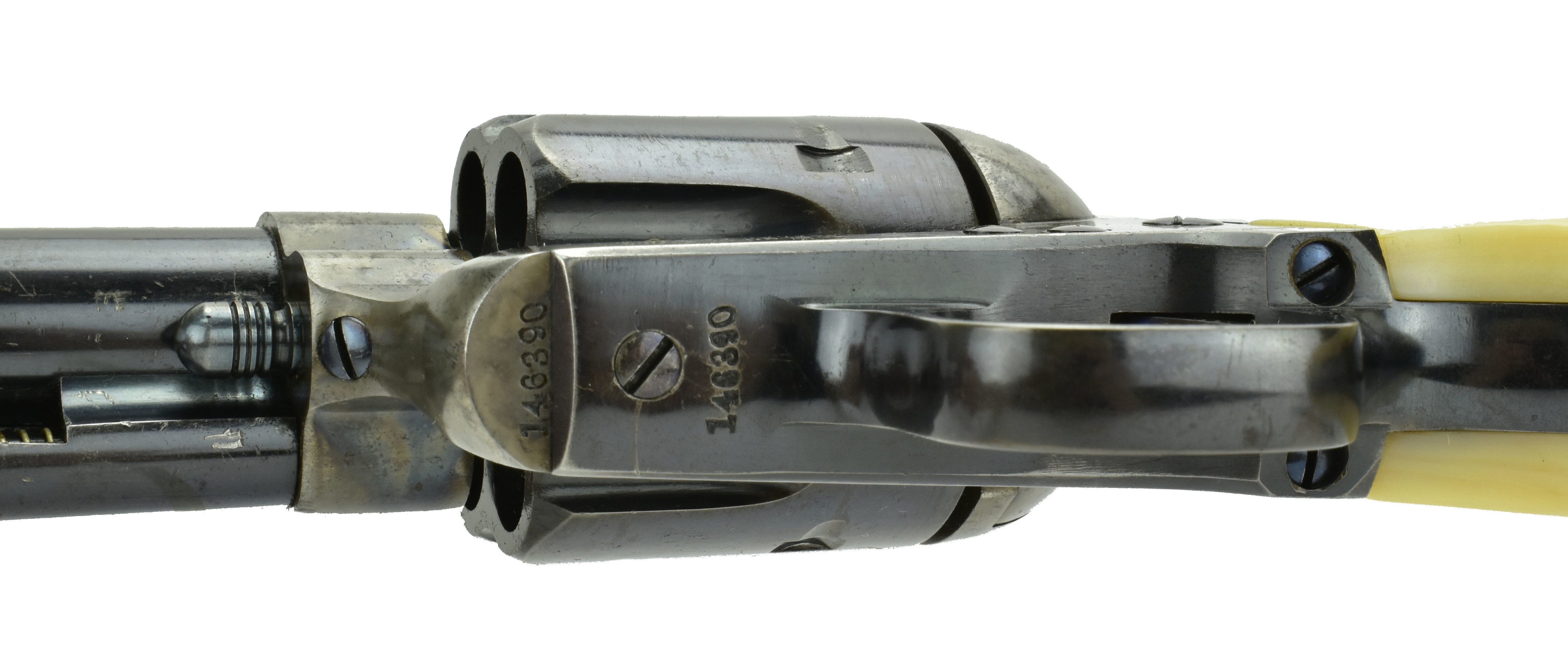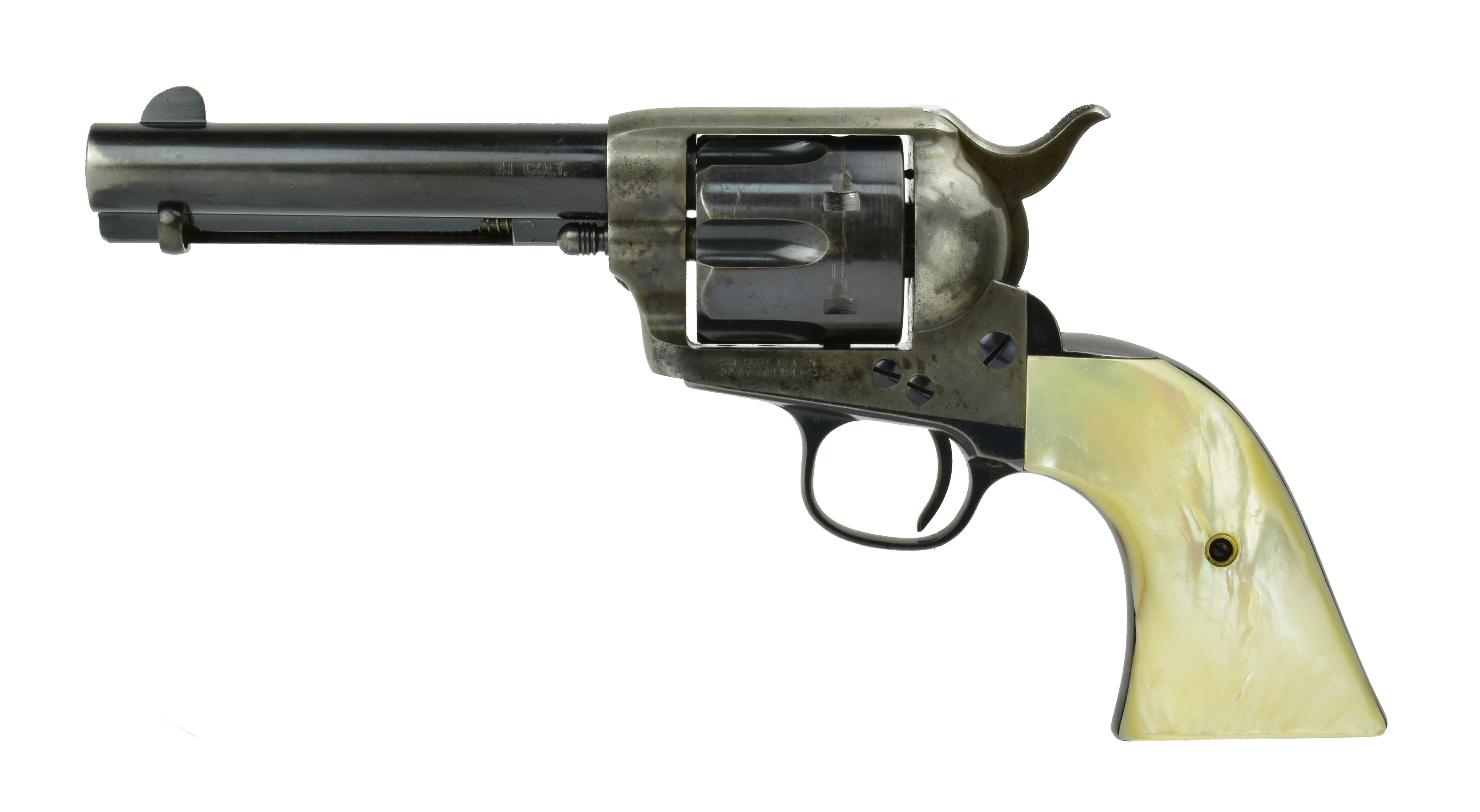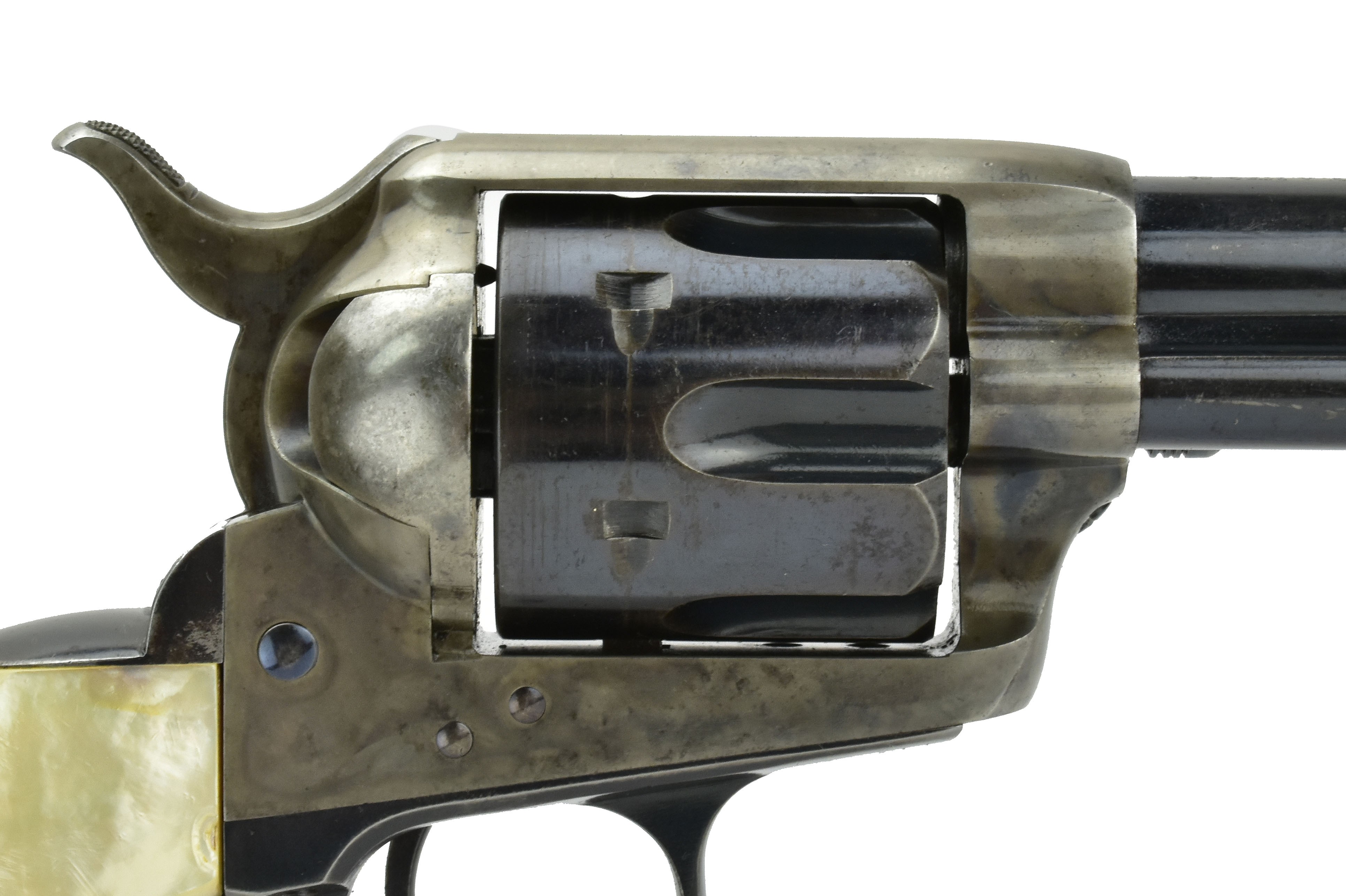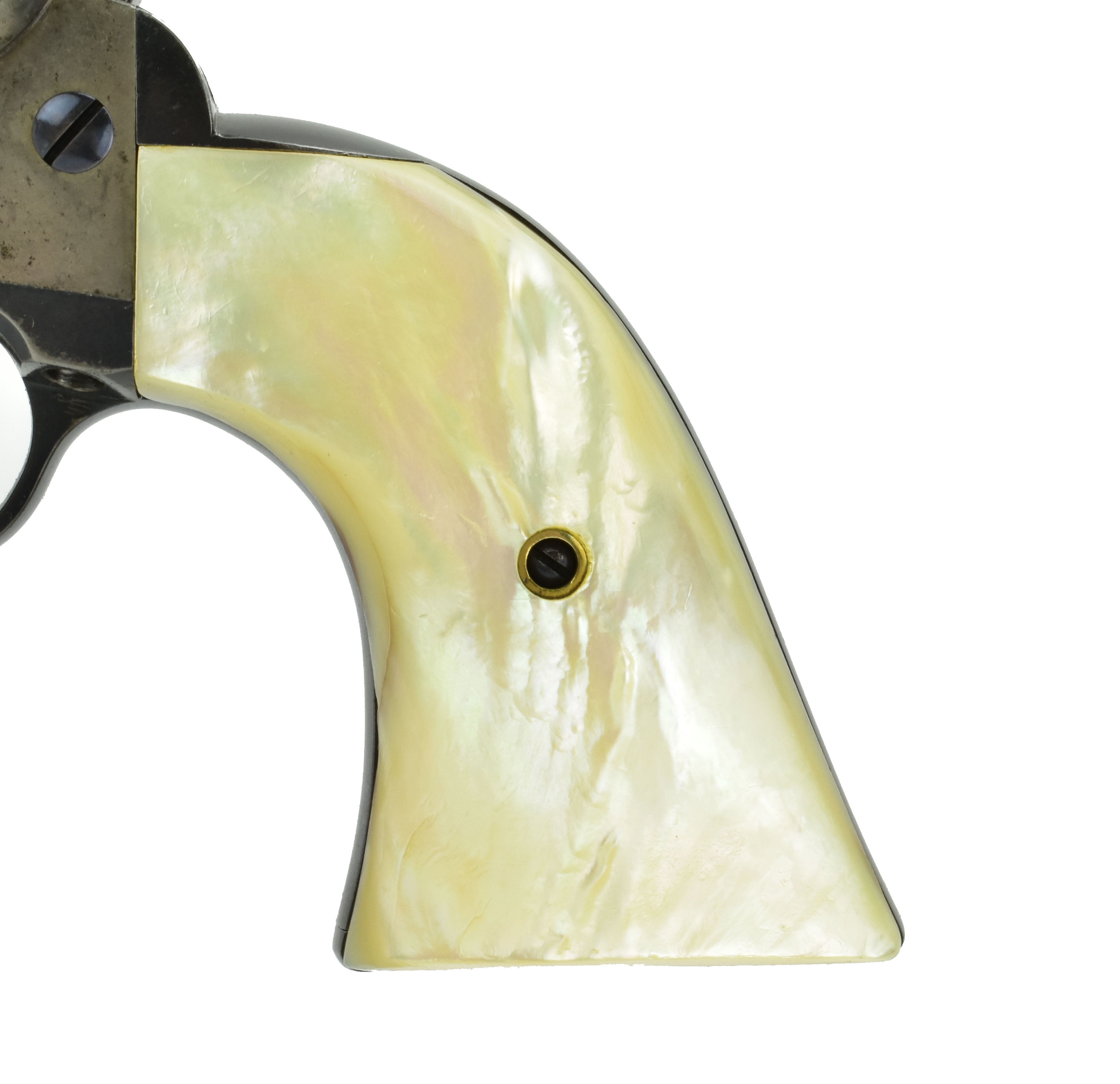 Colt Black Powder Single Action .41 caliber revolver. Manufactured approximately 1892. Beautiful condition for a black powder revolver. Excellent bore and action. Gun has approximately 92-93% of its original blue, 50% fading but visible case colors. Early thick pearl grips. A very fine single action.