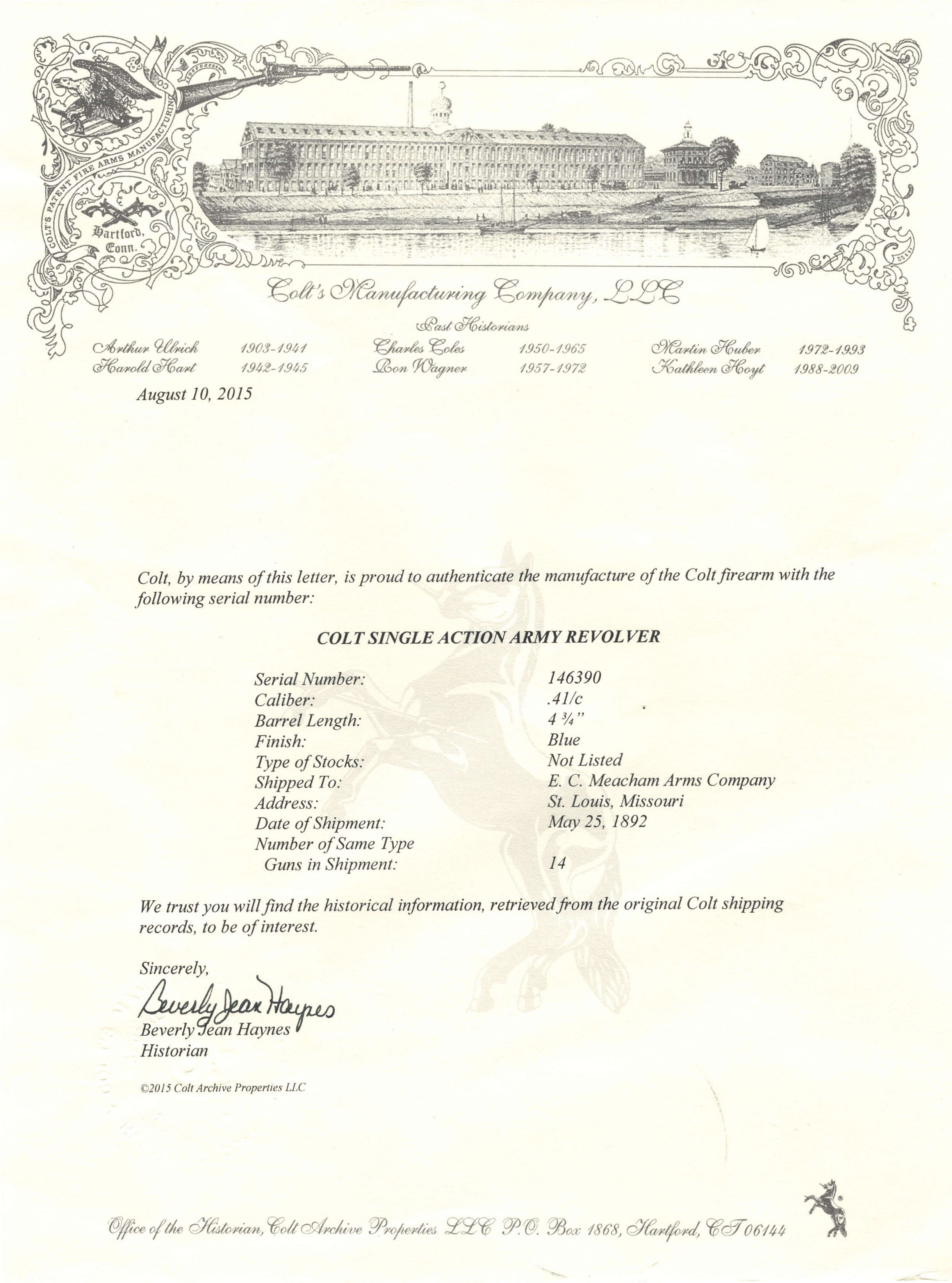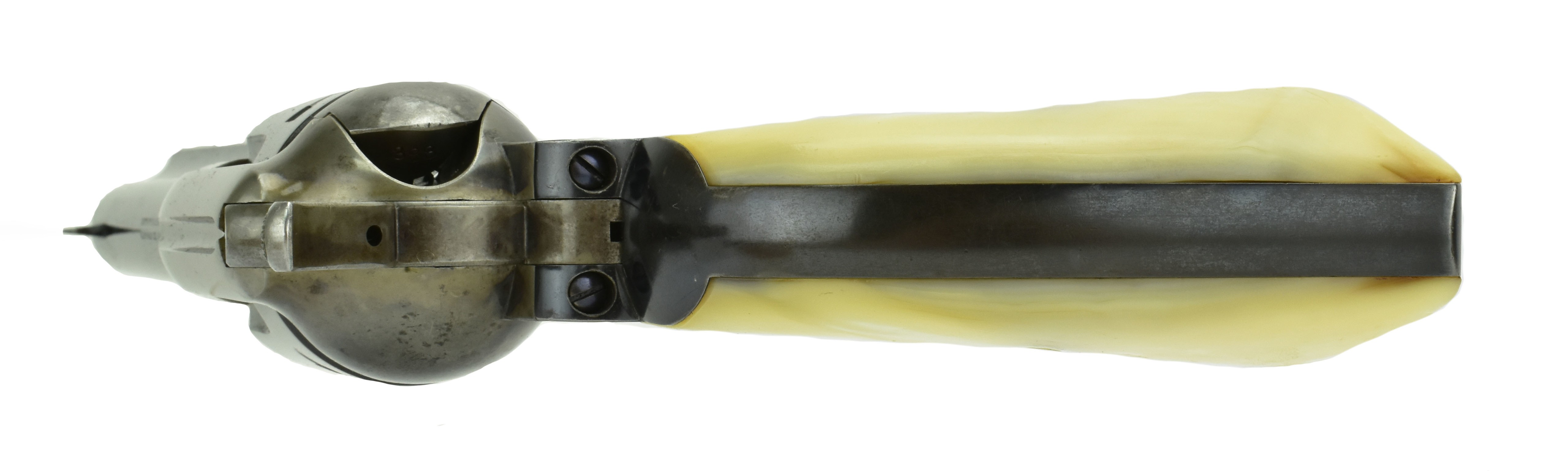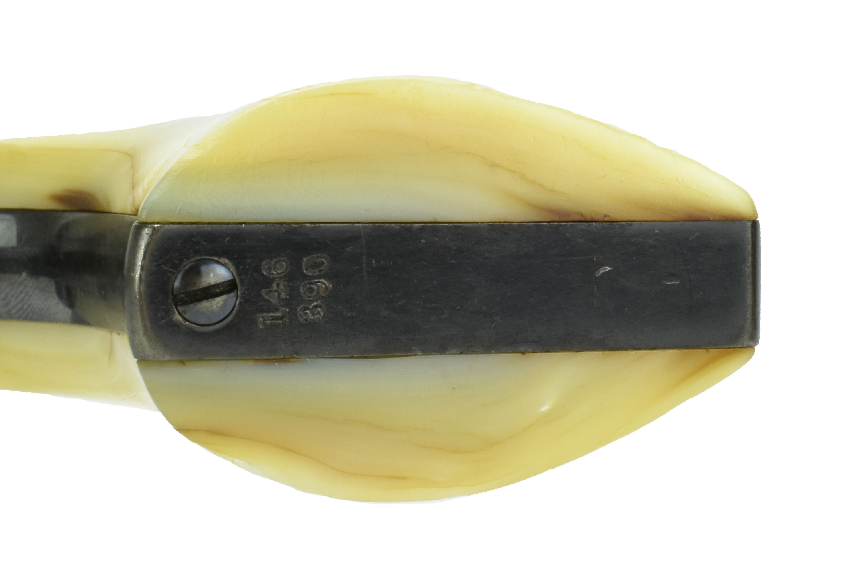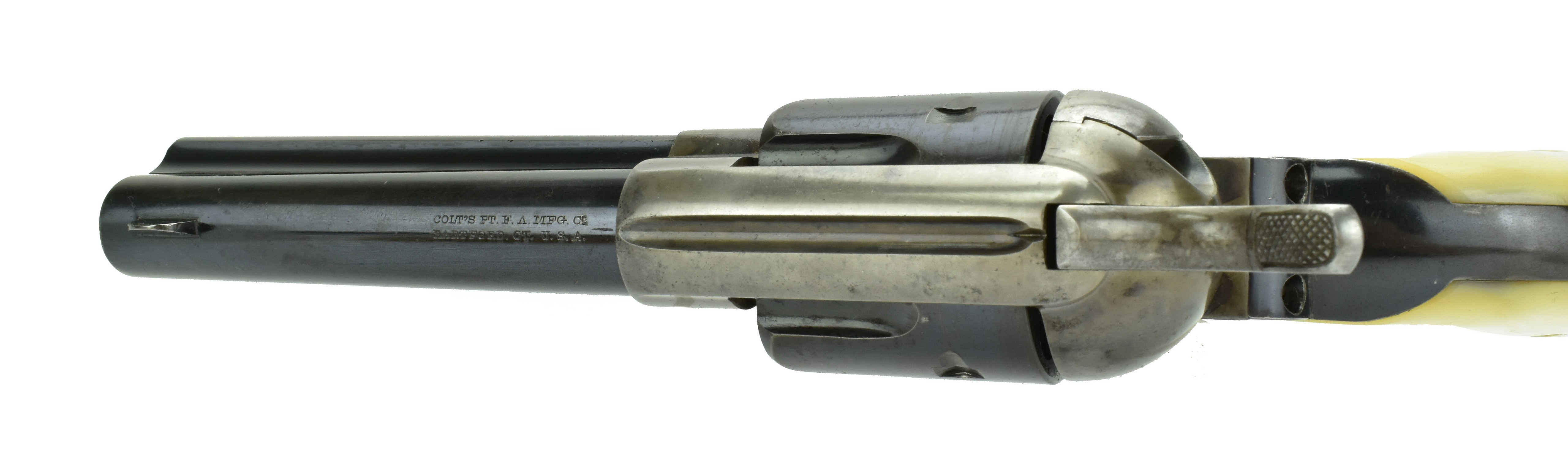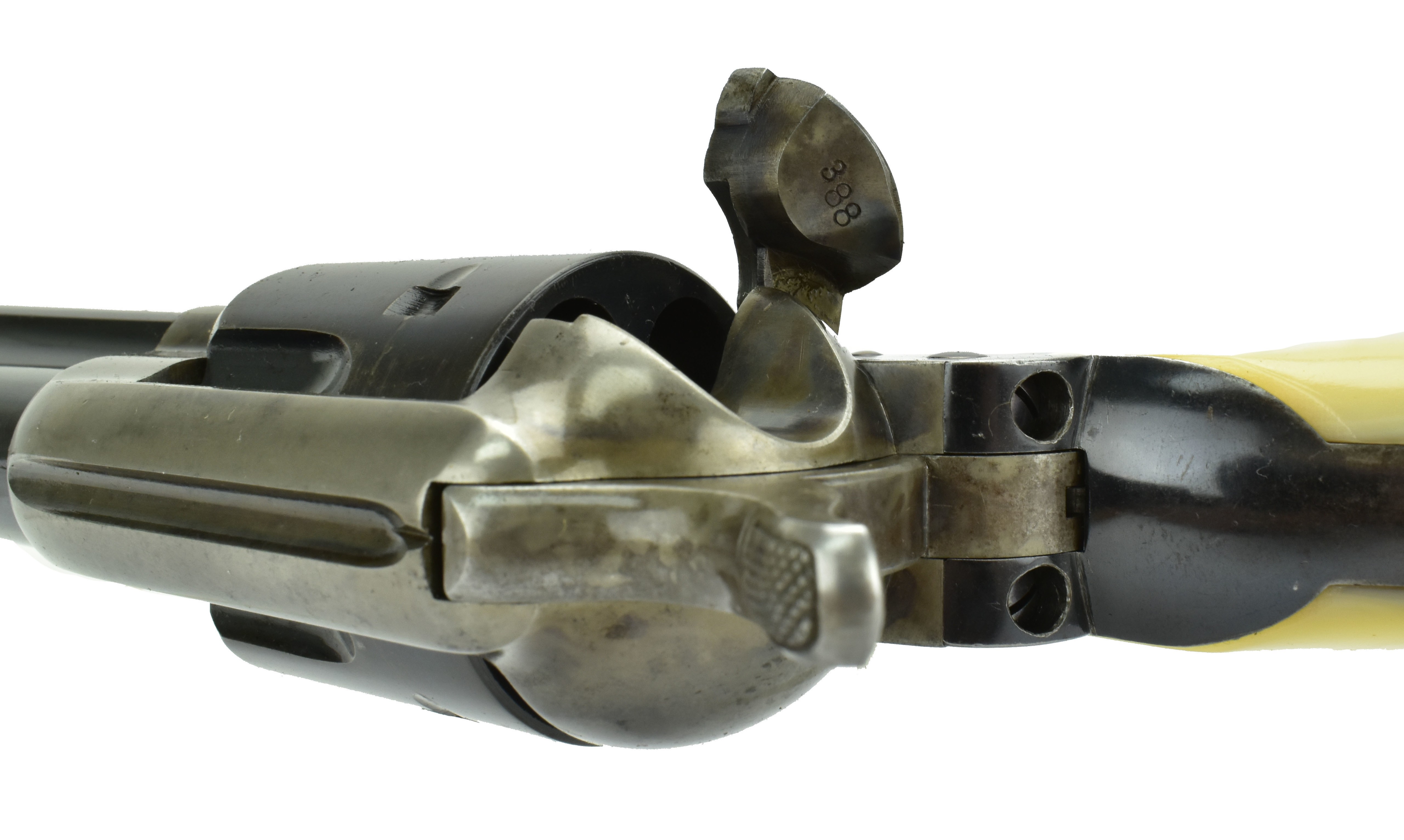 Colt Black Powder Single Action .41 caliber revolver. Manufactured approximately 1892. Beautiful condition for a black powder revolver. Excellent bore and action. Gun has approximately 92-93% of its original blue, 50% fading but visible case colors. Early thick pearl grips. A very fine single action.