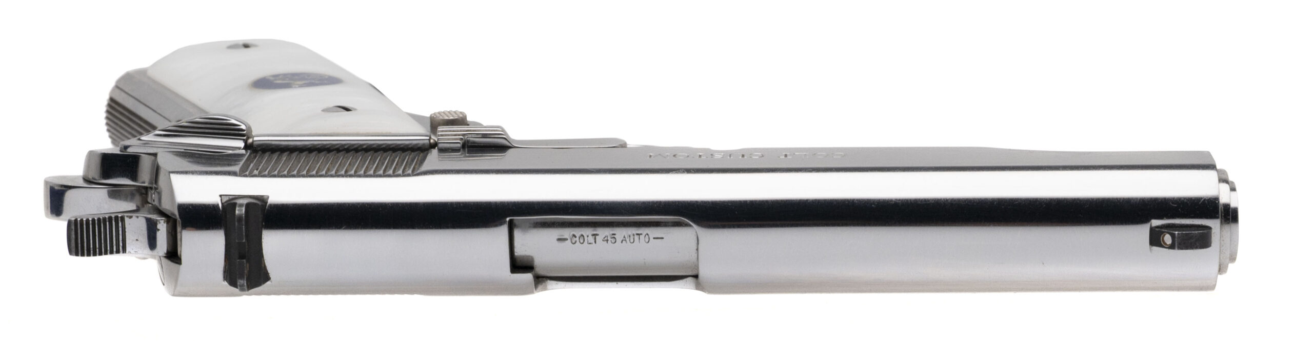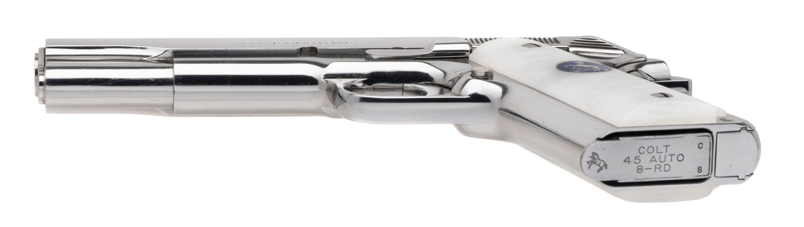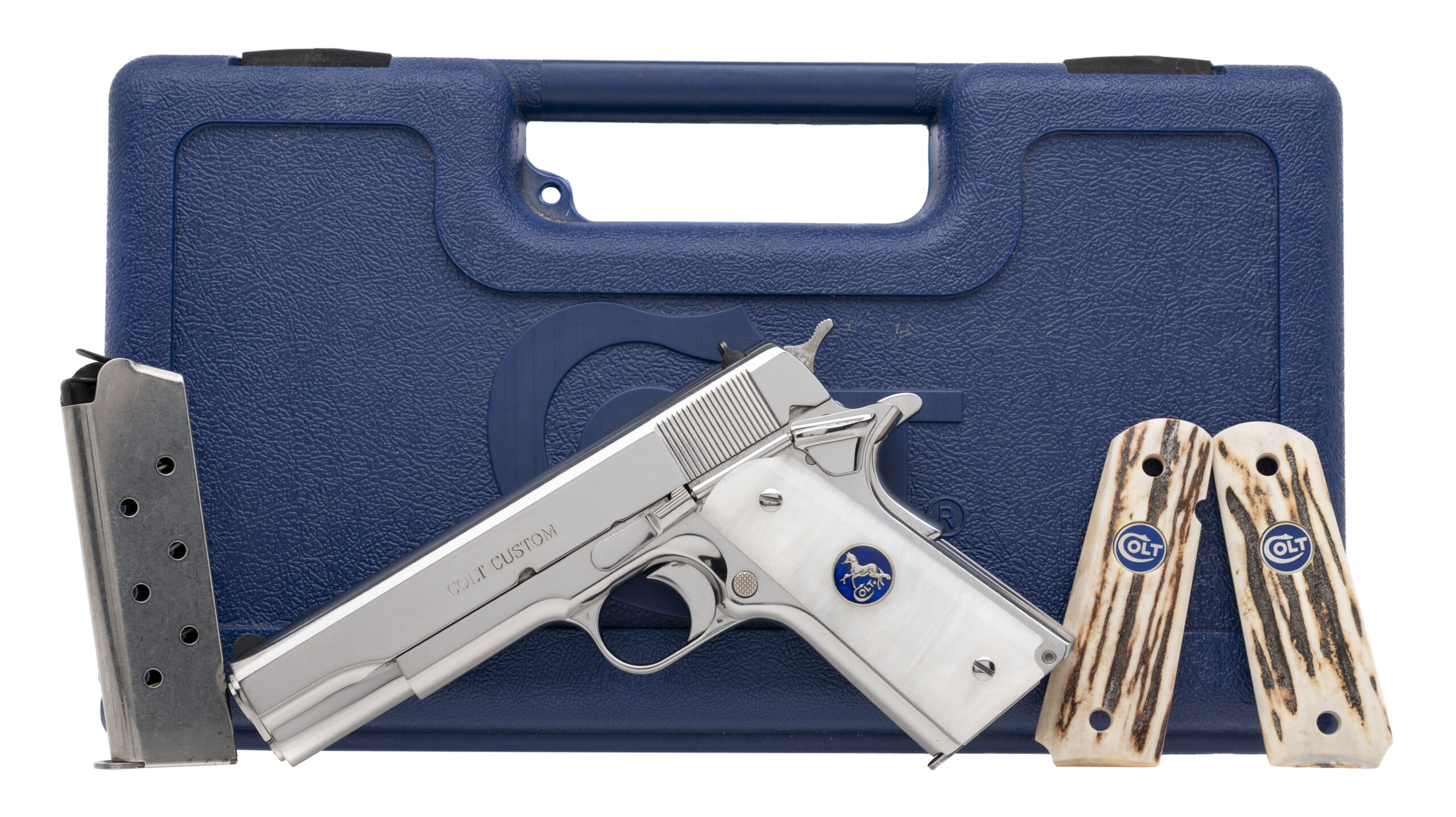 SN: CV48237. Modern production, .45 Auto with a 5" barrel. Bore is bright with strong rifling. Polished stainless steel Government 1911 pistol with fancy grips. Metal shows light marks but the overall condition is very good. Comes with case, Colt Stag grips, and an extra magazine.