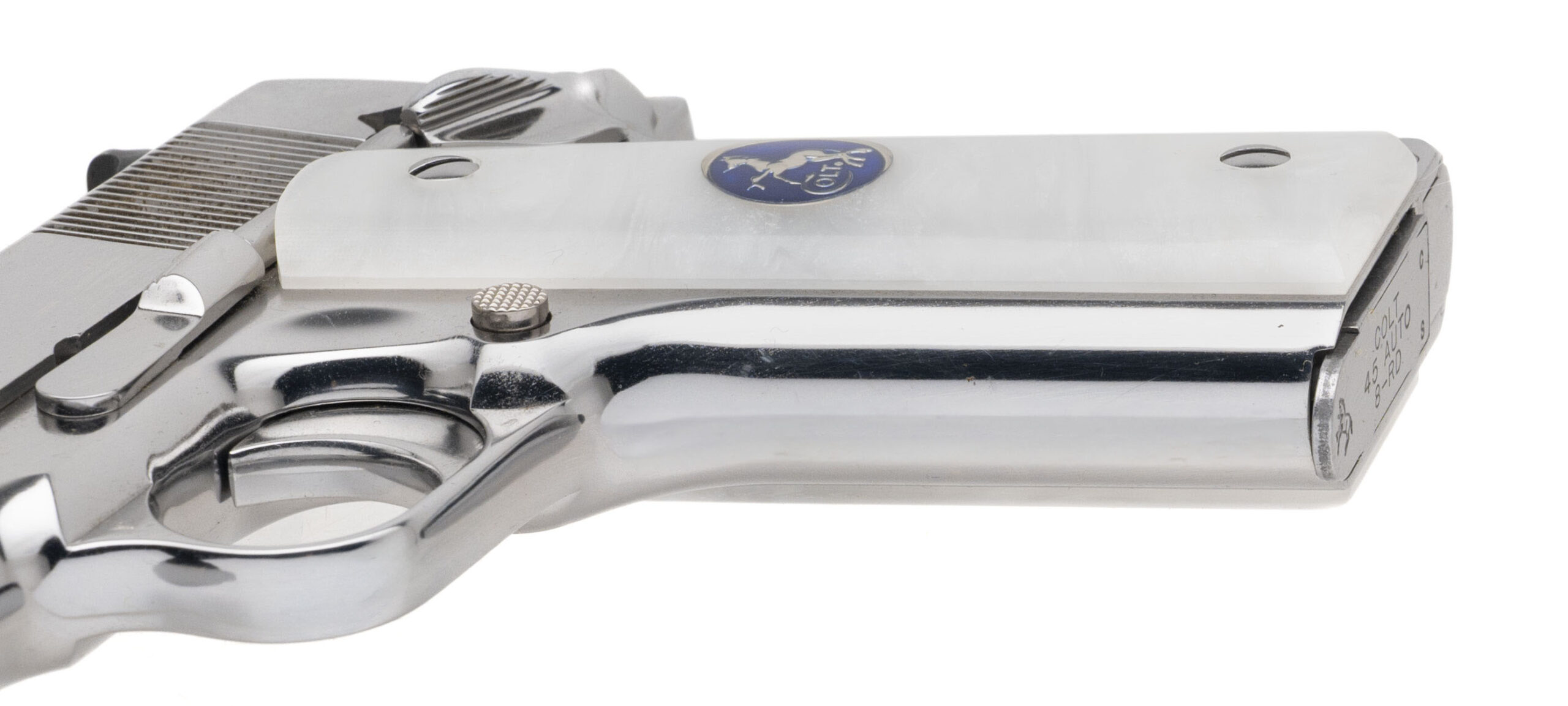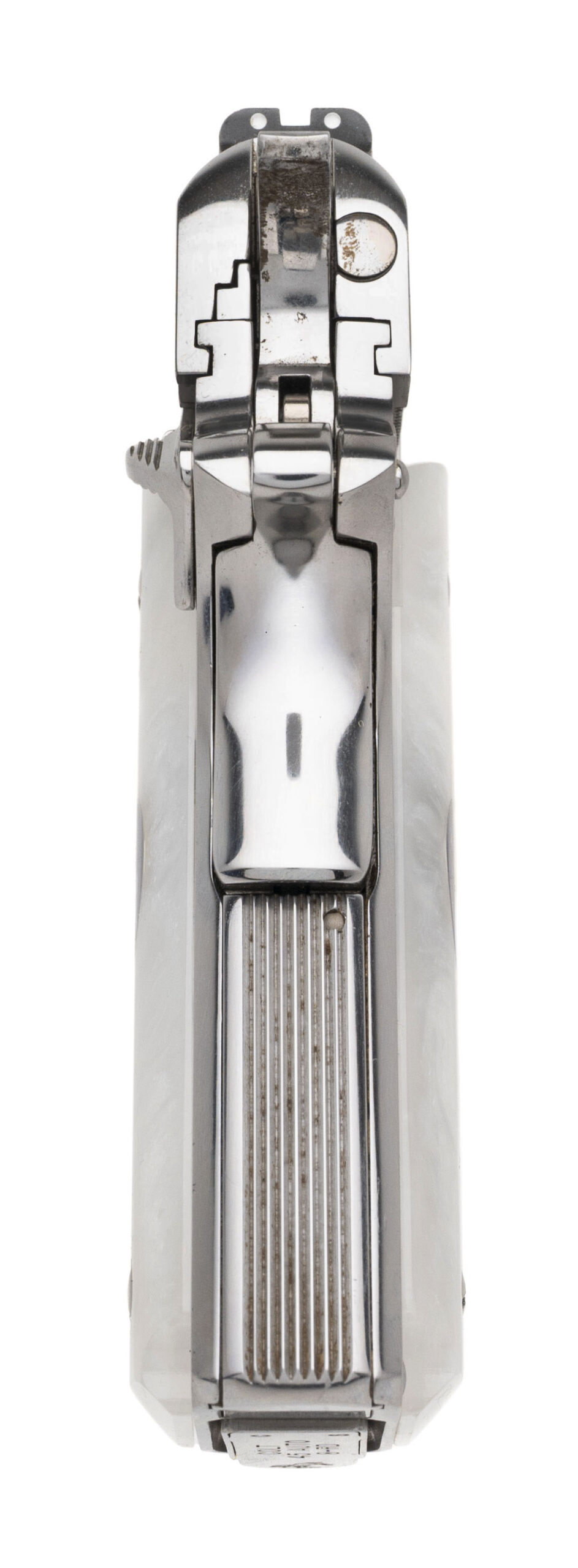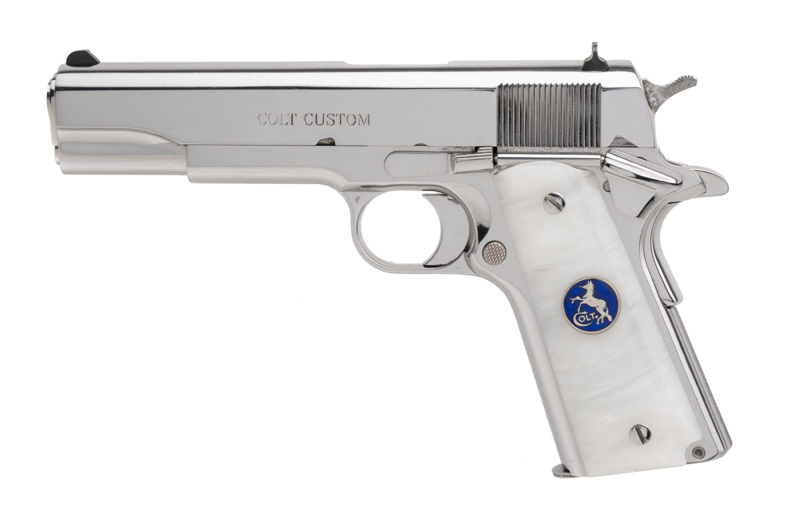 SN: CV48237. Modern production, .45 Auto with a 5" barrel. Bore is bright with strong rifling. Polished stainless steel Government 1911 pistol with fancy grips. Metal shows light marks but the overall condition is very good. Comes with case, Colt Stag grips, and an extra magazine.