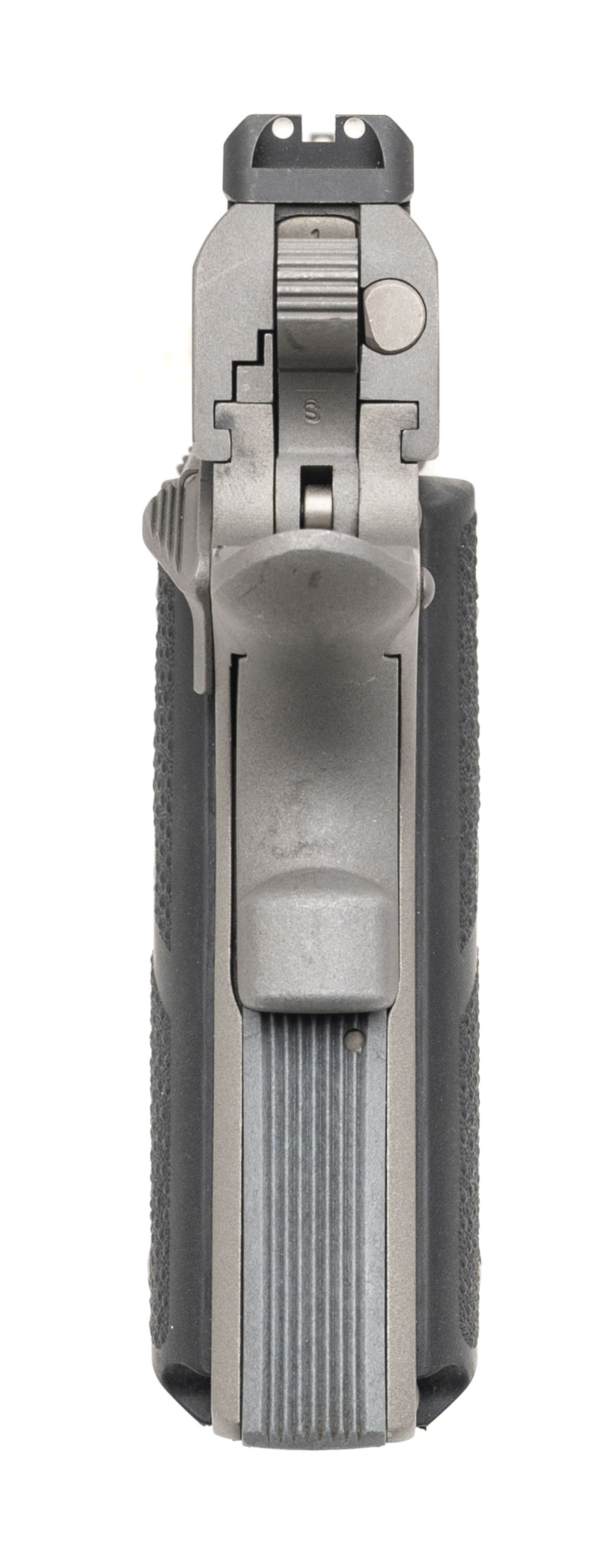 sn: DR61464 modern production officer size steinless steel 1911 with an aluminum frame, 3.25" barrel, 3 dot sights and wrap around Hogue rubber grips. Some handling marks on the finish, overall in very good condition.
