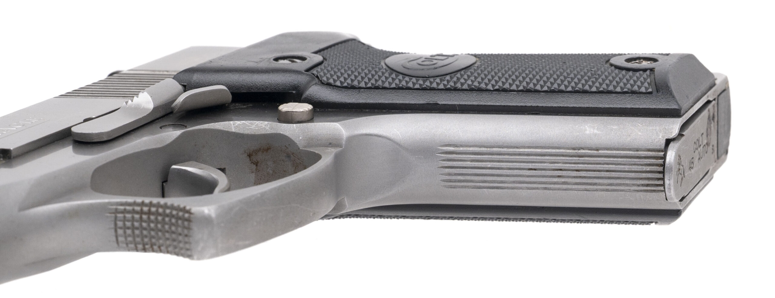 SN: DA12901. 1990 production, .45 Auto with a 5" barrel. Bore is bright with strong rifling. Scarce stainless steel double action pistol with decocker. Metal and plastic grips shows handling wear, but the overall condition good.