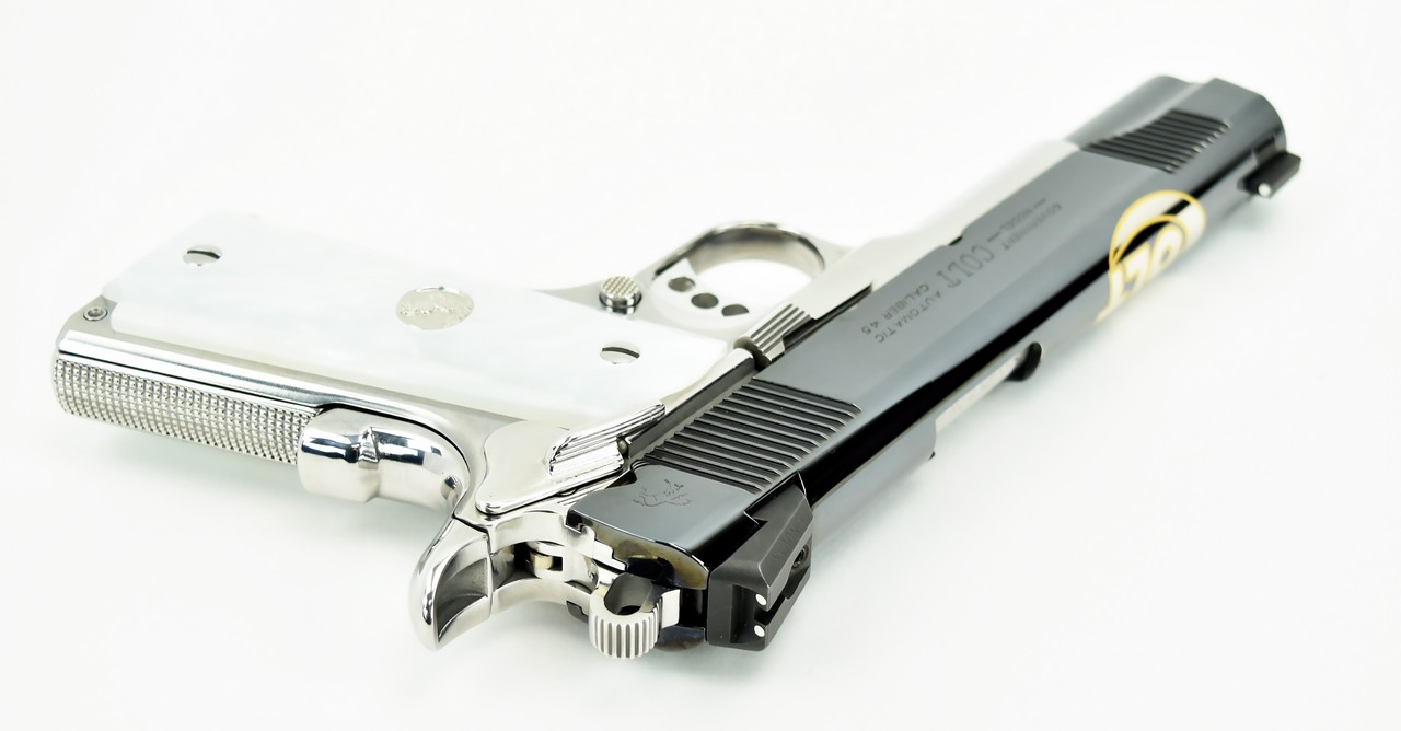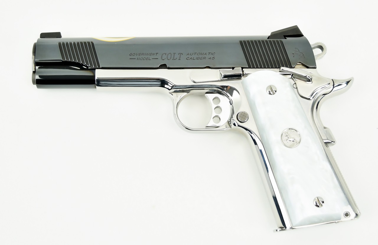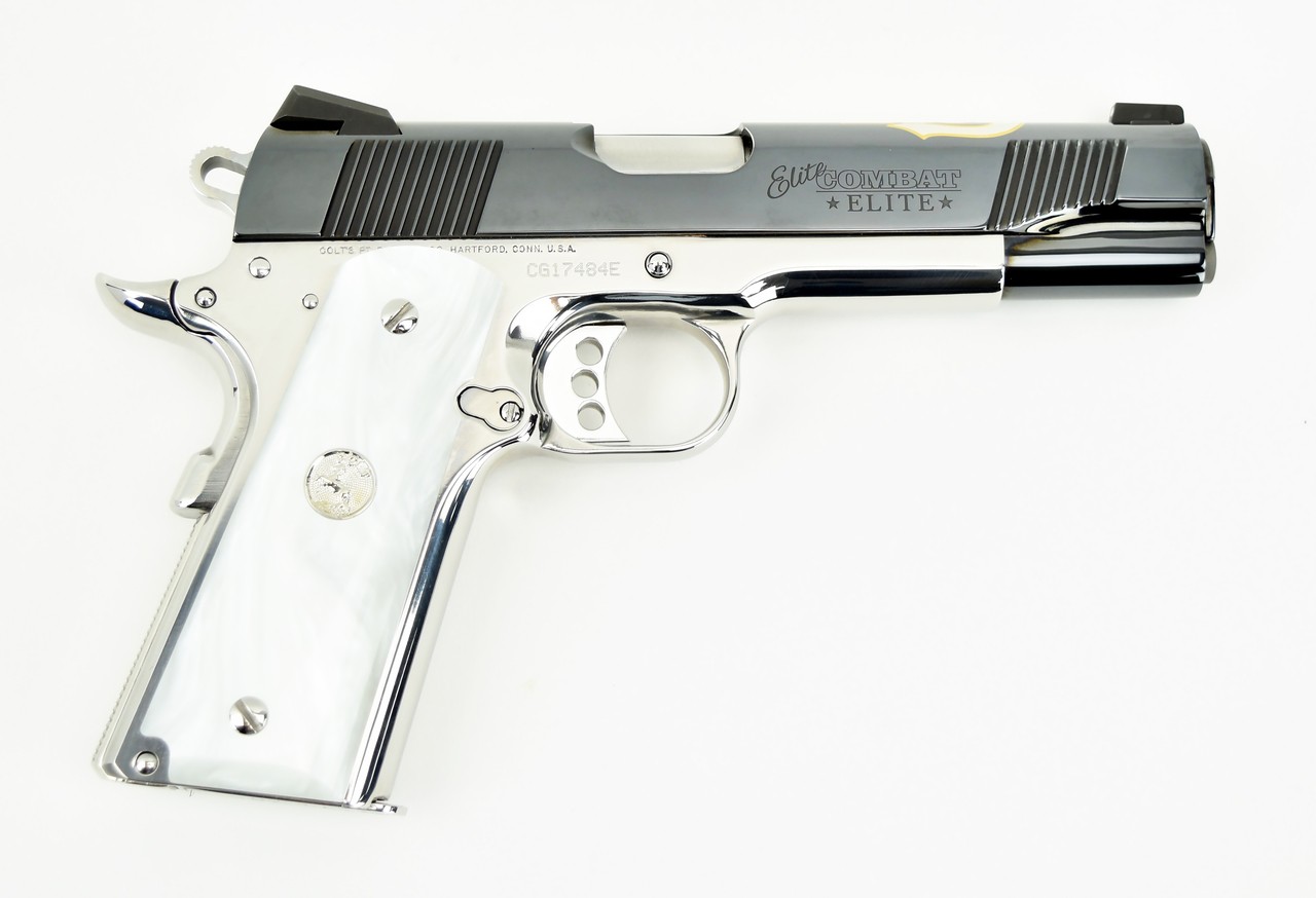 Colt Elite Combat Elite .45 ACP caliber pistol. Special edition with high polish blue slide and high polish stainless frame. Has silver and gold “Colt” logo on the slide, and fancy grips. A beautiful piece. New
