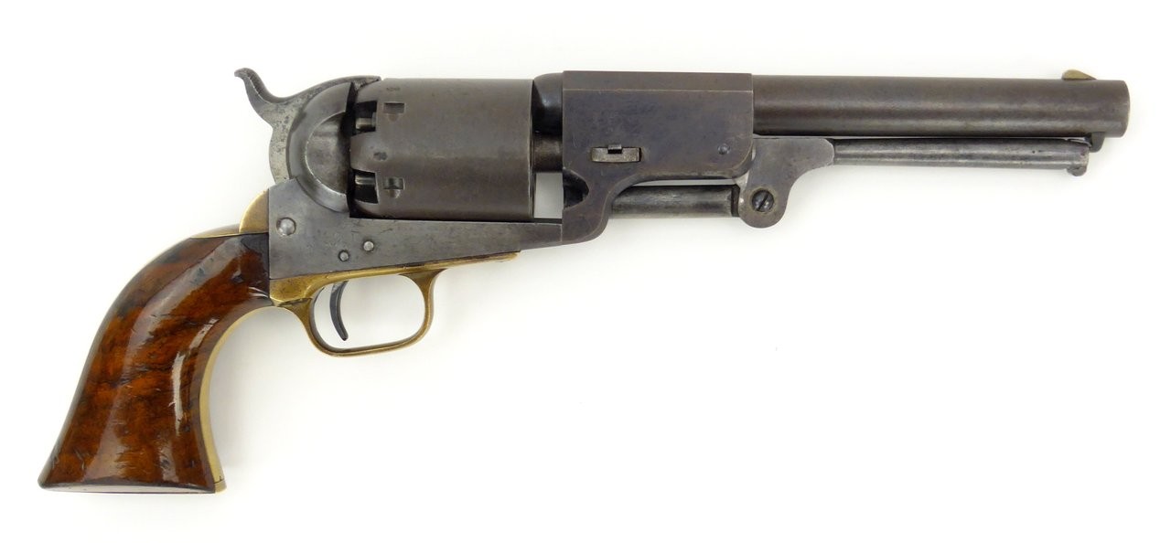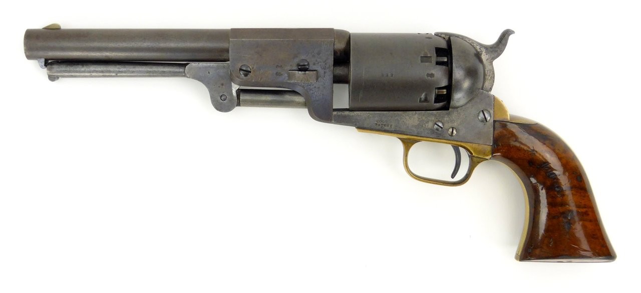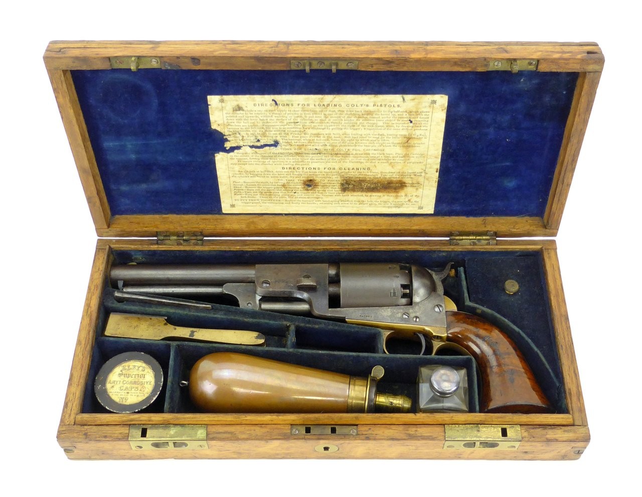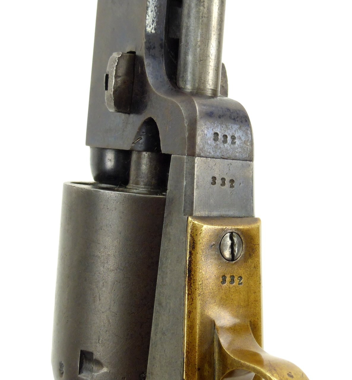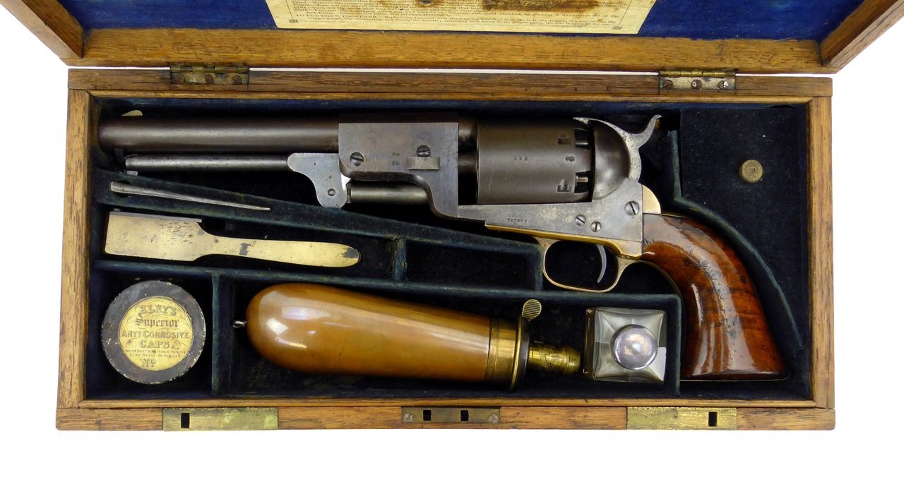 Colt English Cased 3rd Model Dragoon. Serial # 332 with New York address and British proofs; all matching serial numbers. The bore is excellent and the action works perfectly. Gun has approximately 20-25% blue and traces of case colors. Grips have deluxe wood and 95% varnish. Gun has approximately 70% visible cylinder scene. This is a very fine Dragoon that shows little wear. Screws are excellent. Bottom of butt has a repair spot where there was a lanyard ring stud. Case is the correct English Dragoon case with all correct accessories. Very fine outfit!
