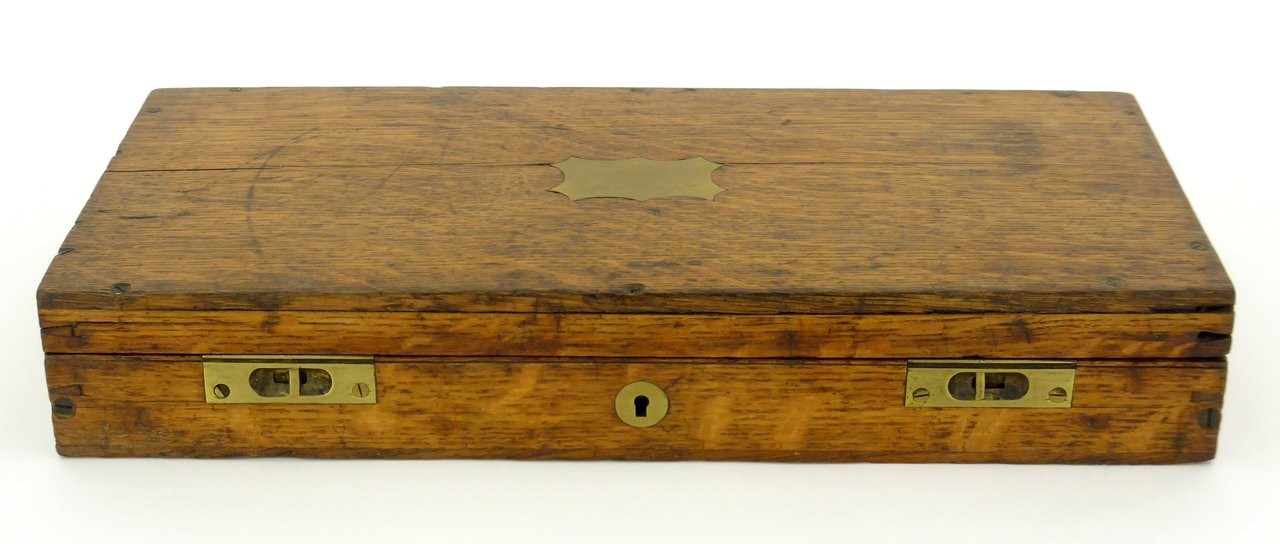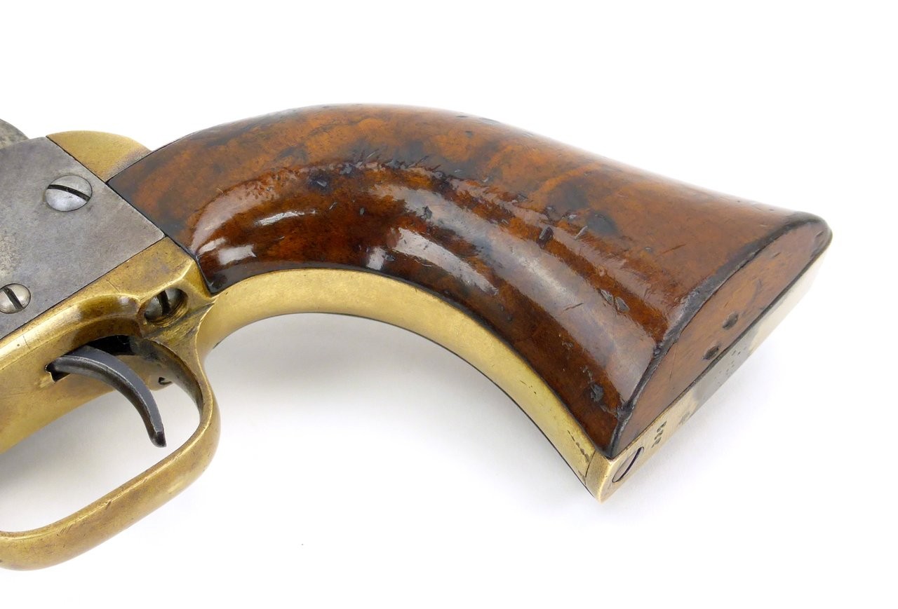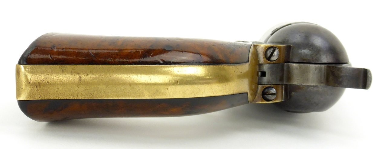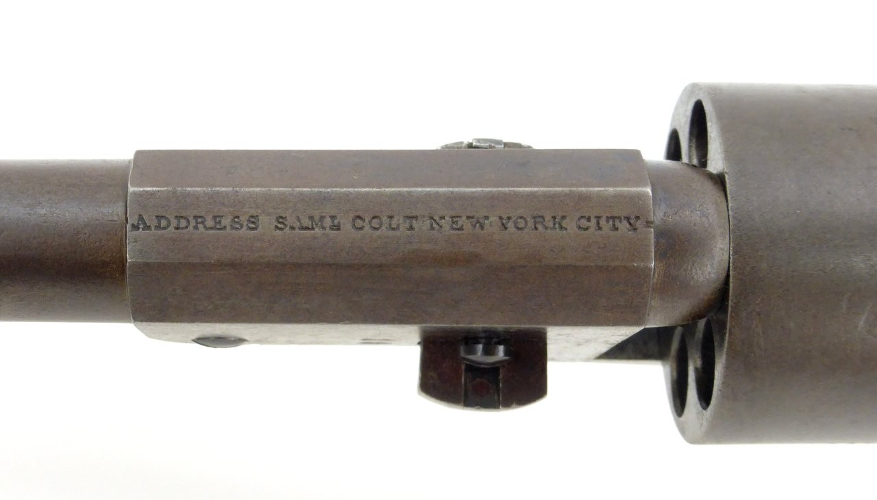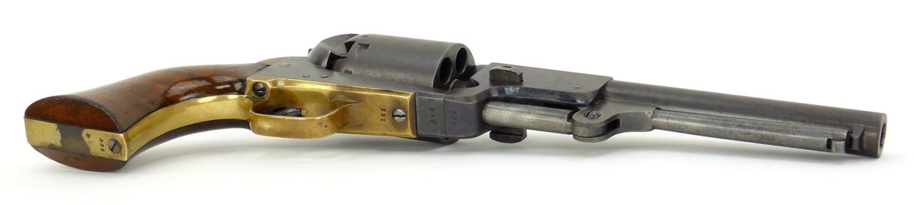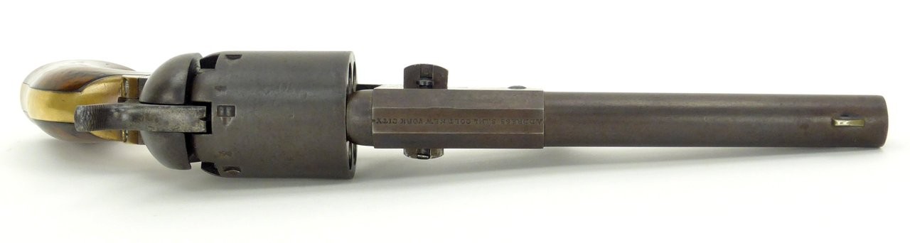 Colt English Cased 3rd Model Dragoon. Serial # 332 with New York address and British proofs; all matching serial numbers. The bore is excellent and the action works perfectly. Gun has approximately 20-25% blue and traces of case colors. Grips have deluxe wood and 95% varnish. Gun has approximately 70% visible cylinder scene. This is a very fine Dragoon that shows little wear. Screws are excellent. Bottom of butt has a repair spot where there was a lanyard ring stud. Case is the correct English Dragoon case with all correct accessories. Very fine outfit!