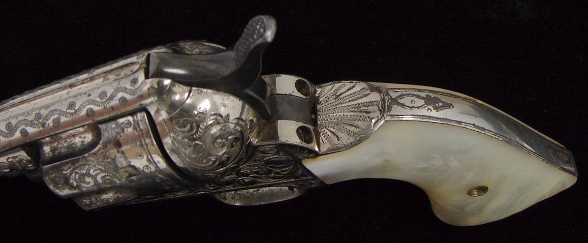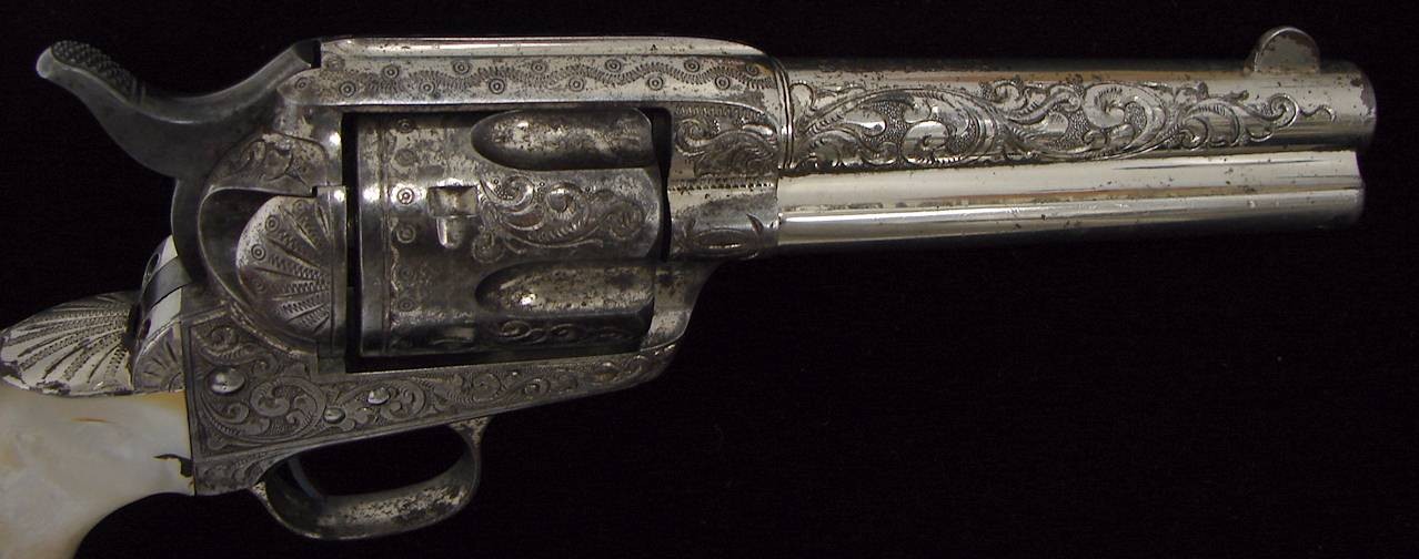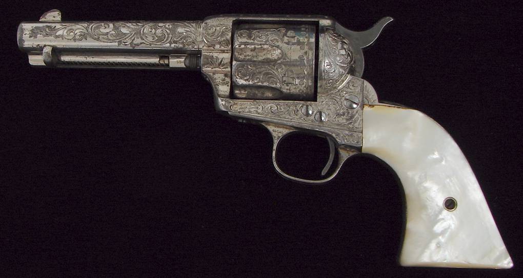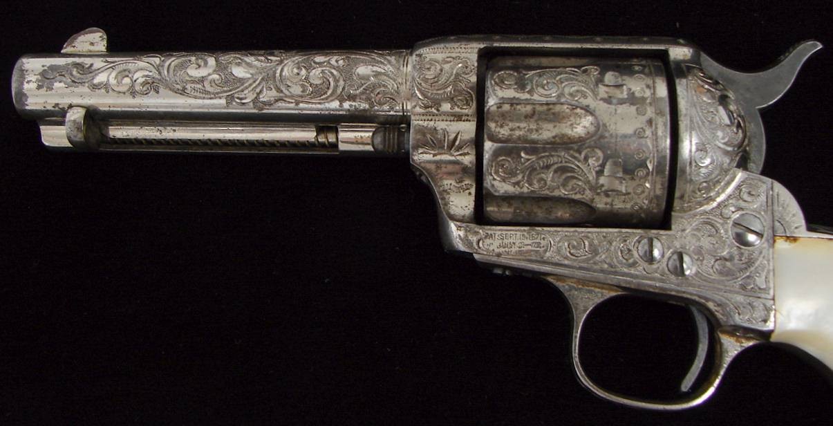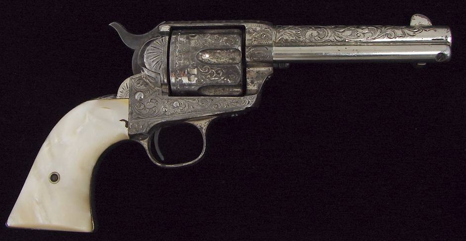 Colt Engraved Black Powder Single Action .45 caliber revolver with factory letter. Shipped to Hartley and Graham in 1887. Gun has pearl grips and 90-93% original nickel.