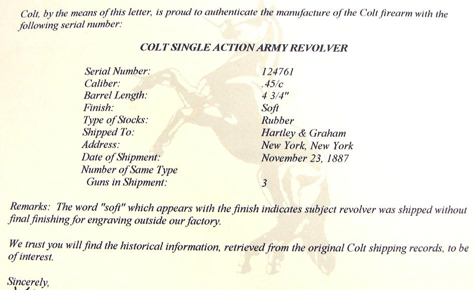 Colt Engraved Black Powder Single Action .45 caliber revolver with factory letter. Shipped to Hartley and Graham in 1887. Gun ha (c6582)