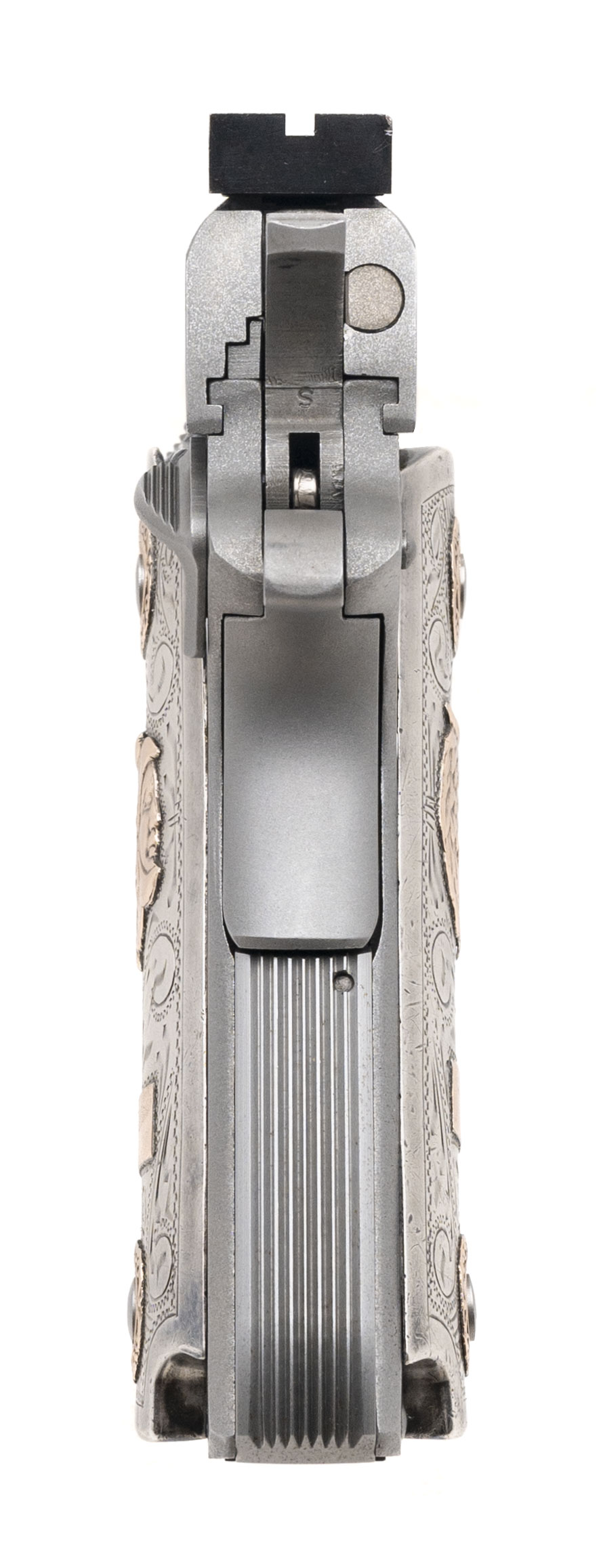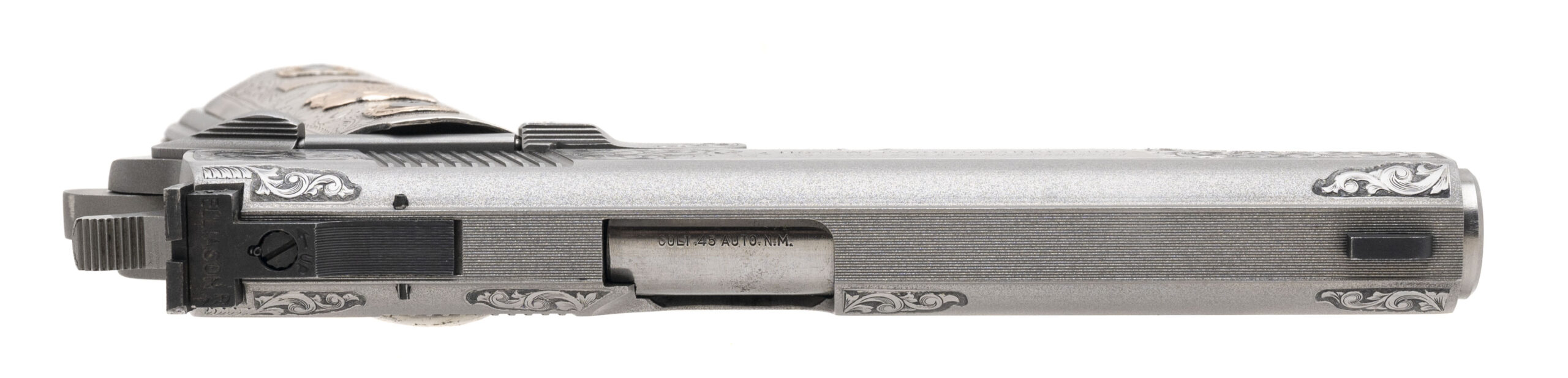 SN: SN15170. Made in 1988, .45 Auto with a 5" barrel. Bore is bright with strong rifling. Stainless steel Series 80 Gold Cup 1911, engraved and signed by Master Engraver J.R. French. Has authentic old Mexican silver and gold grips. Overall very good condition.
