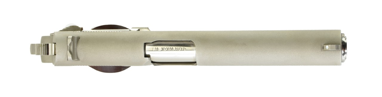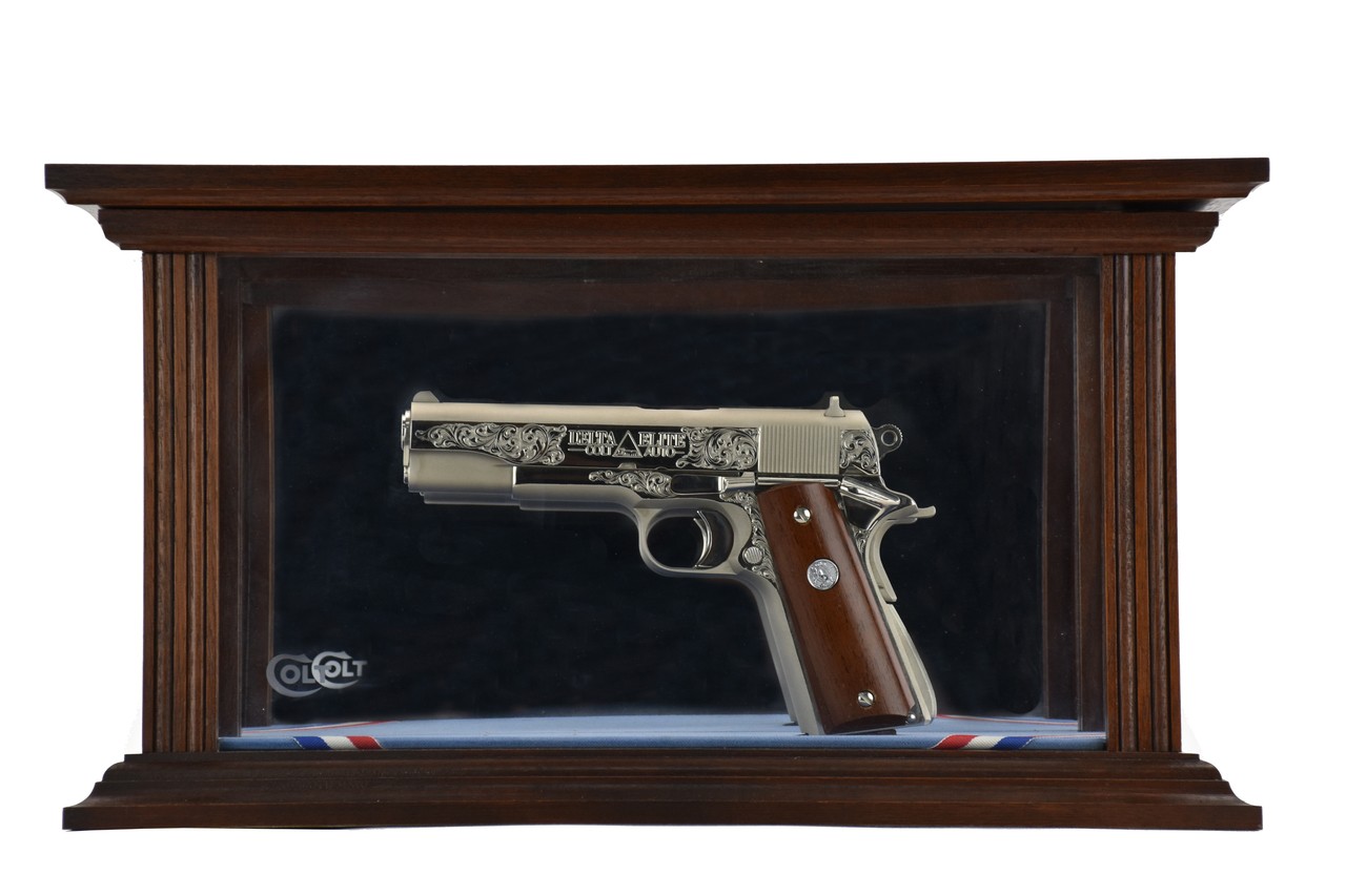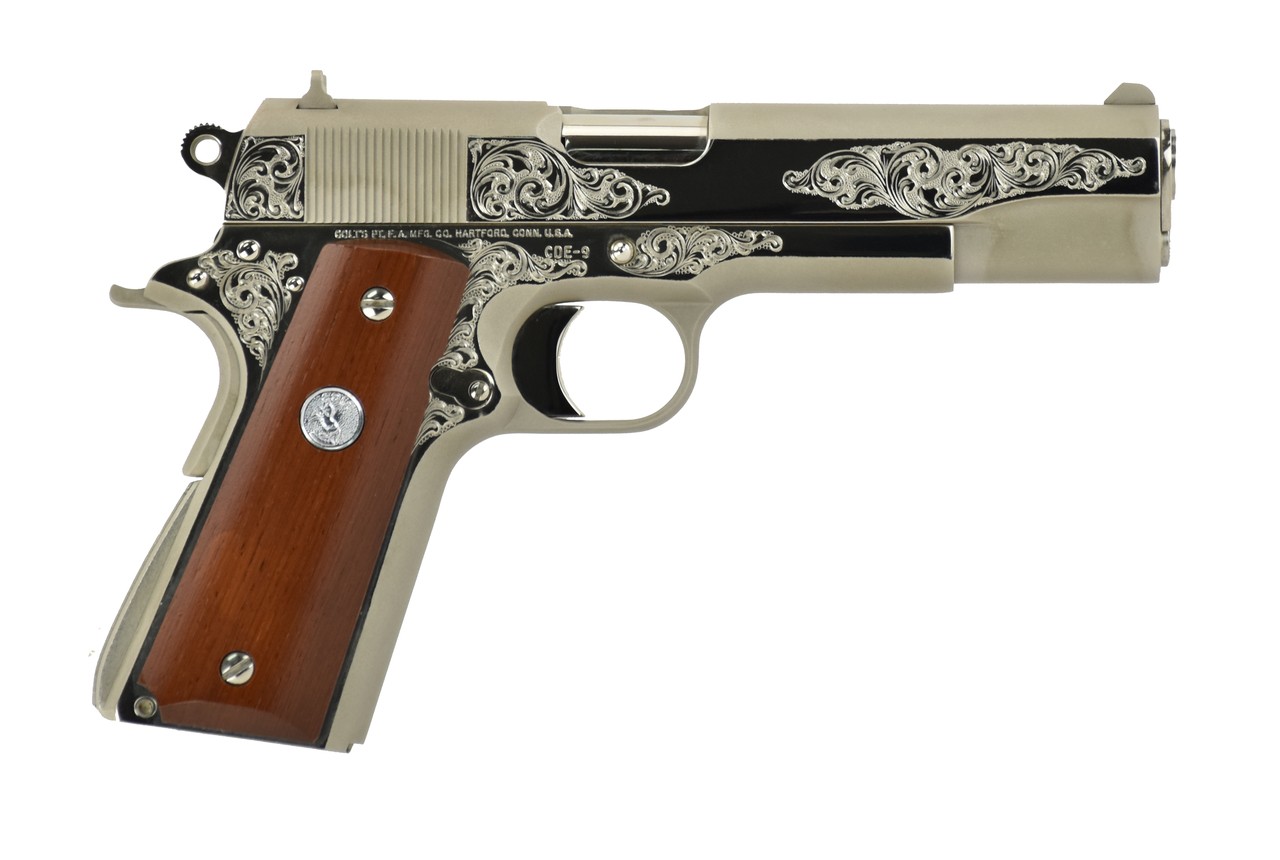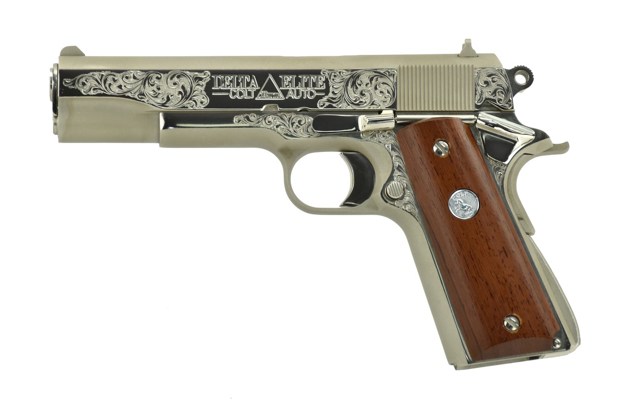 Colt Factory Engraved Delta Elite 10mm Pistol. Outstanding and rare factory engraved and nickel plated Delta Elite pistol. Has “B” grade engraving, bright nickel finish, and smooth walnut grips, in a custom serial number range. Comes with a factory letter confirming the details and originality of the gun. A fancy upright glass-sided presentation case displays the gun in all its glory. A beautiful and exciting pistol for the collector of Colt autos.
