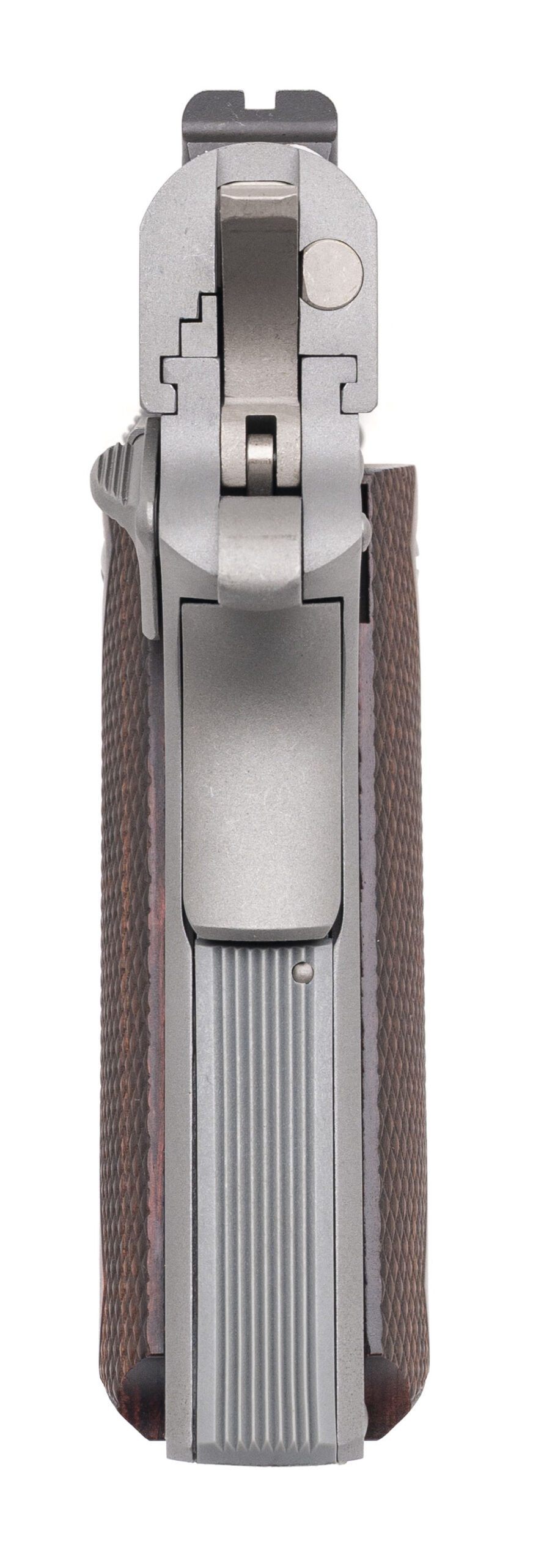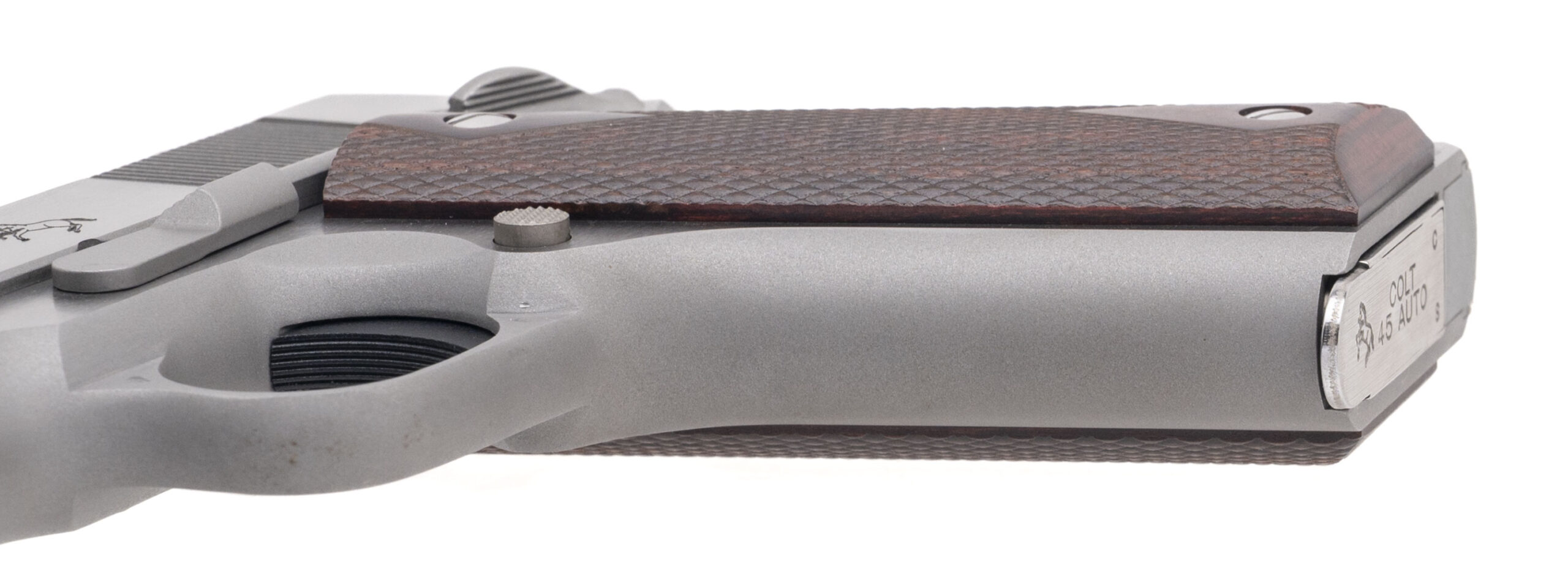 SN: GV067858. Modern production, .45 ACP with a 5" barrel. Bore is very good. Government size stainless steel frame 1911 pistol with a manual thumb-safety, spurred hammer, and checkered wood grips. Overall condition is excellent. Includes original case.