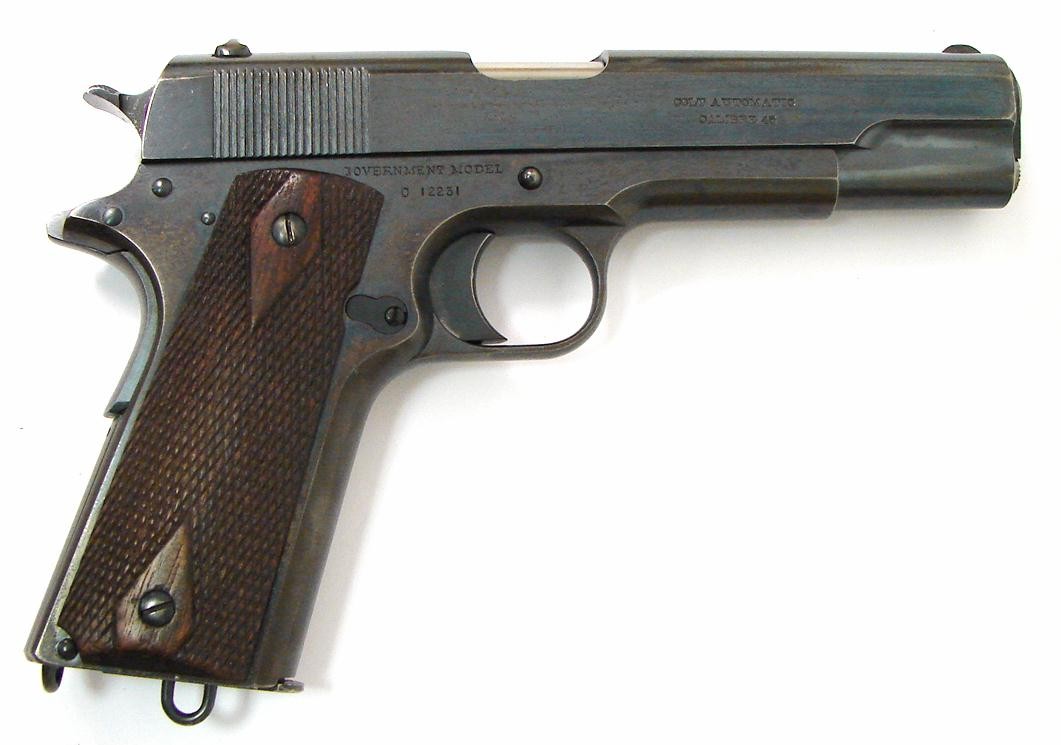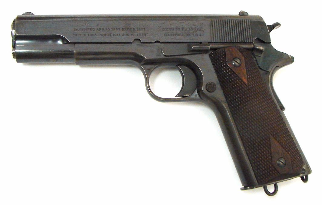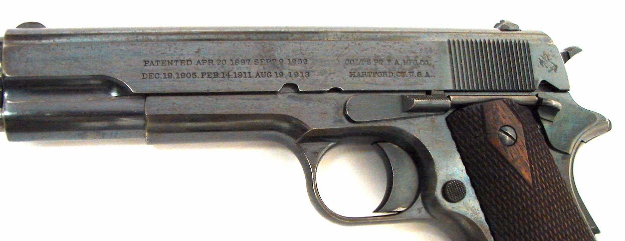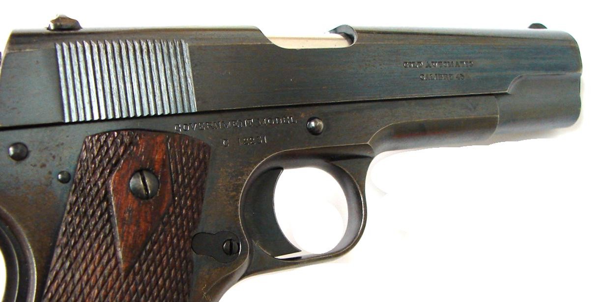 Colt Government .45 ACP caliber pistol. Colt 1911 Commercial, manufactured 1914. Very good plus bore. Note: barrel is a WWII Military barrel. 93-94% bright original Blue. Very good grips with fine checkering. Very fine early commercial!
