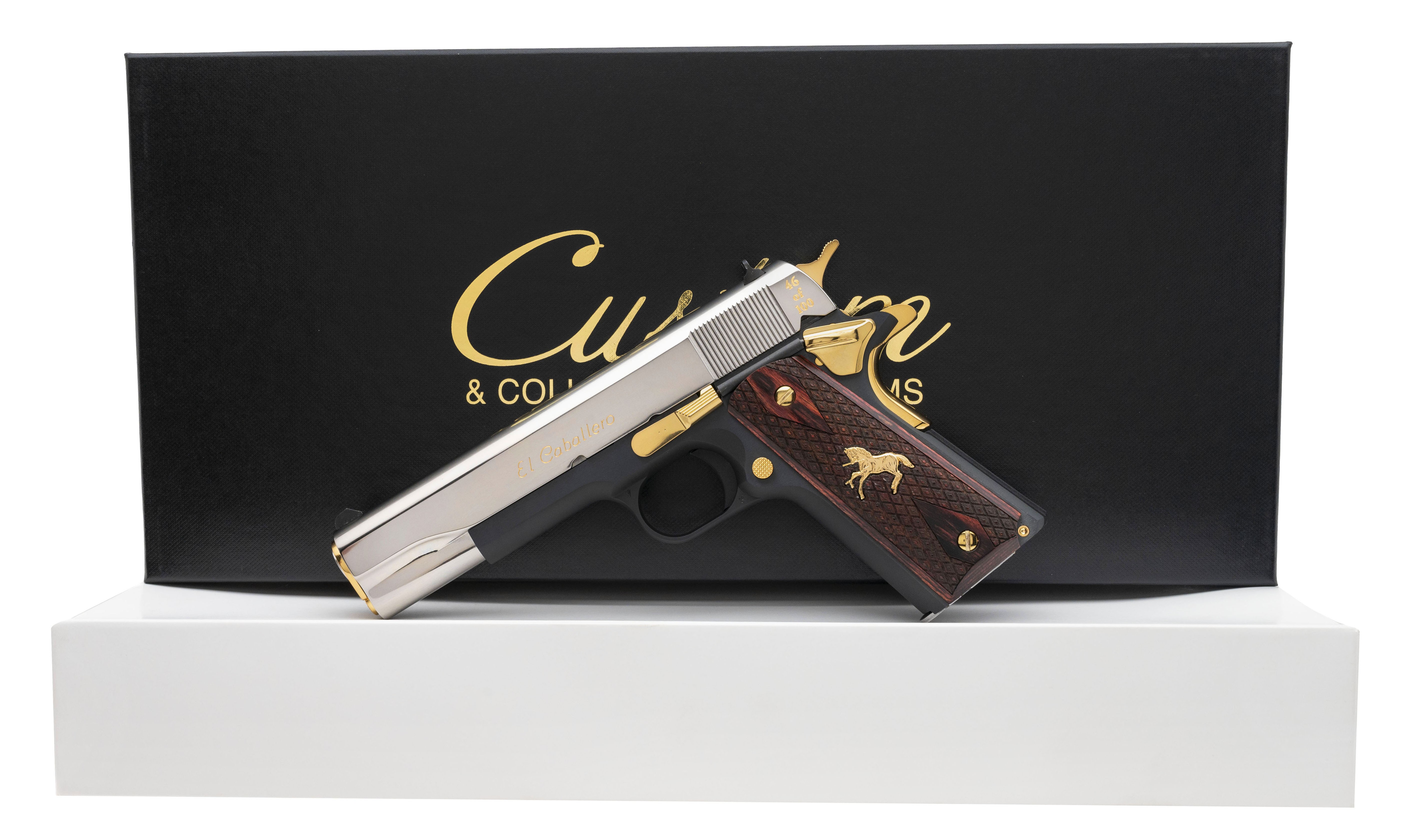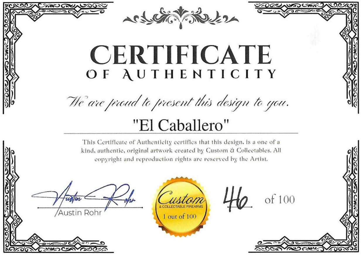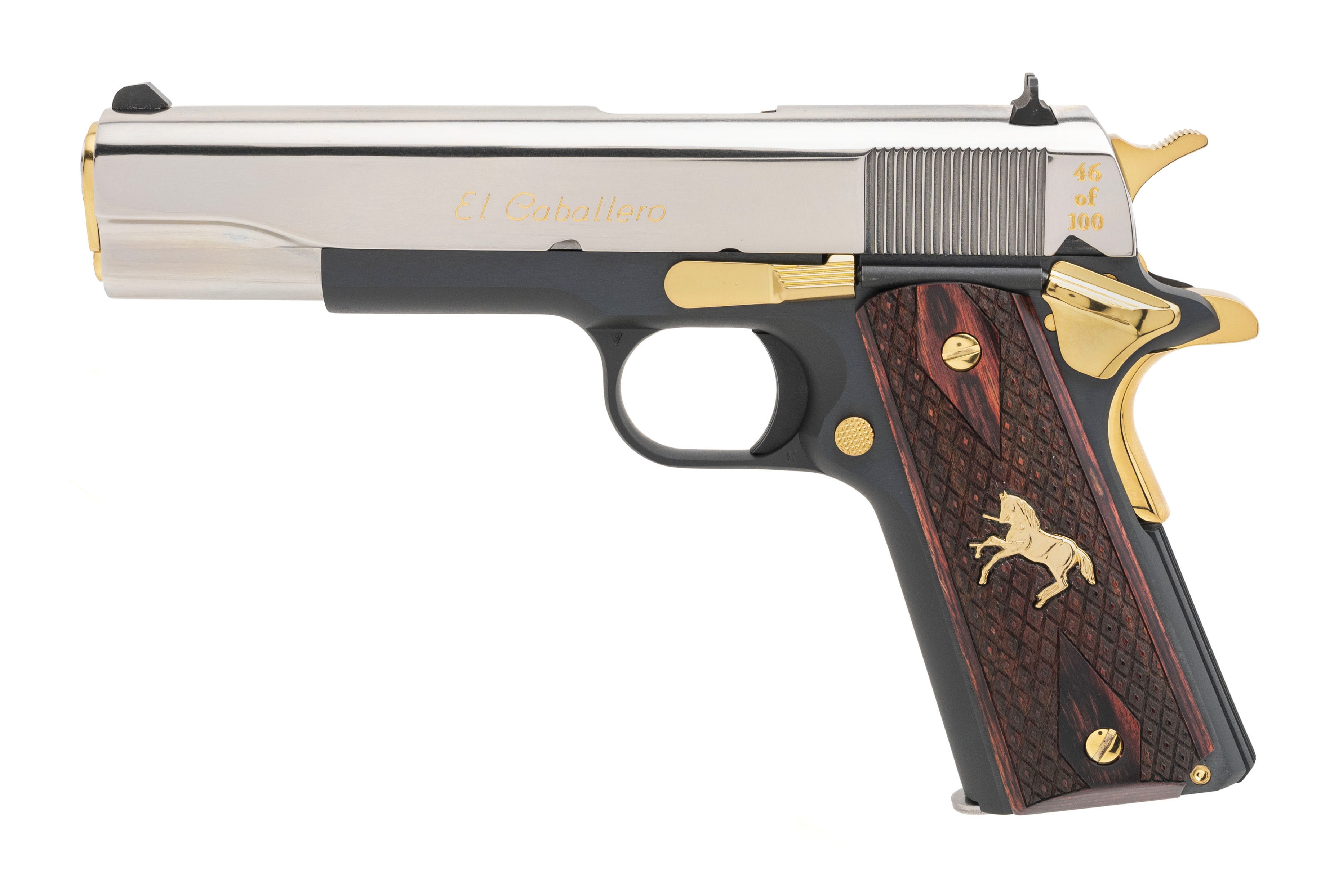 CNC Custom El Caballero 1911 in .38 Super with a 5" barrel. Pistol is 1 of 100 (#46). High polish stainless steel slide with blue frame and 24KT gold inlay paired with rosewood grips with Colt pony. NEW. UPC: CNC1911ELCAB