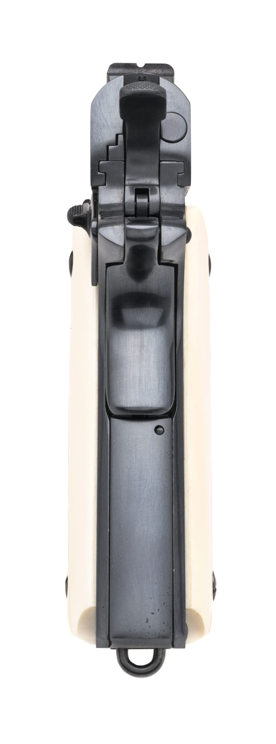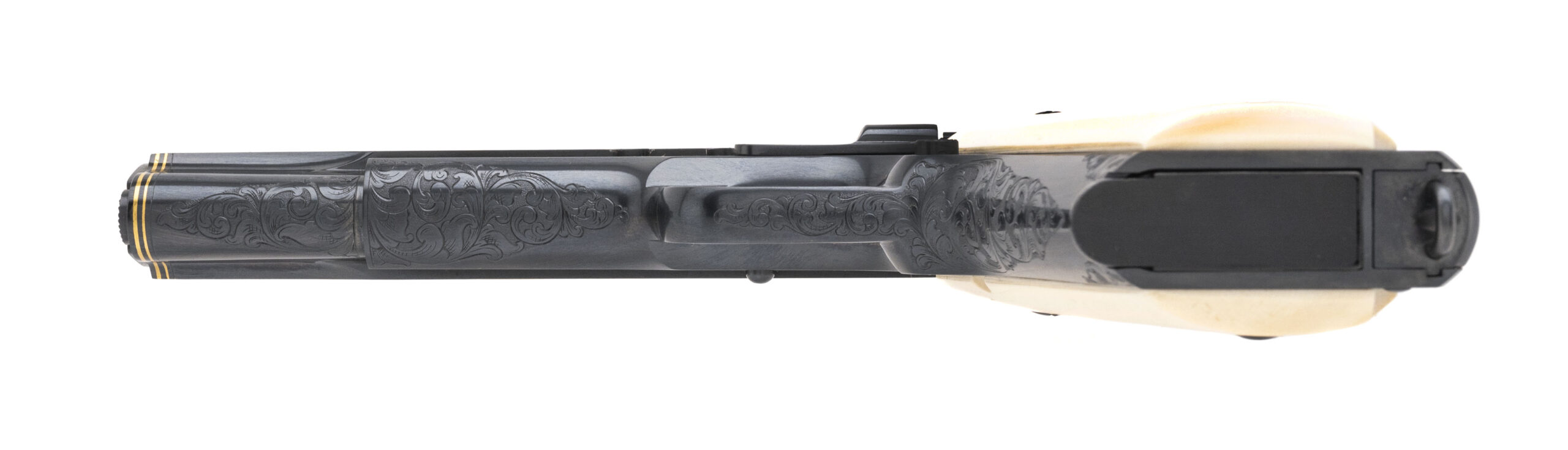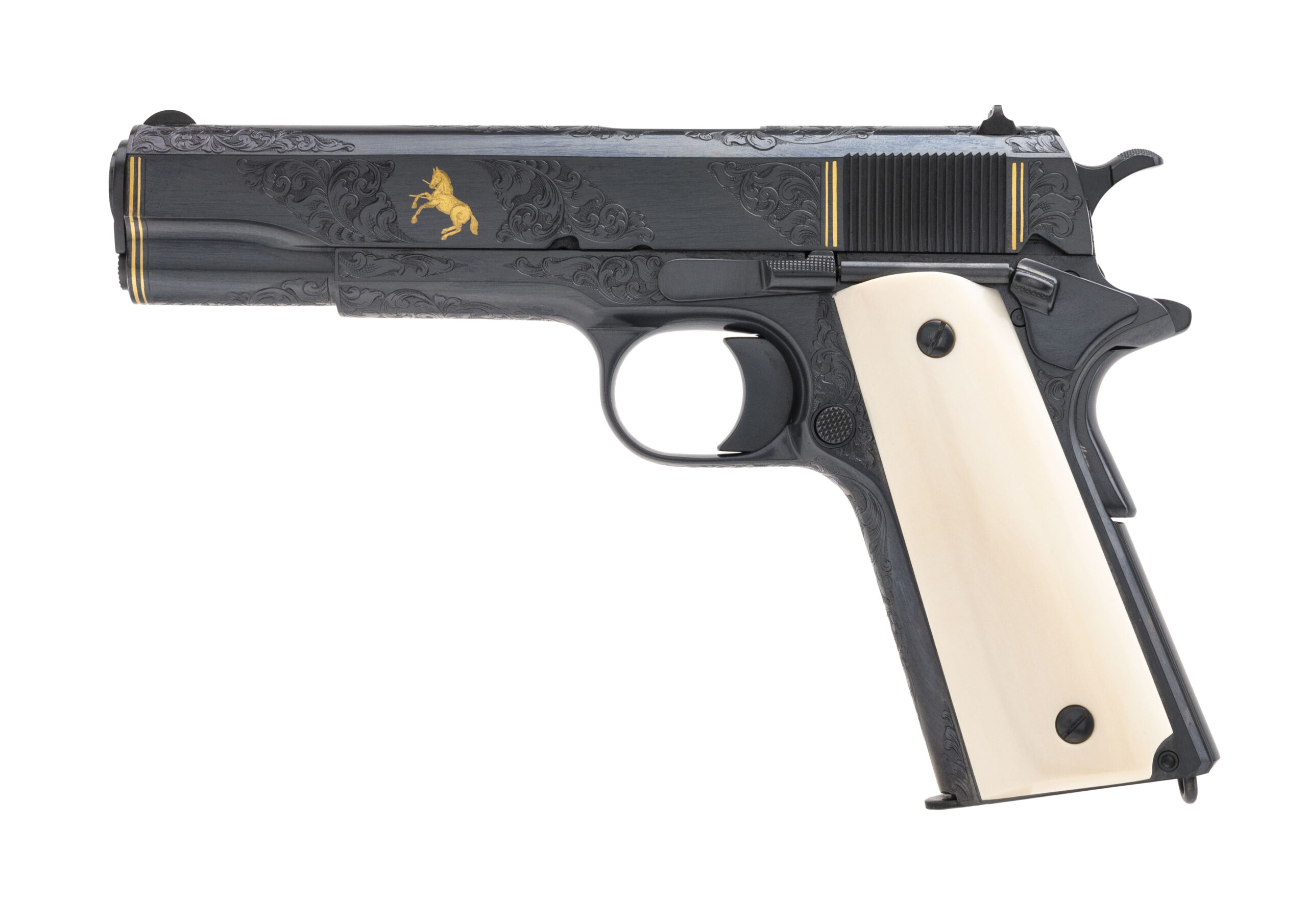 SN: 2013NRAWLF. Modern production .45 ACP with a 5" barrel. Beautiful factory engraved 1911 with royal blue finish, scroll engraving and gold inlay. The grips are smooth ivory. The gun is engraved and signed by Master Engraver Steve Kamyk. An outstanding example, in excellent condition with box.