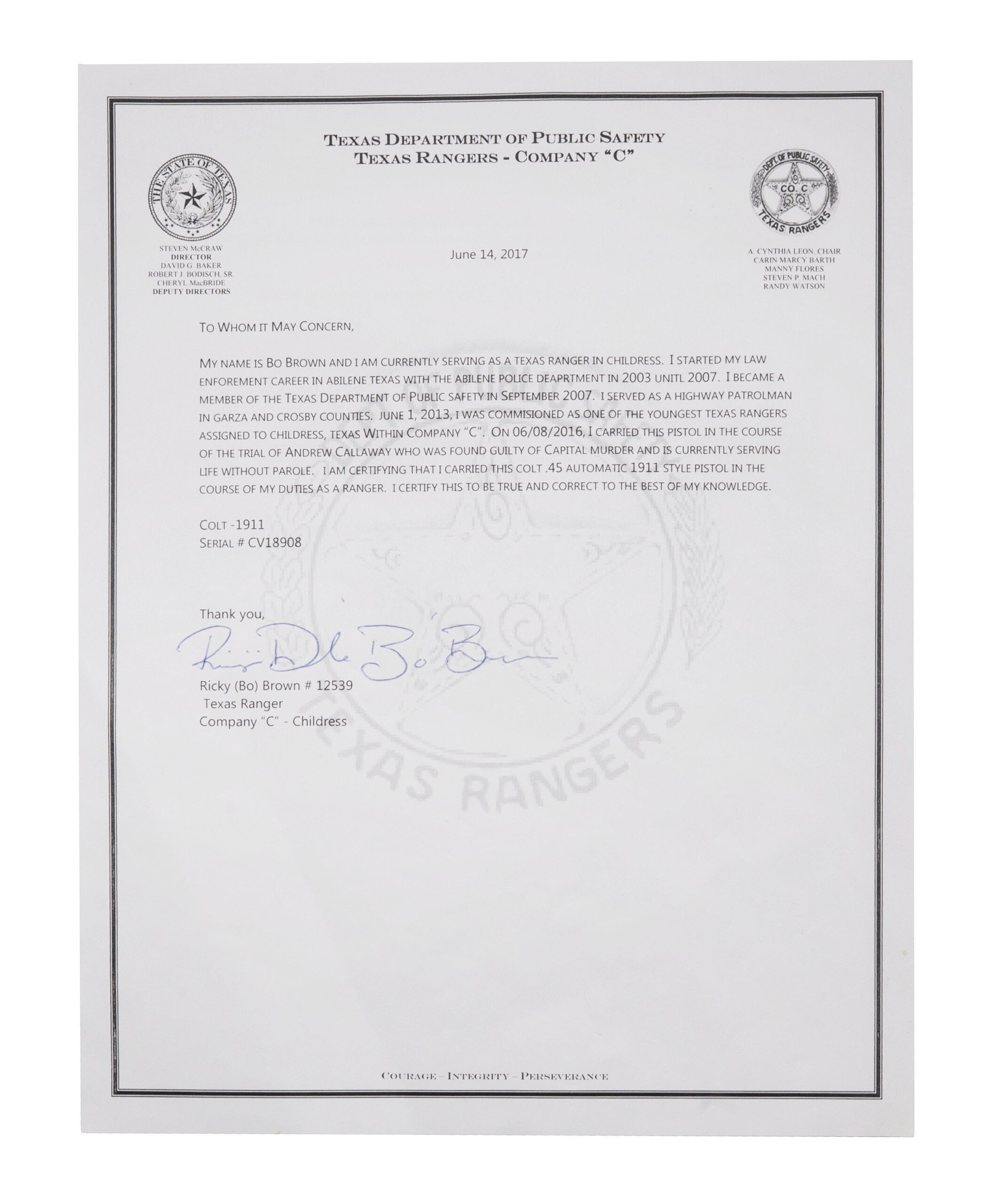 SN: CV18908. Made in 2000, .45ACP with a 5" barrel. Outstanding Texas Ranger owned Colt 1911. Renowned Texas Ranger engraver and badge maker Kevin Johnson engraved and inlaid the pistol, and made the Texas Ranger badge style grips. The gun was carried by Texas Ranger Ricky "Bo" Brown and is accompanied by a letter on Ranger letterhead attesting so. The grips have the initials "RB" inlaid into them. The gun is a beautiful work of art and is in excellent condition.