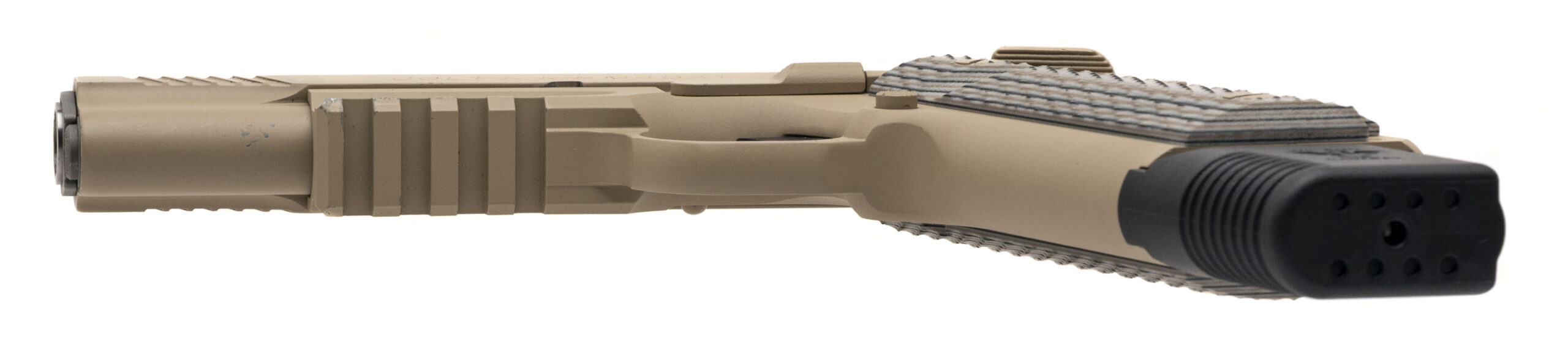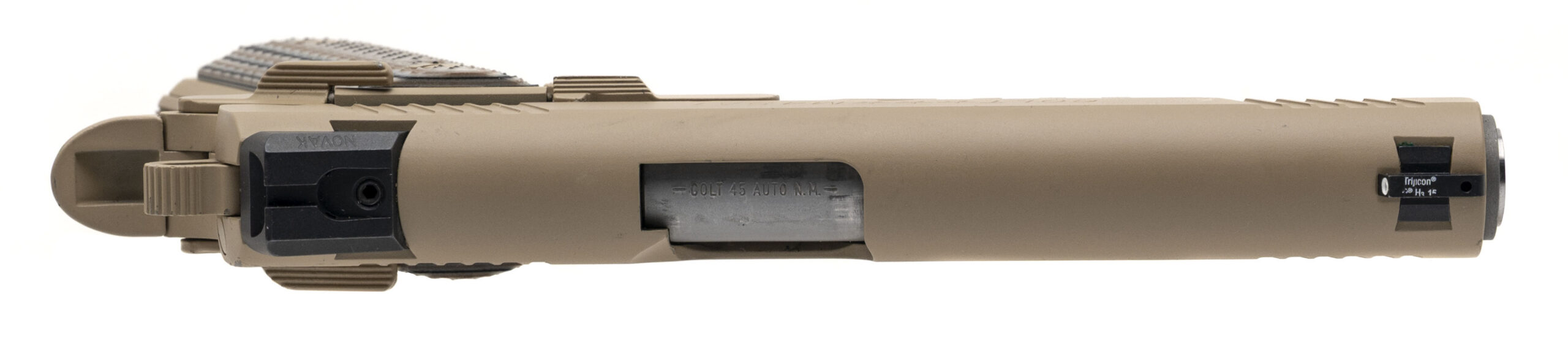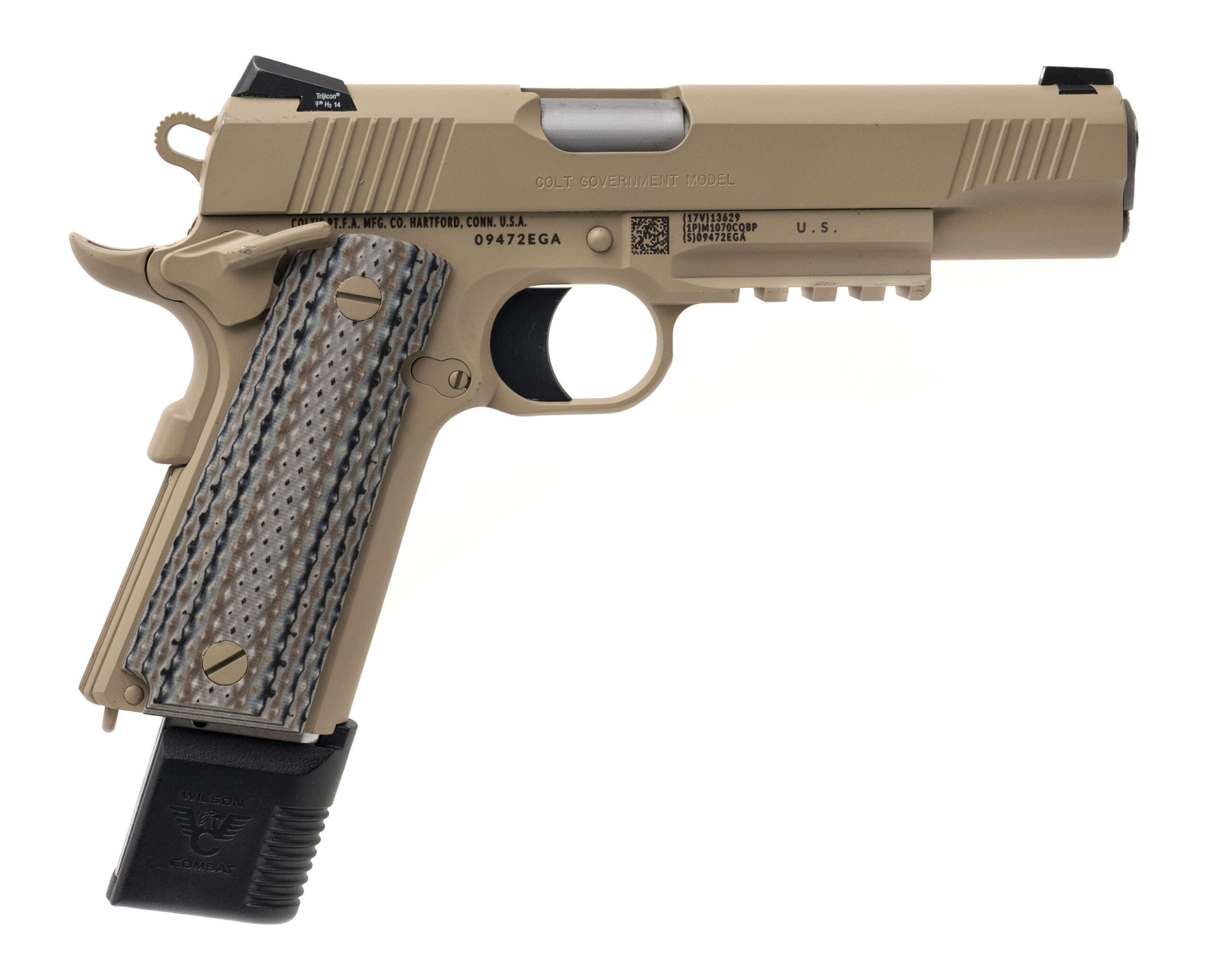 SN: 09472EGA. Modern production, .45 Auto with a 5" barrel. Bore is very good. Limited made Government size rail gun reproduction of the original M45A1 pistols designated to the U.S. Marine Core. This handgun features a desert tan cerakote finish, U.S. marked frame, Trijicon night sights, G10 grips, and a lanyard loop. Shows minor handling wear but the overall condition is very good.