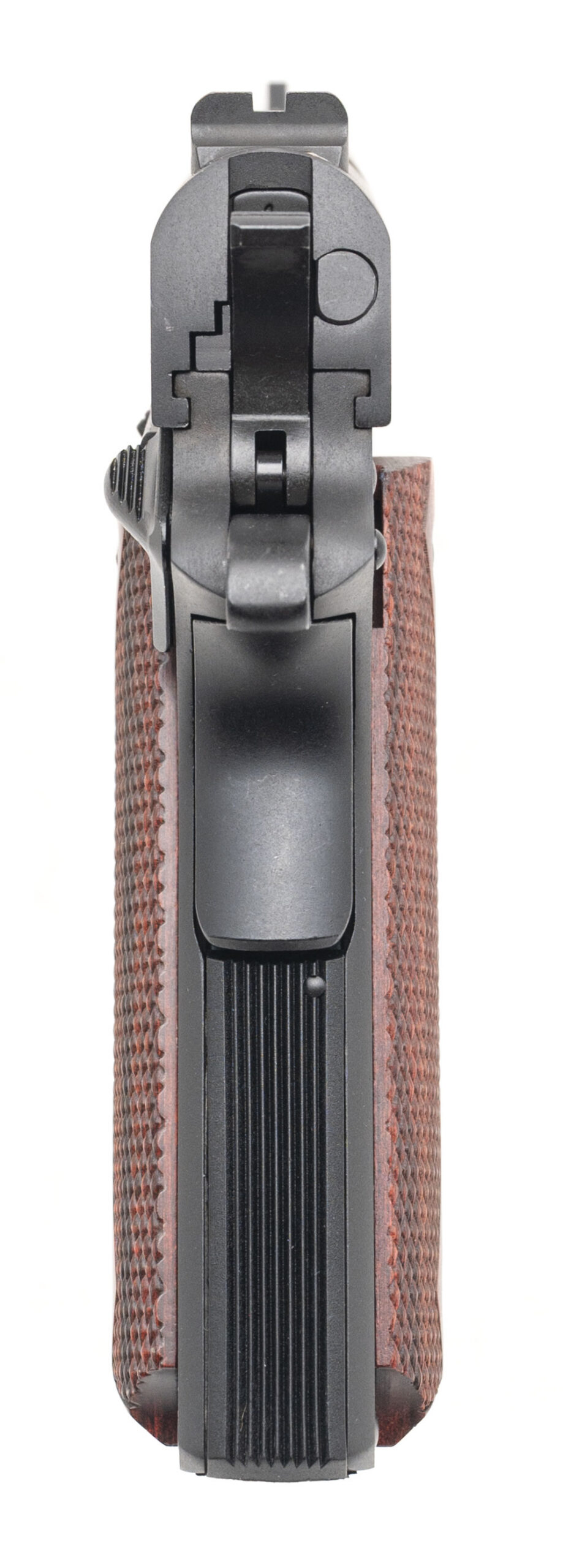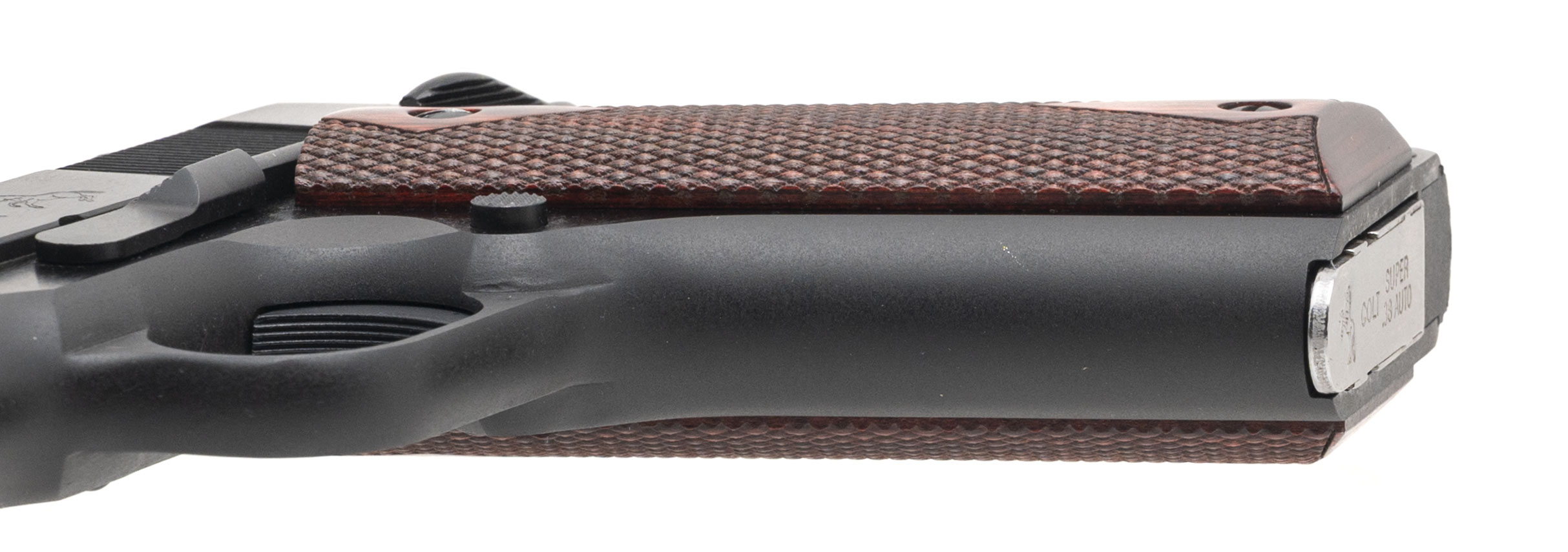 SN: GV092572. Modern production, .38 Super with a 5" barrel. Bore is excellent. Government size series 70 steel frame 1911 pistol with a manual thumb-safety, blued finish, and checkered wood grips. Overall condition is like new. Includes original case.