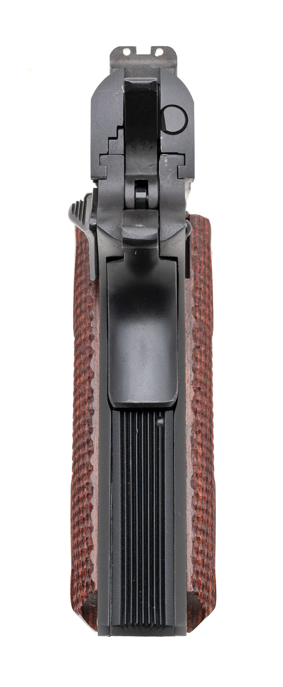 SN: 2823975. Made in 2008, .45 Auto with a 5" barrel. Bore is bright with strong rifling. Series 80 Government model 1911. Blued finish shows carry wear but is in very good condition. Diamond checkered wood grips are in very good condition. Comes with case.