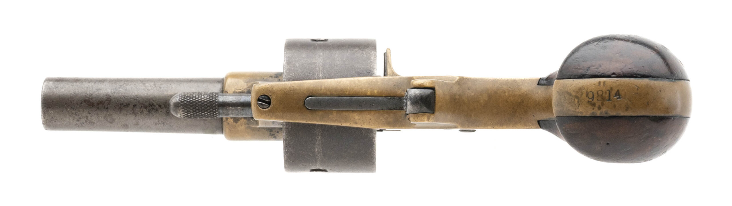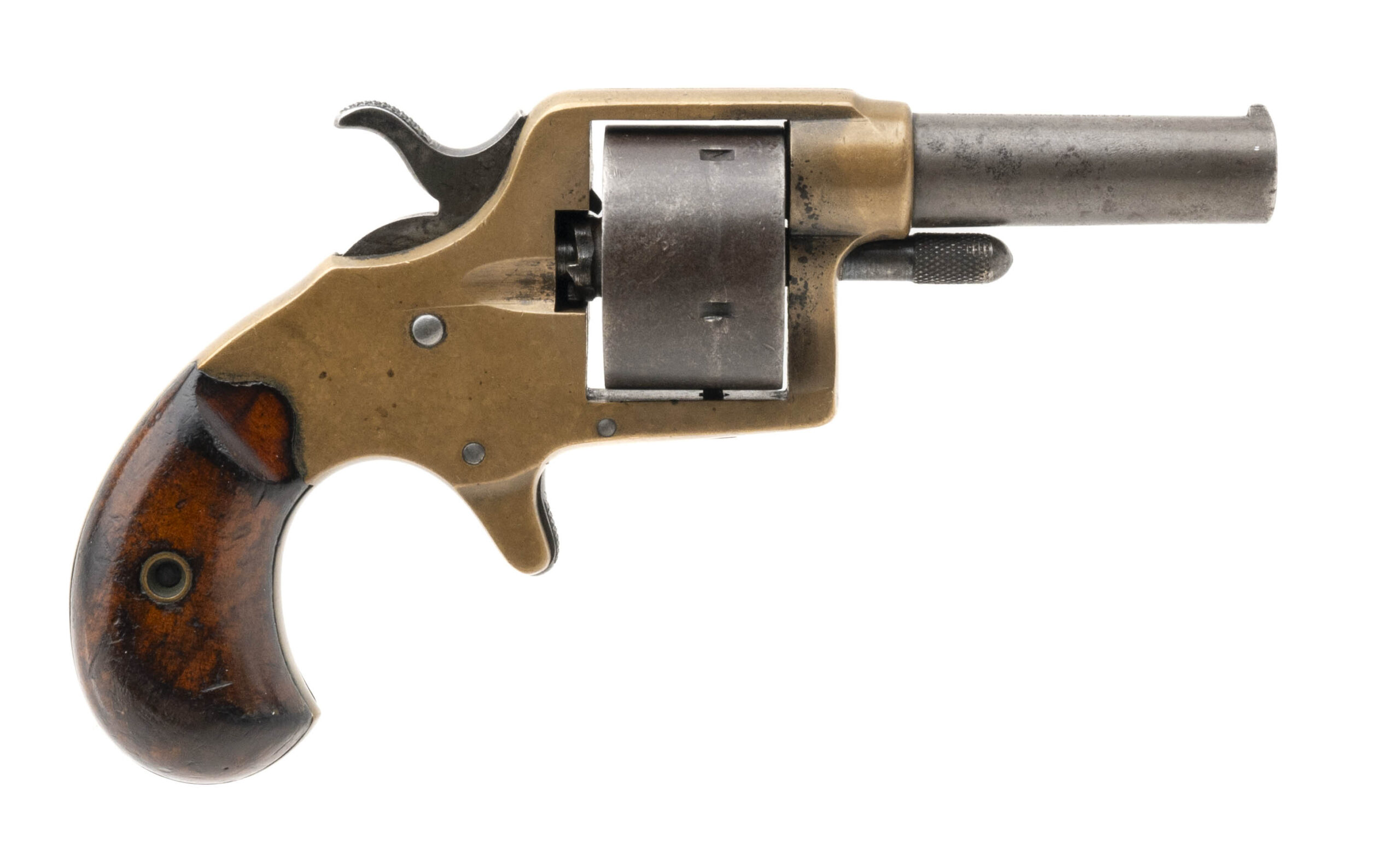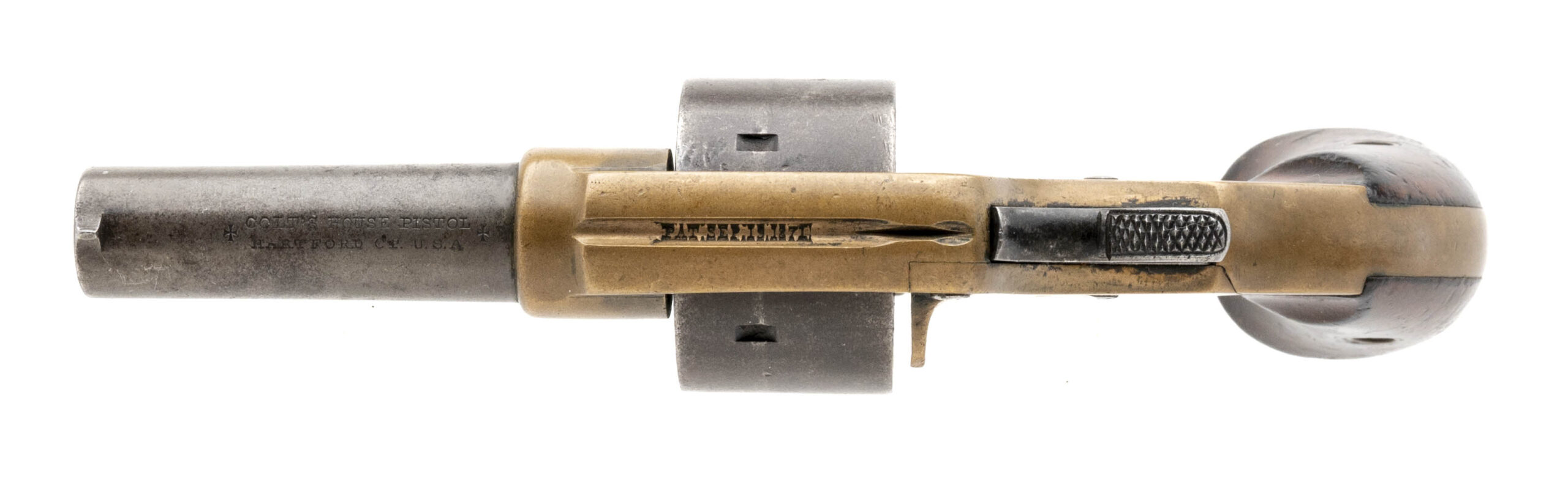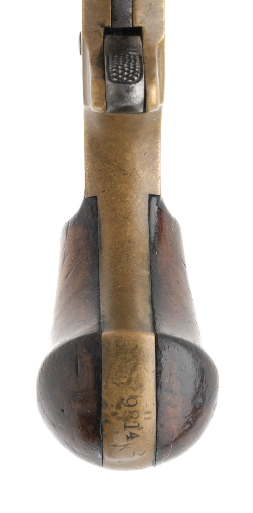 Serial No. 9814, circa 1871-1876, .41 caliber, 2 5/8” round barrel. Barrel and cylinder are a dark grey/brown patina, serial numbers are matching. Brass frame is a nice untouched patina. Varnish walnut grips are good with scratches visible on the surface. Action is strong and indexes correctly with a tight lock up.