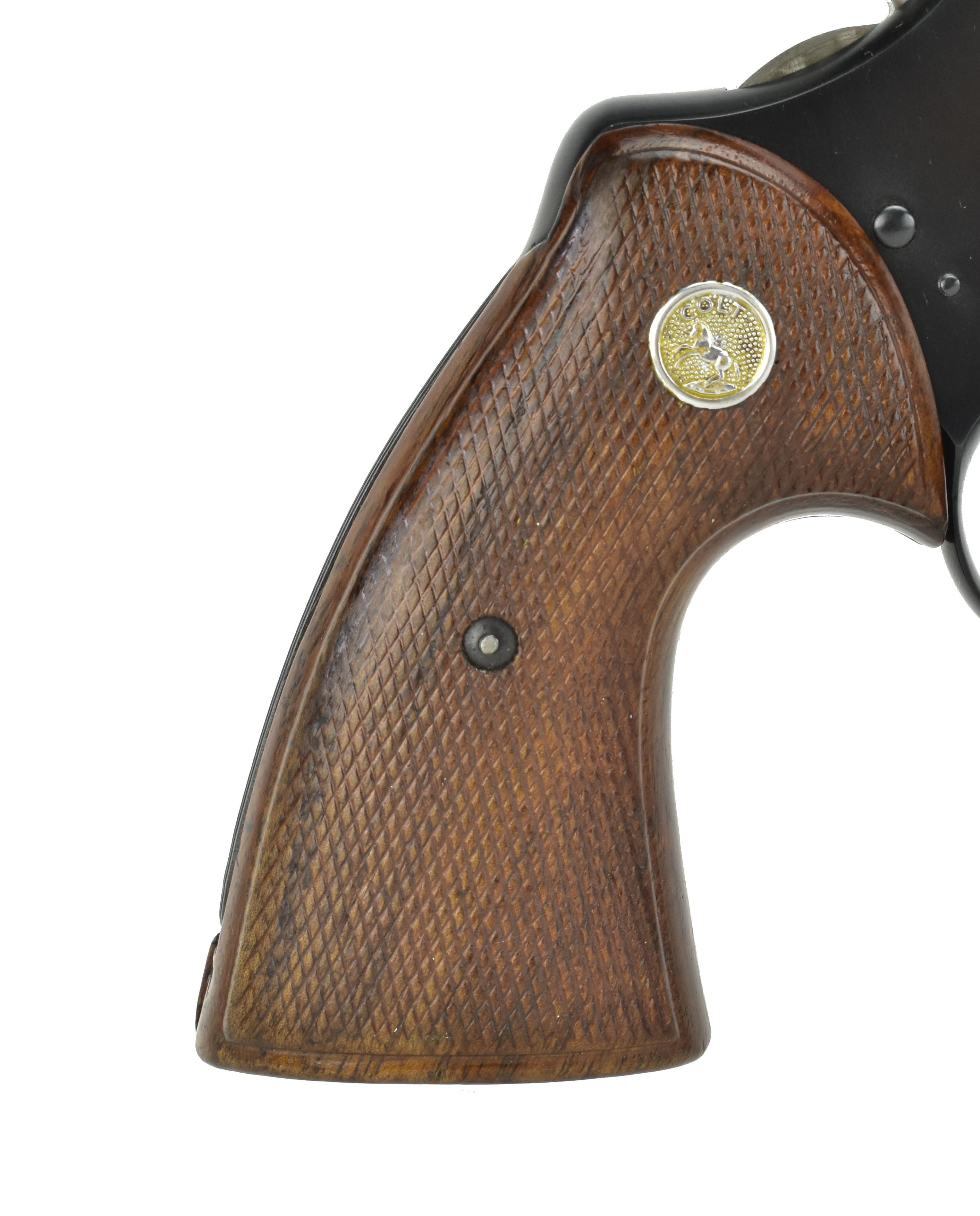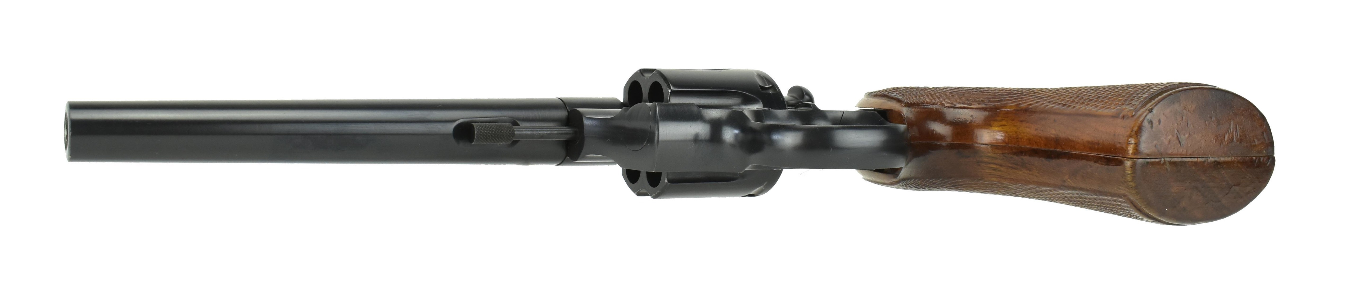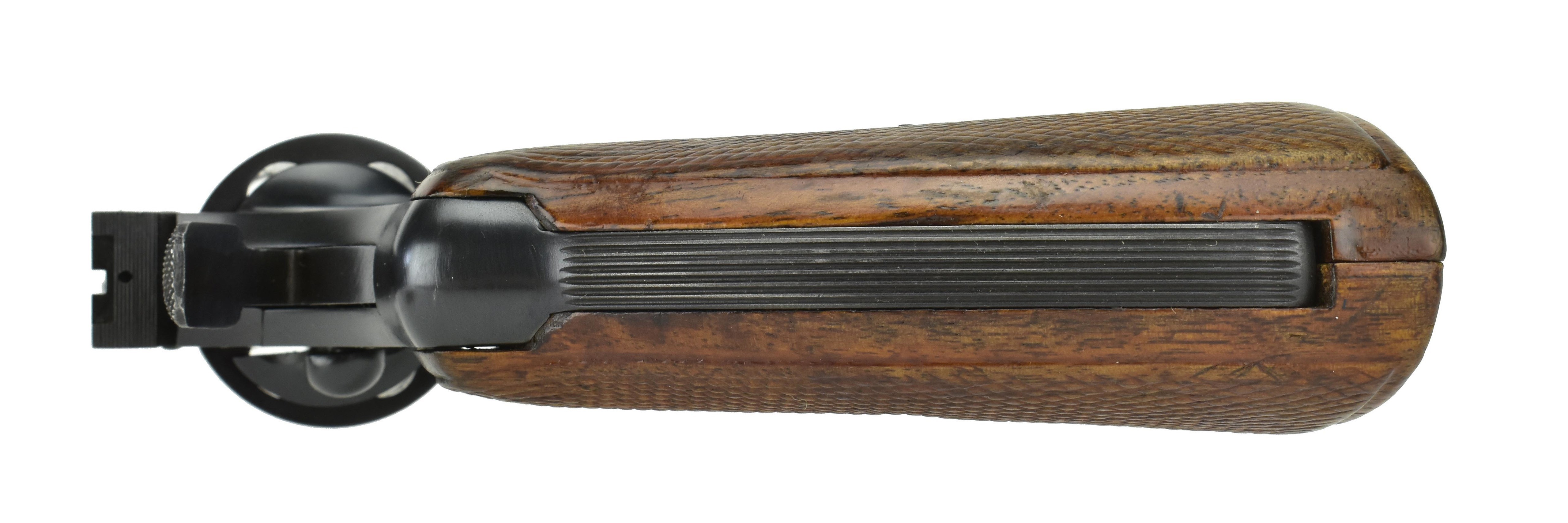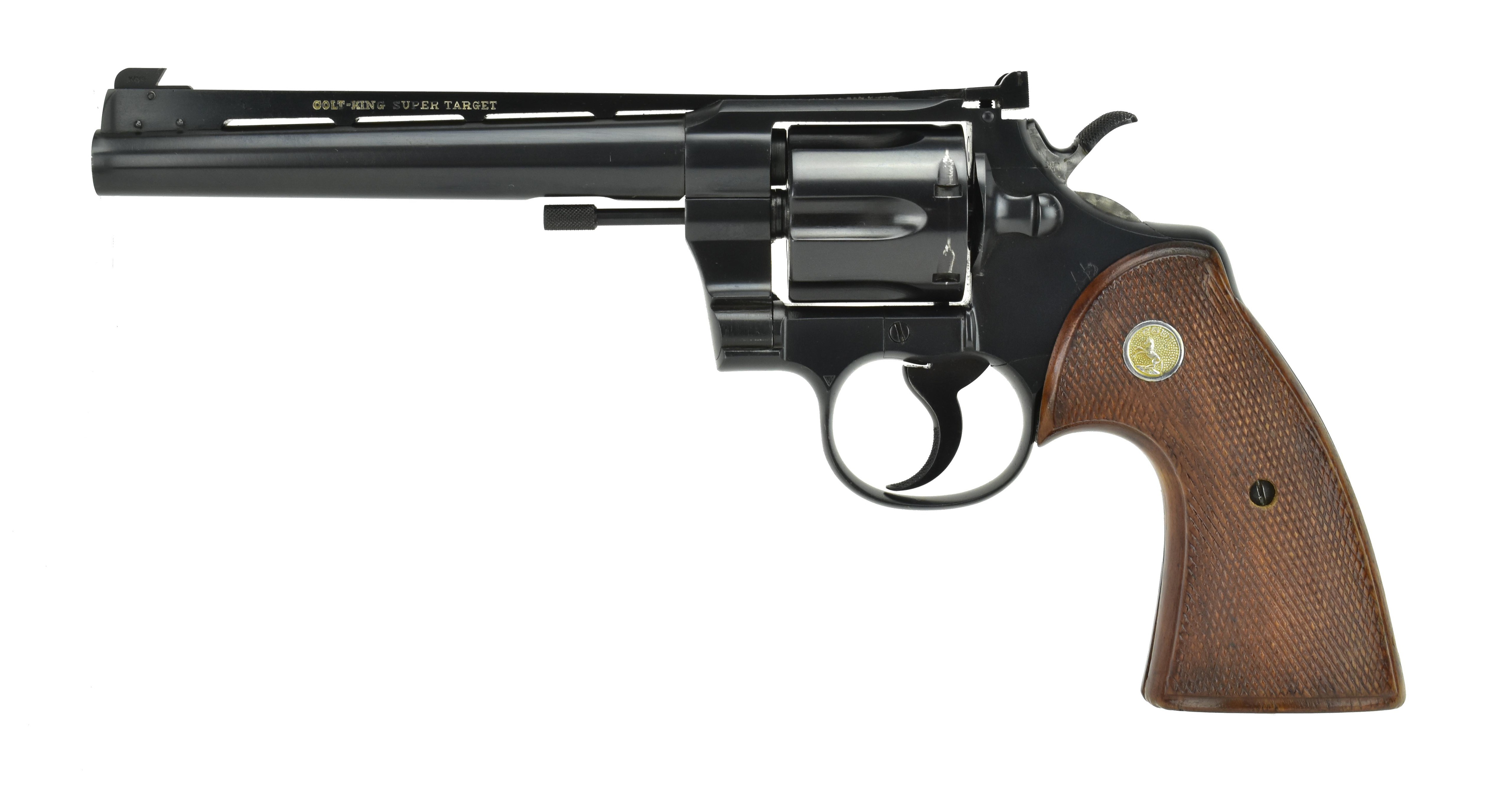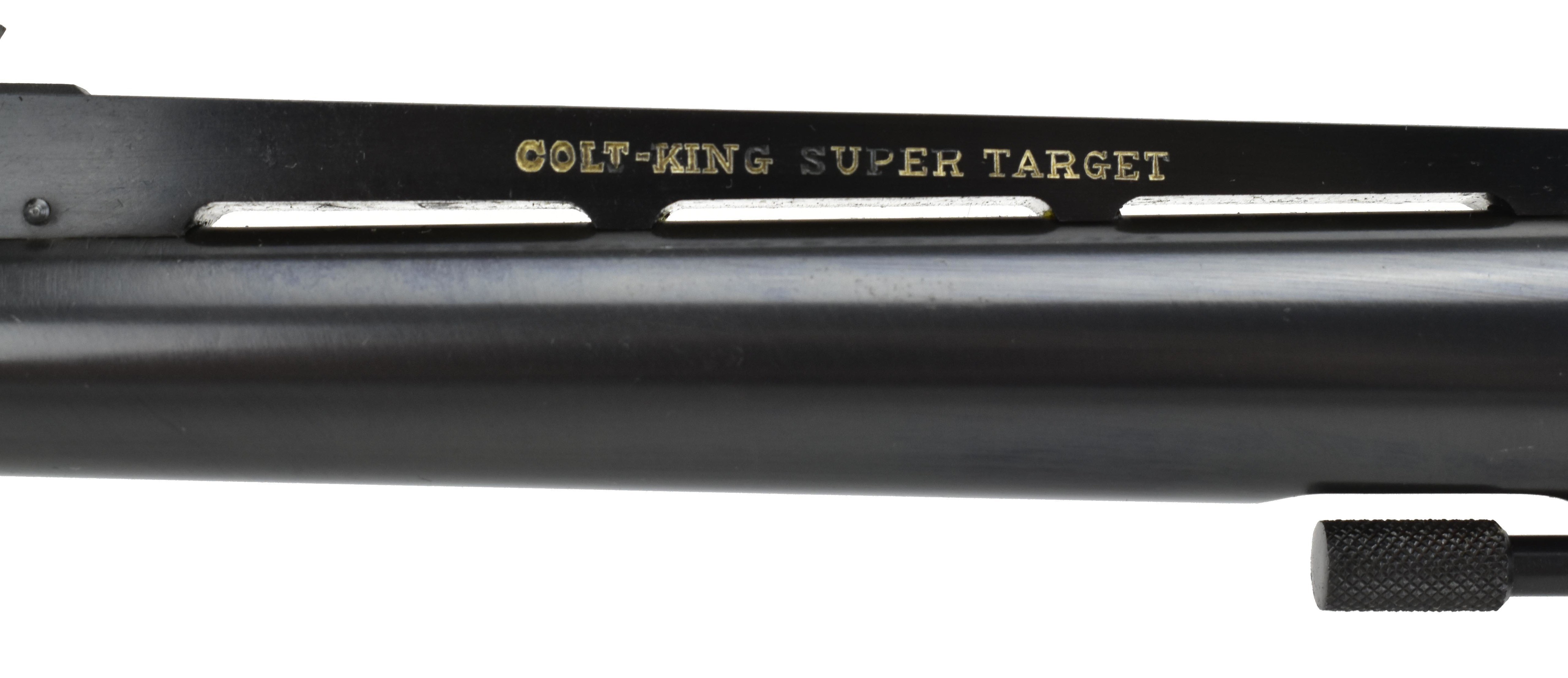 SN: 781287. Made in 1950. 38 Special with a 6" barrel. Colt Official Police customized into a King Super Target. Very neat revolver customized by the legendary King Gunsight Company. The metal surfaces retain about 99% reapplied blue, the King “Cockeyed Hammer” with “Never-Slip” checkering has been nicely engine-turned, the Rampant Colt is still visible but the barrel markings are mostly removed. The fully checkered target grips with Colt medallions are about very good plus as refinished. The rear sight is a micro-metered click-adjustable square notch blade, the front sight is a quick detachable undercut Dead Black steel Patridge blade with King reflector. These King revolvers are renowned for their accuracy and adjustability.