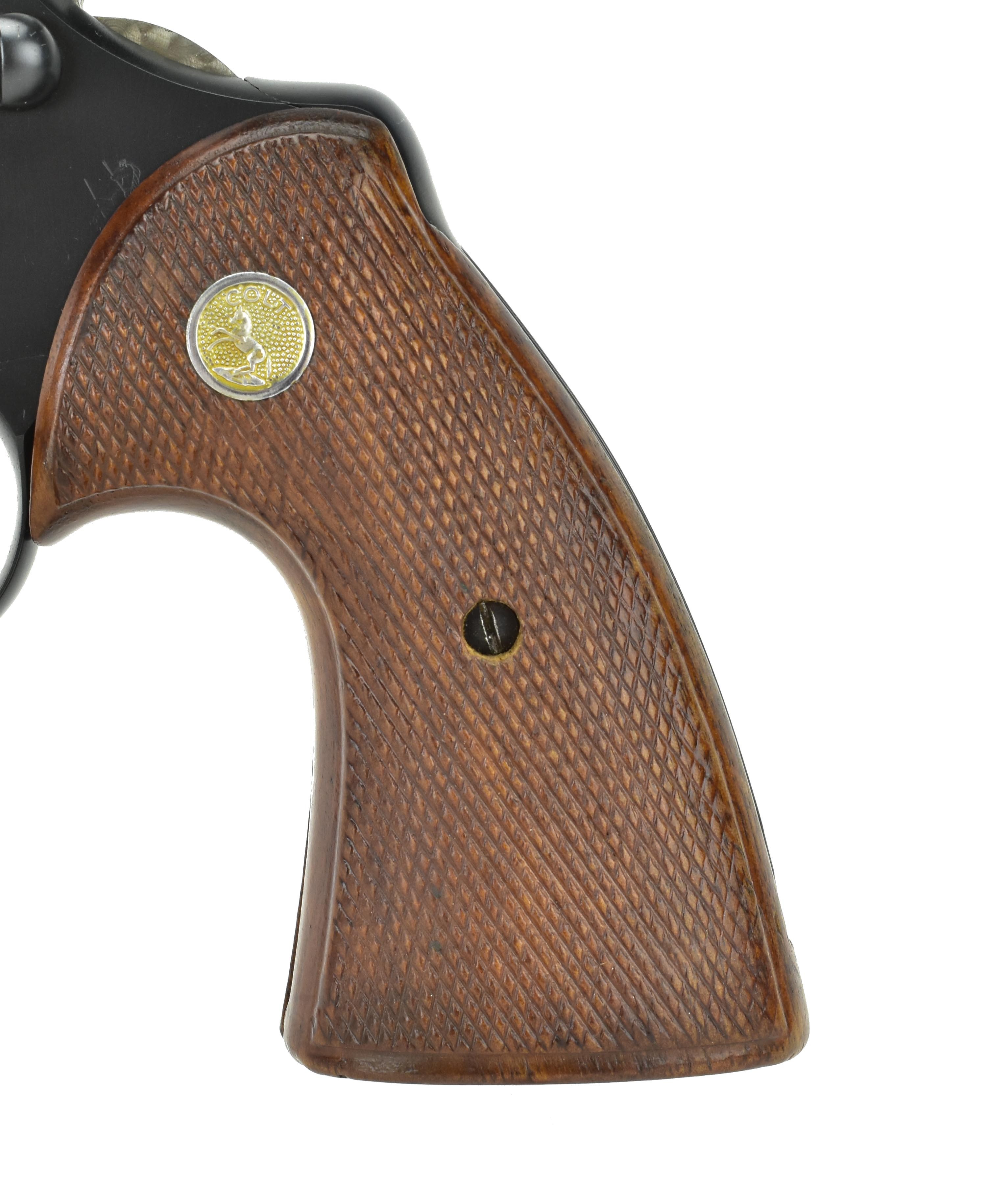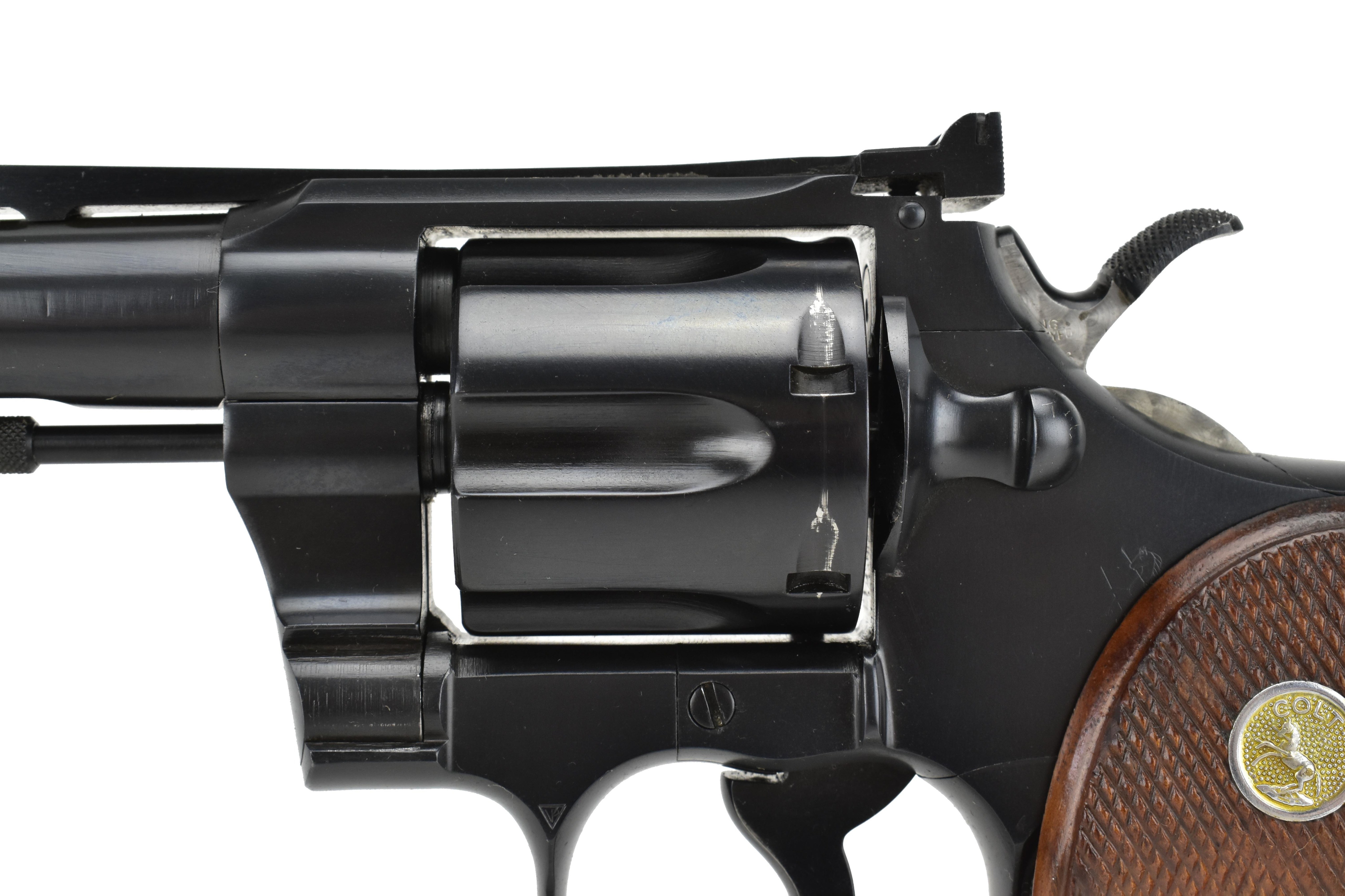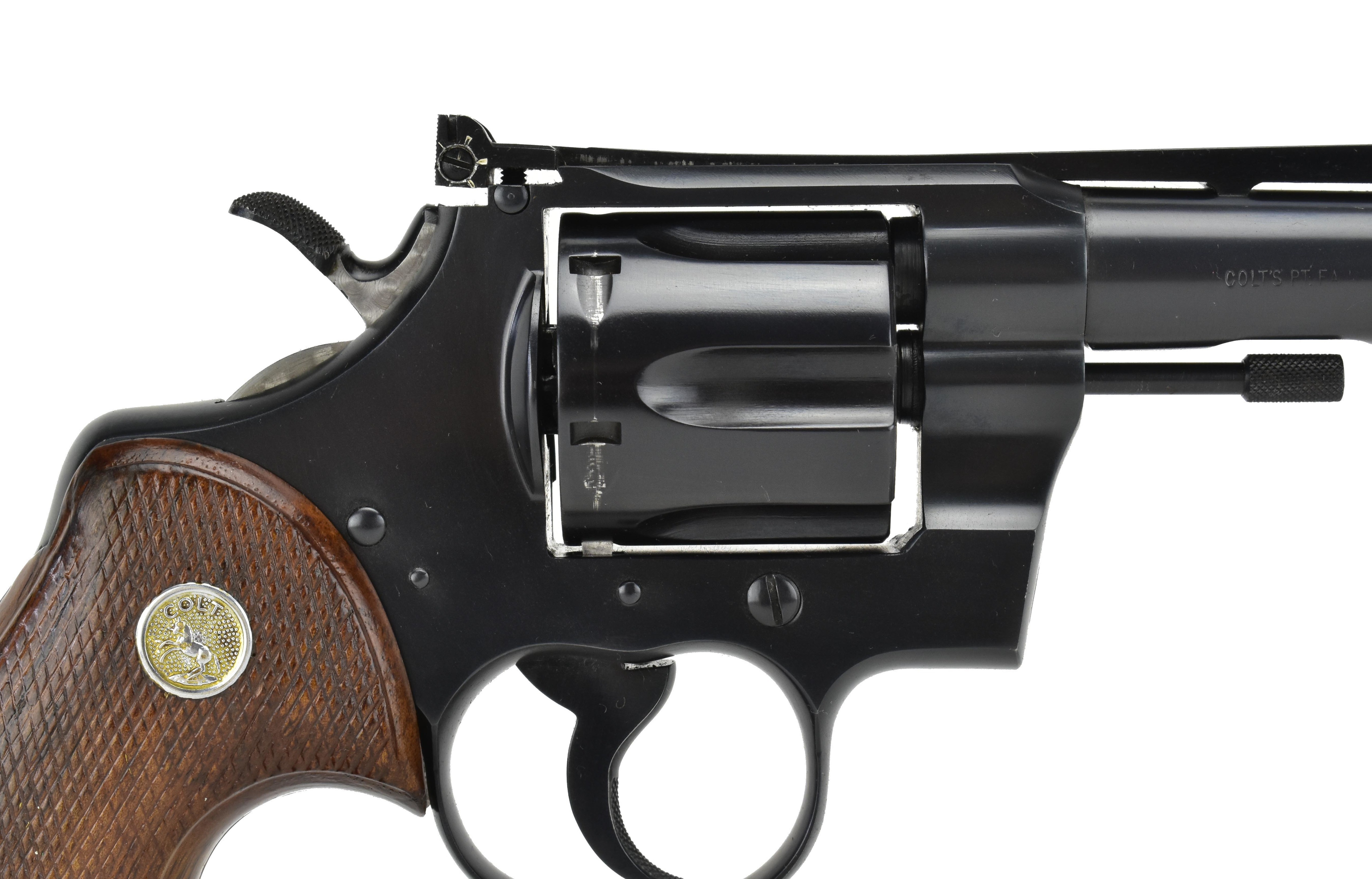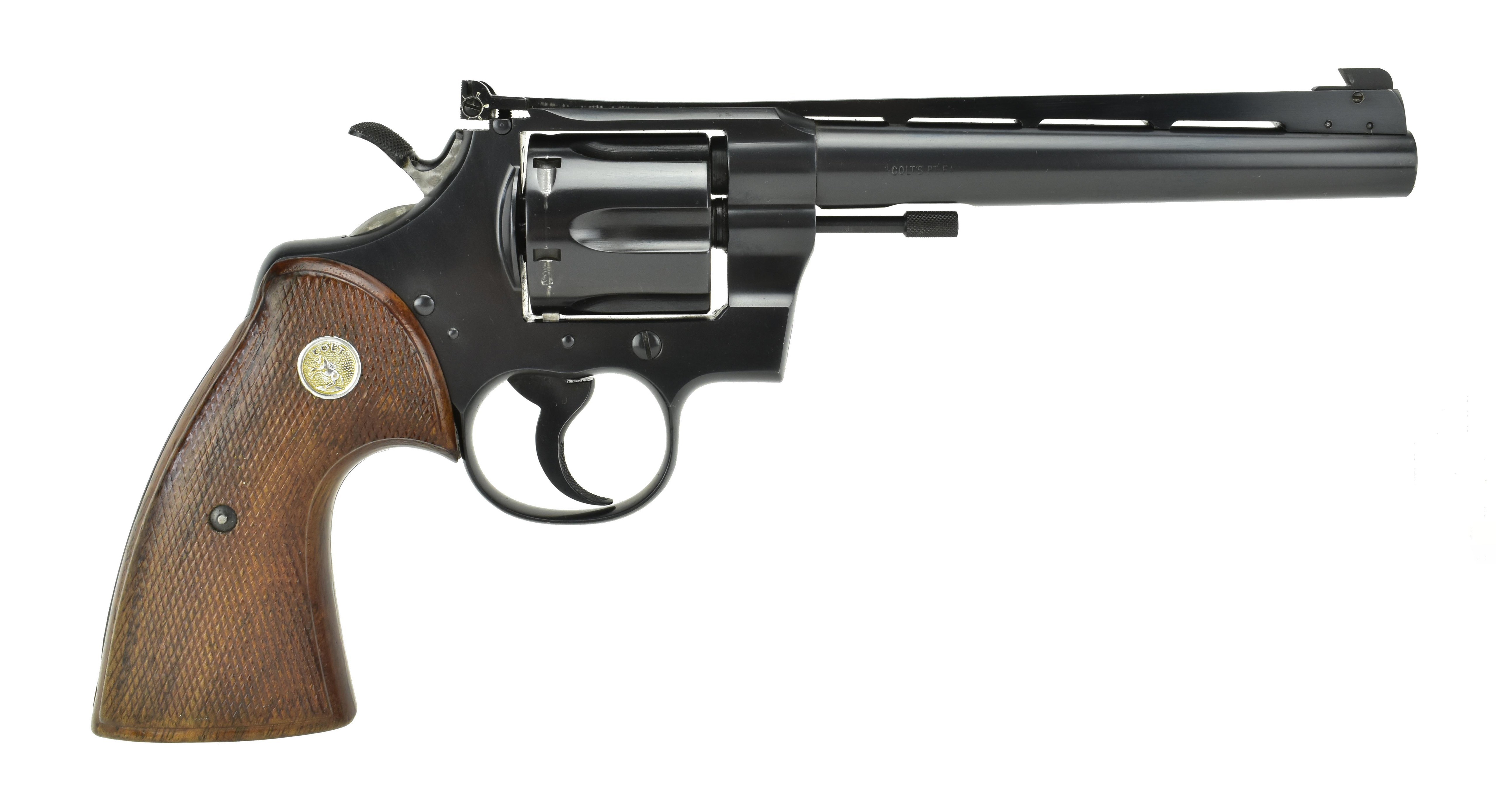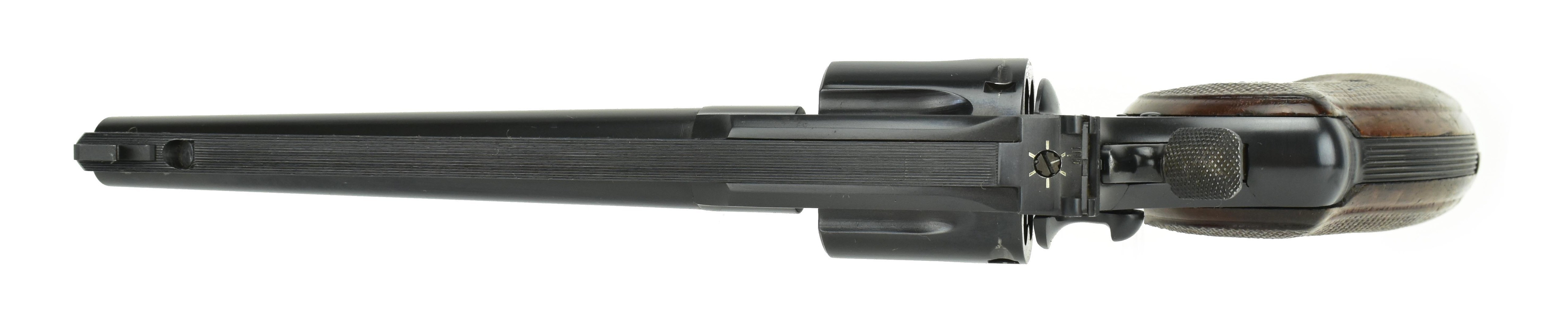 SN: 781287. Made in 1950. 38 Special with a 6" barrel. Colt Official Police customized into a King Super Target. Very neat revolver customized by the legendary King Gunsight Company. The metal surfaces retain about 99% reapplied blue, the King “Cockeyed Hammer” with “Never-Slip” checkering has been nicely engine-turned, the Rampant Colt is still visible but the barrel markings are mostly removed. The fully checkered target grips with Colt medallions are about very good plus as refinished. The rear sight is a micro-metered click-adjustable square notch blade, the front sight is a quick detachable undercut Dead Black steel Patridge blade with King reflector. These King revolvers are renowned for their accuracy and adjustability.