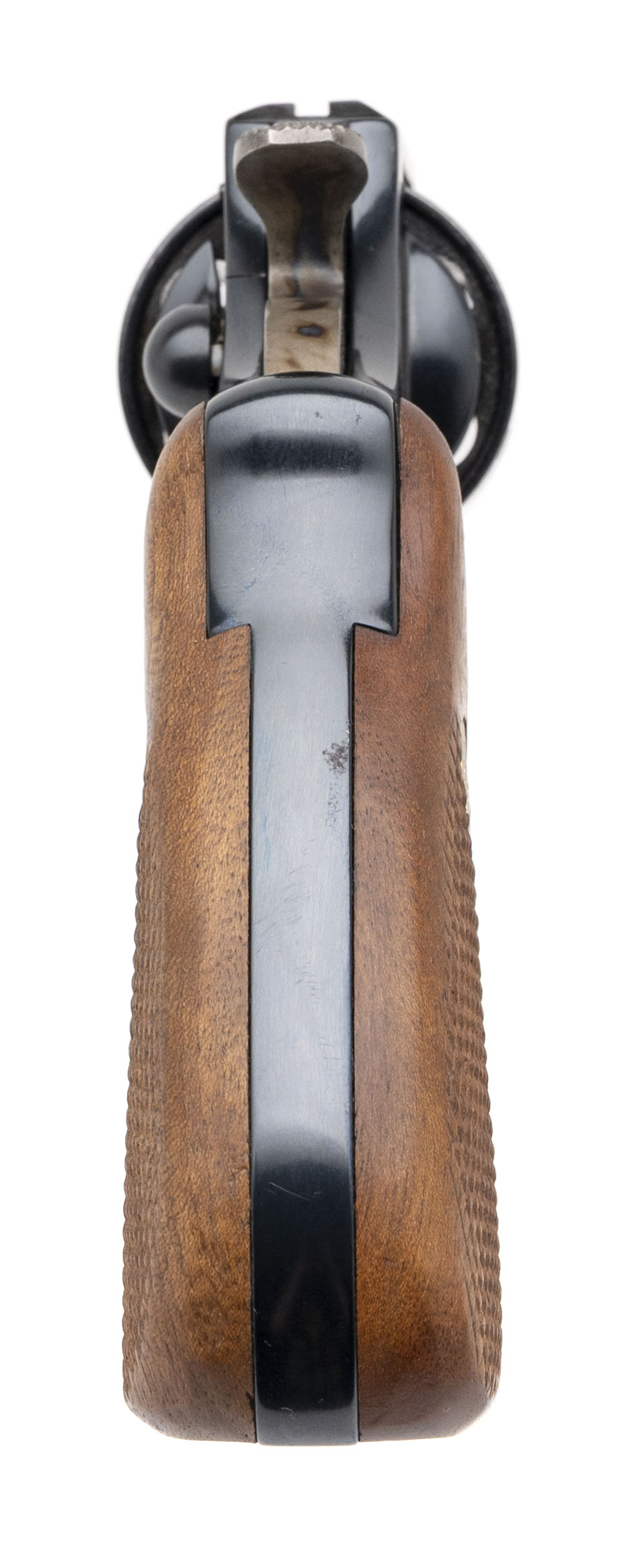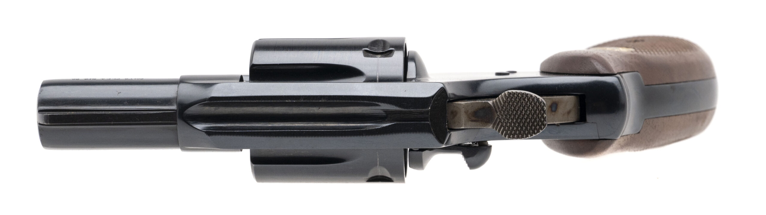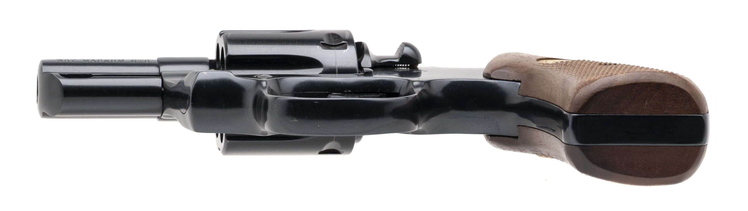 SN: l66061 made in 1977. 6 shot double action 357 magnum revolver with the scarce snub nose 2” barrel, trench sights, blued finish and checkered walnut gold medallion grips. Overall in very good condition with only minor handling marks.