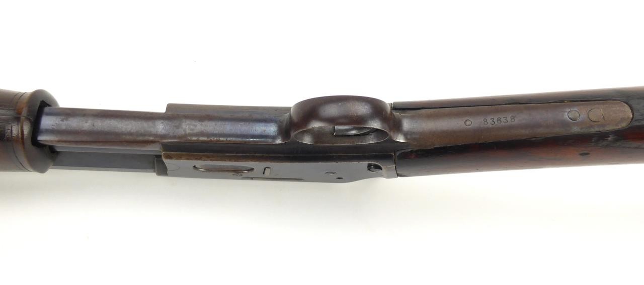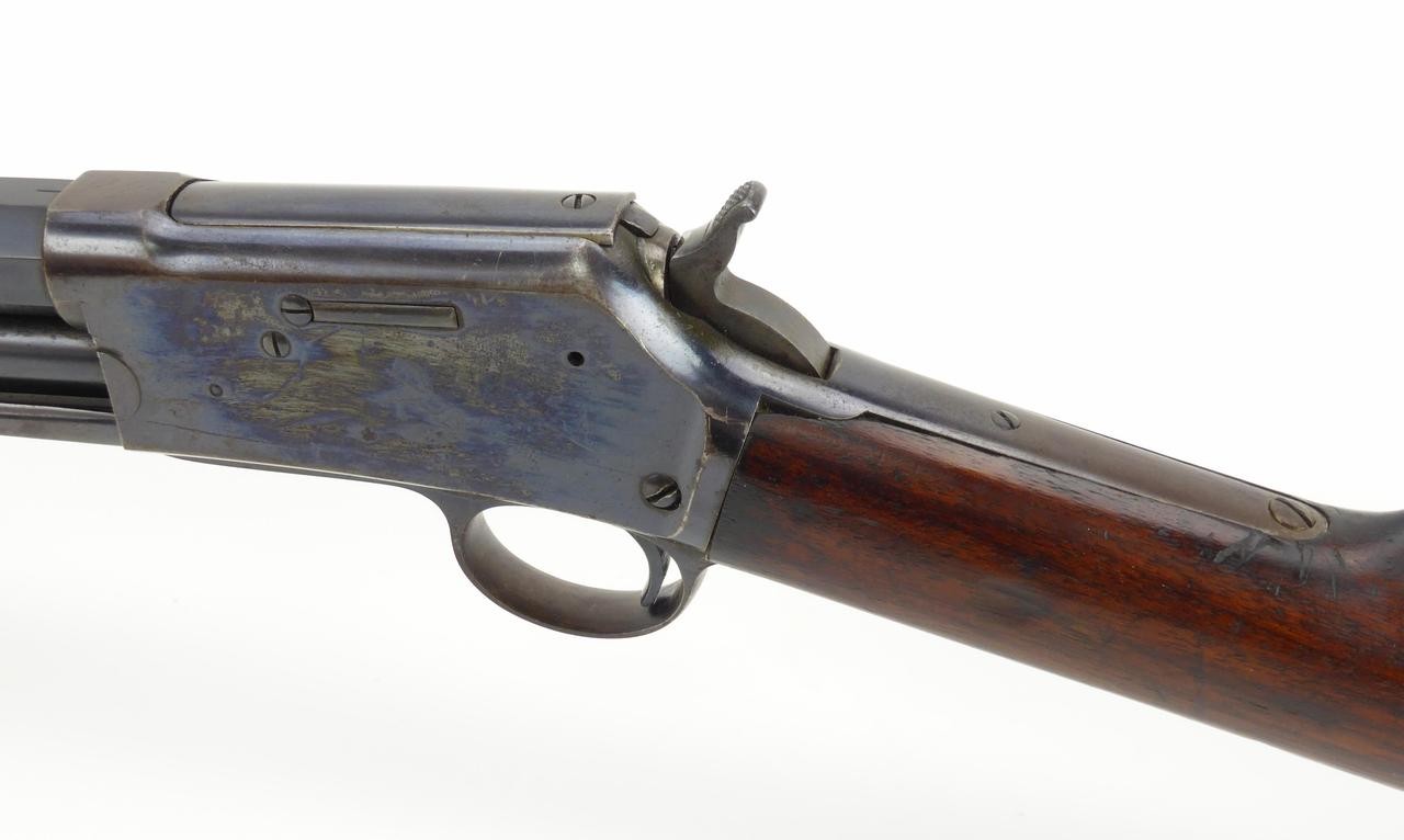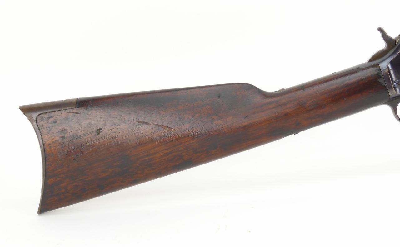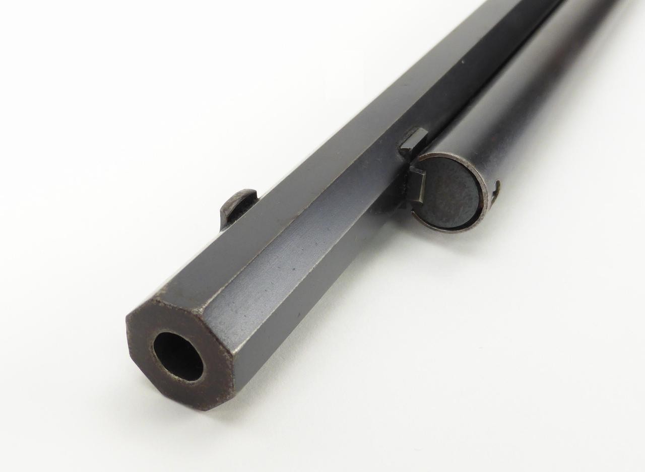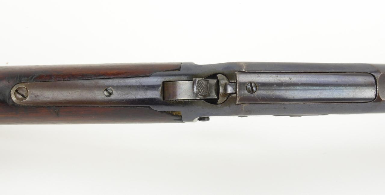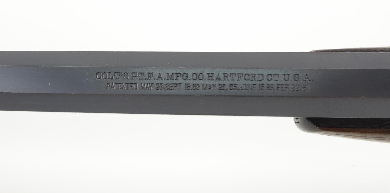 Colt Lightning .32-20 caliber rifle. Colt Lighting rifle with 30” Octagonal barrel in .32-20 caliber. About 85% beautiful bright blue receiver. Barrel and tube have high percentage of blue. Tang and butt plate have a patina look. Stock has not been cleaned but has use dings. Bore has period “CF” engraved on top of receiver. Manufactured 1898.