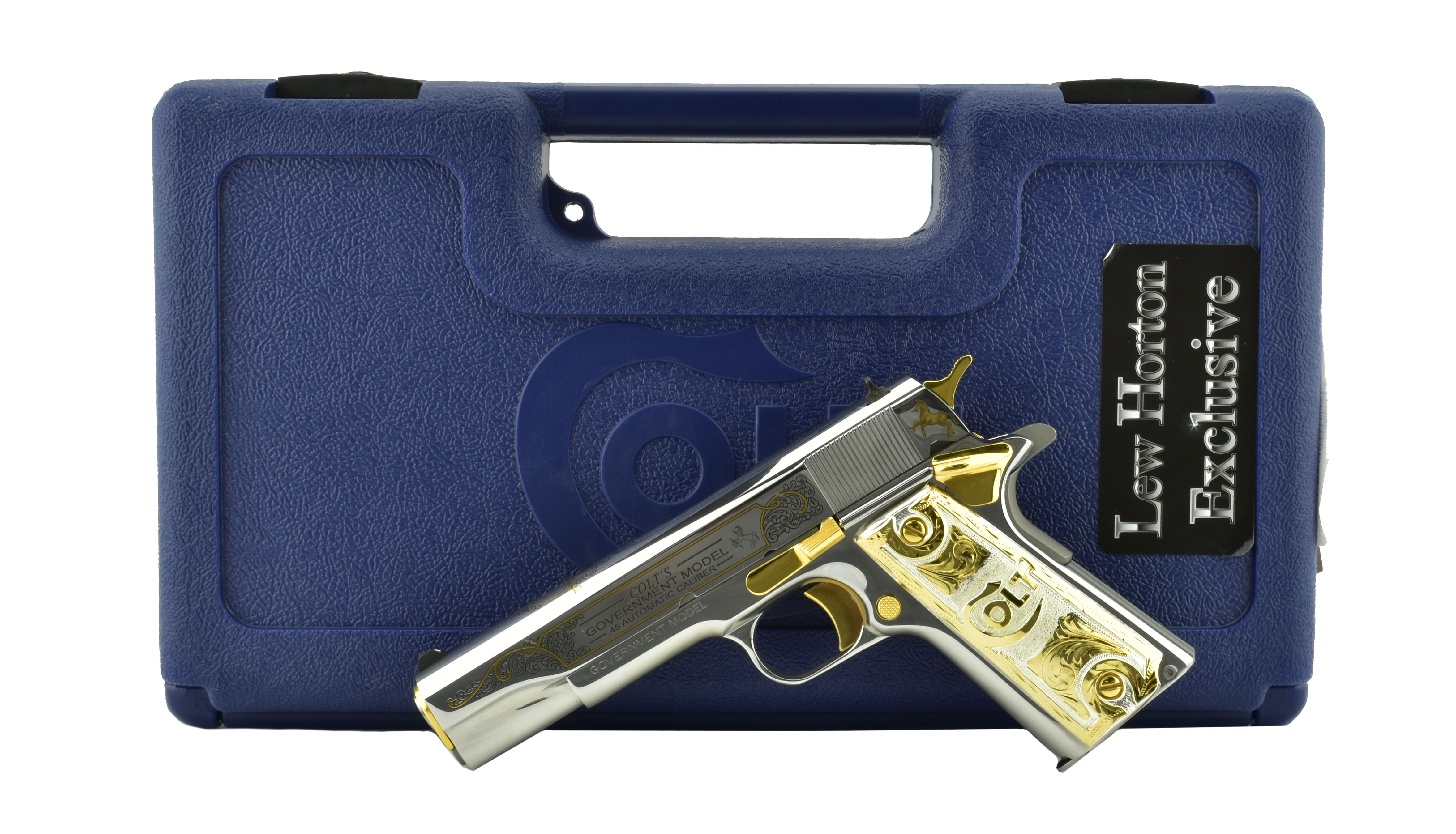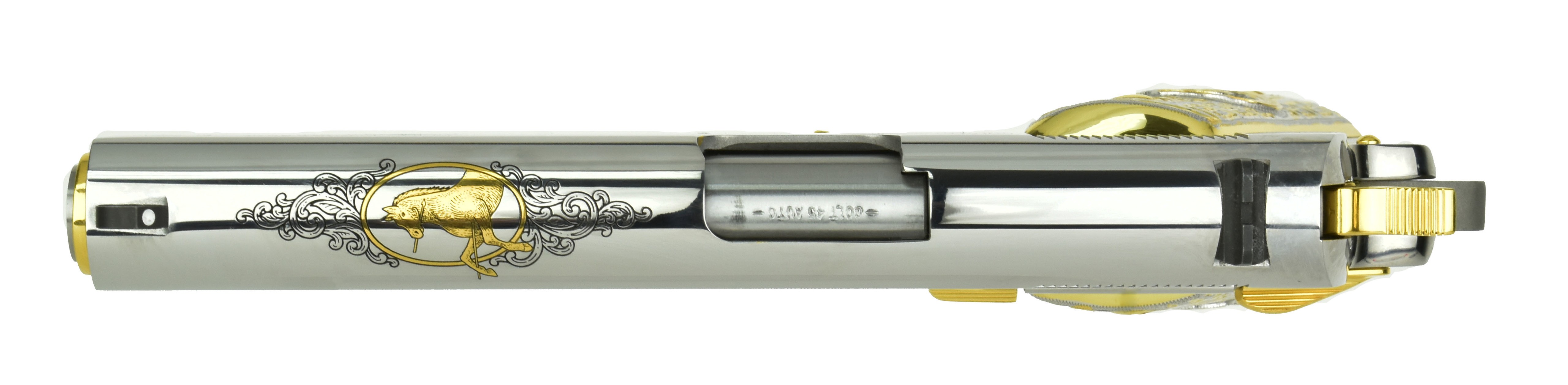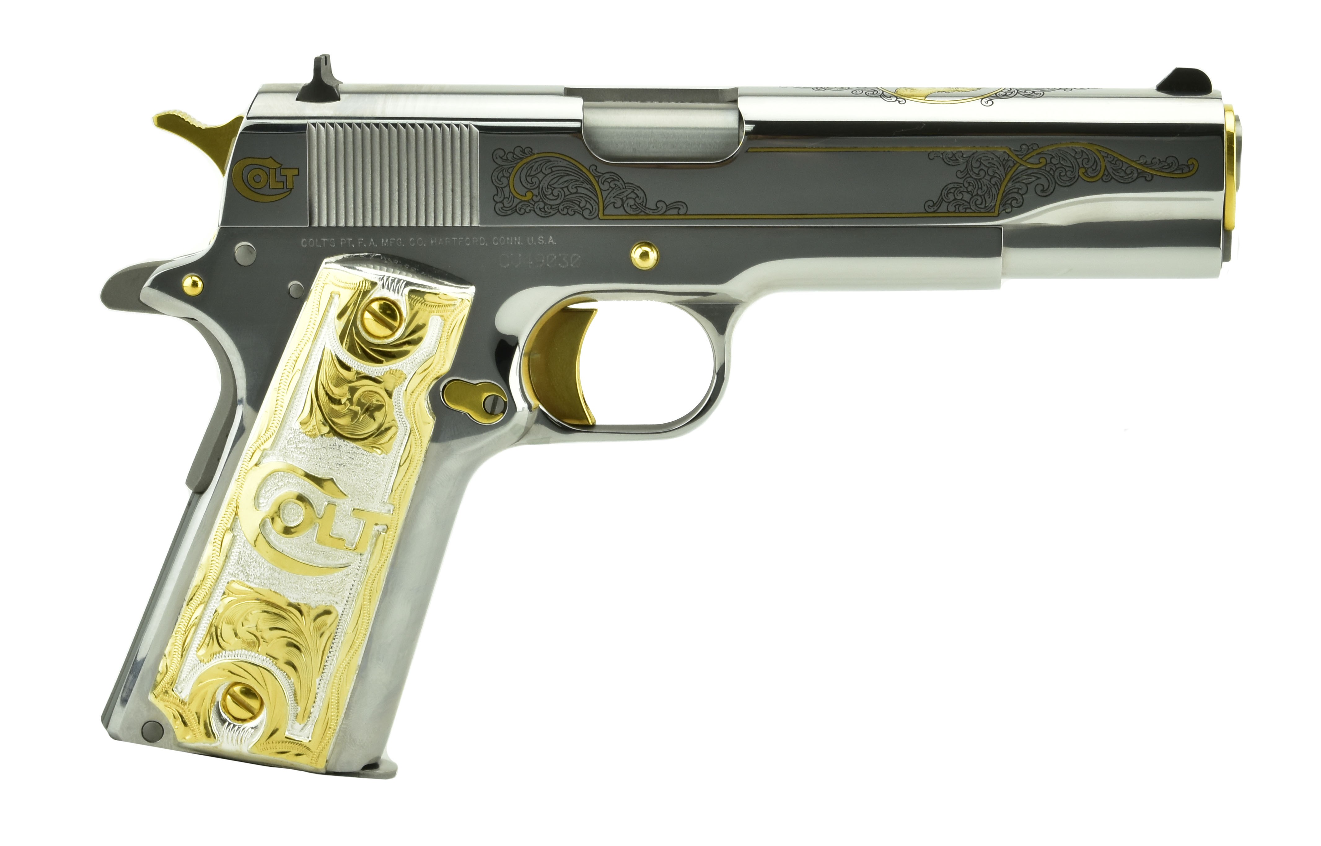 Colt M1991A1 .45 ACP caliber pistol. Deluxe Gold Stallion with bright stainless finish, gold engraving and fancy grips. New.