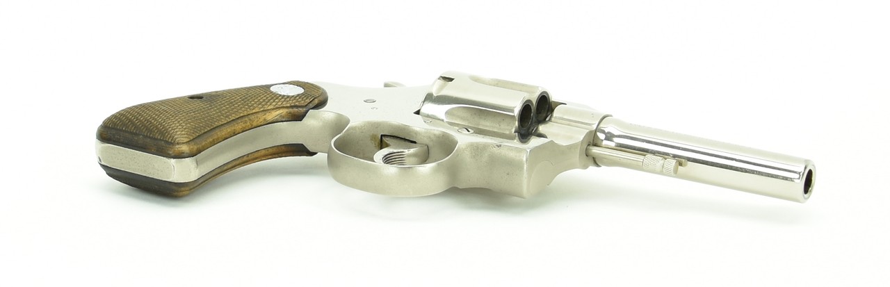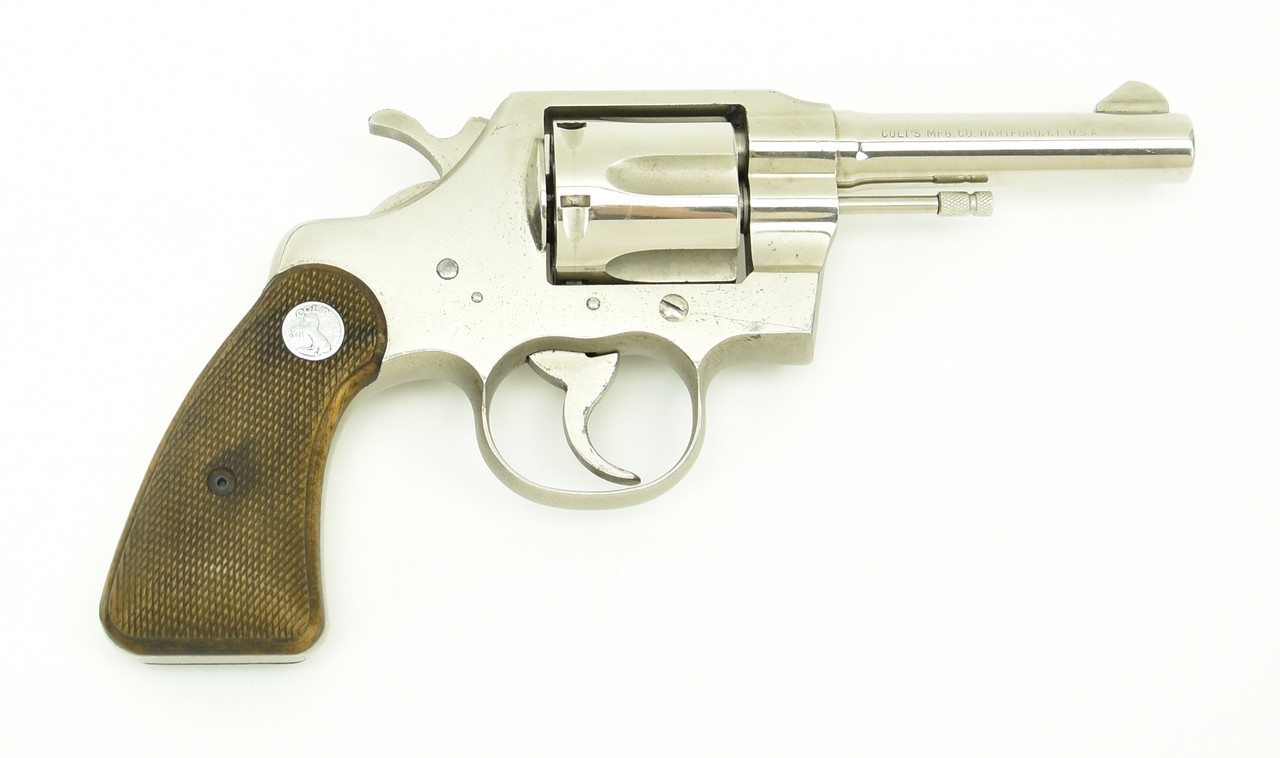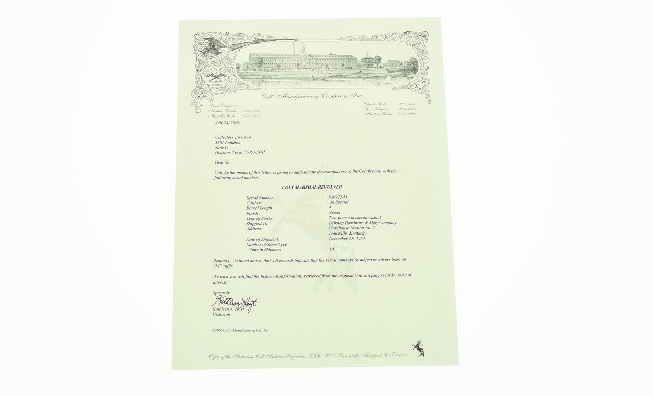 Colt Marshal .38 Special caliber revolver. Made in 1954. Nickel finish .38 Special with 4” barrel. 97% of the original finish. The Colt Marshal Model is a scarce model with only 2500 guns produced and the nickel guns were very scarce. The Colt Marshal revolver was essentially a Colt Official Police with a round butt. This gun comes with a factory letter and was shipped to Belknap Hardware and Mfg. Company in Louisville, Ky. Very neat rare gun!