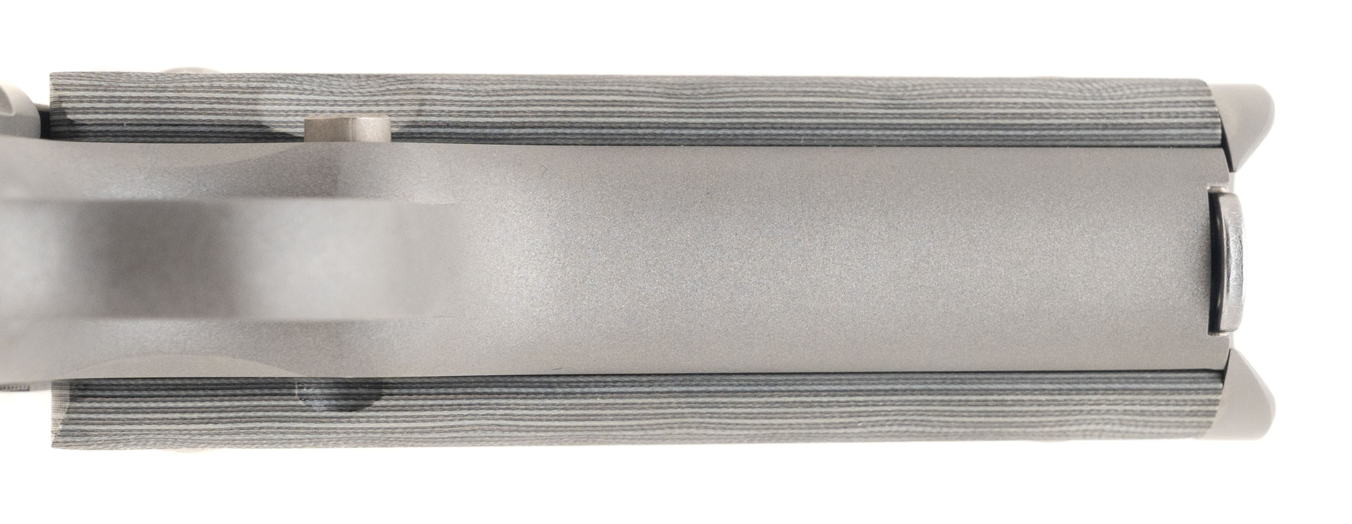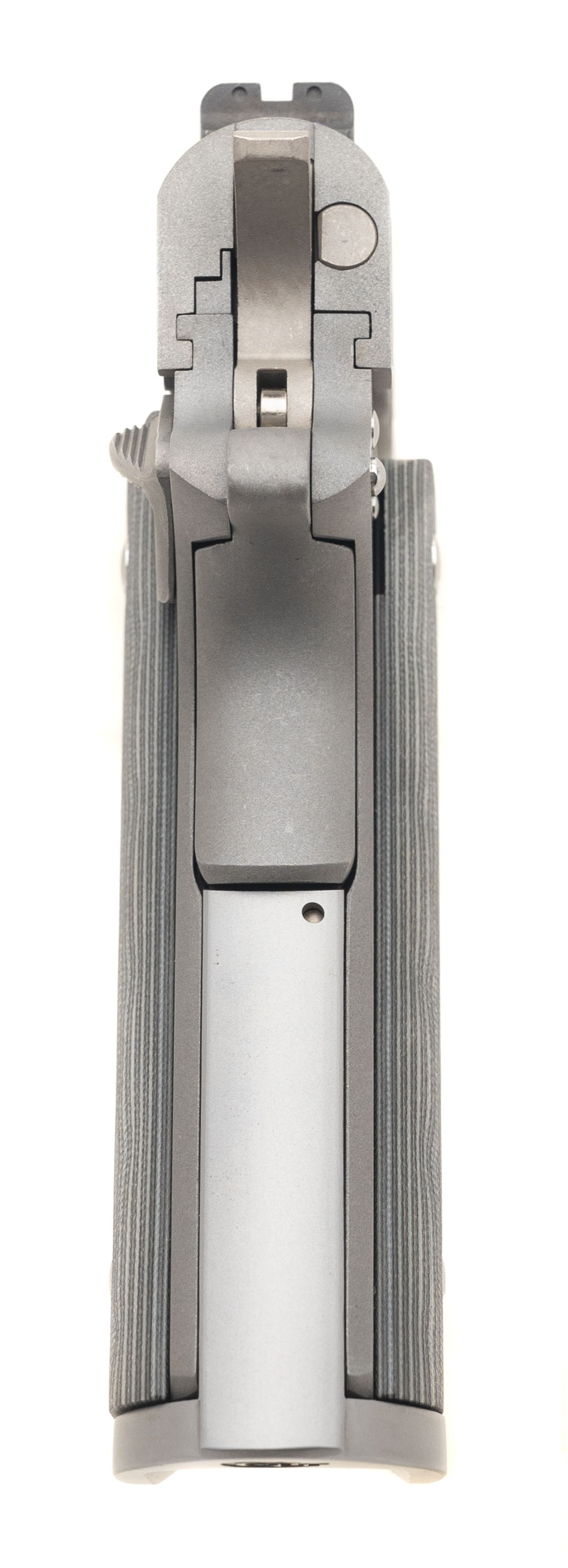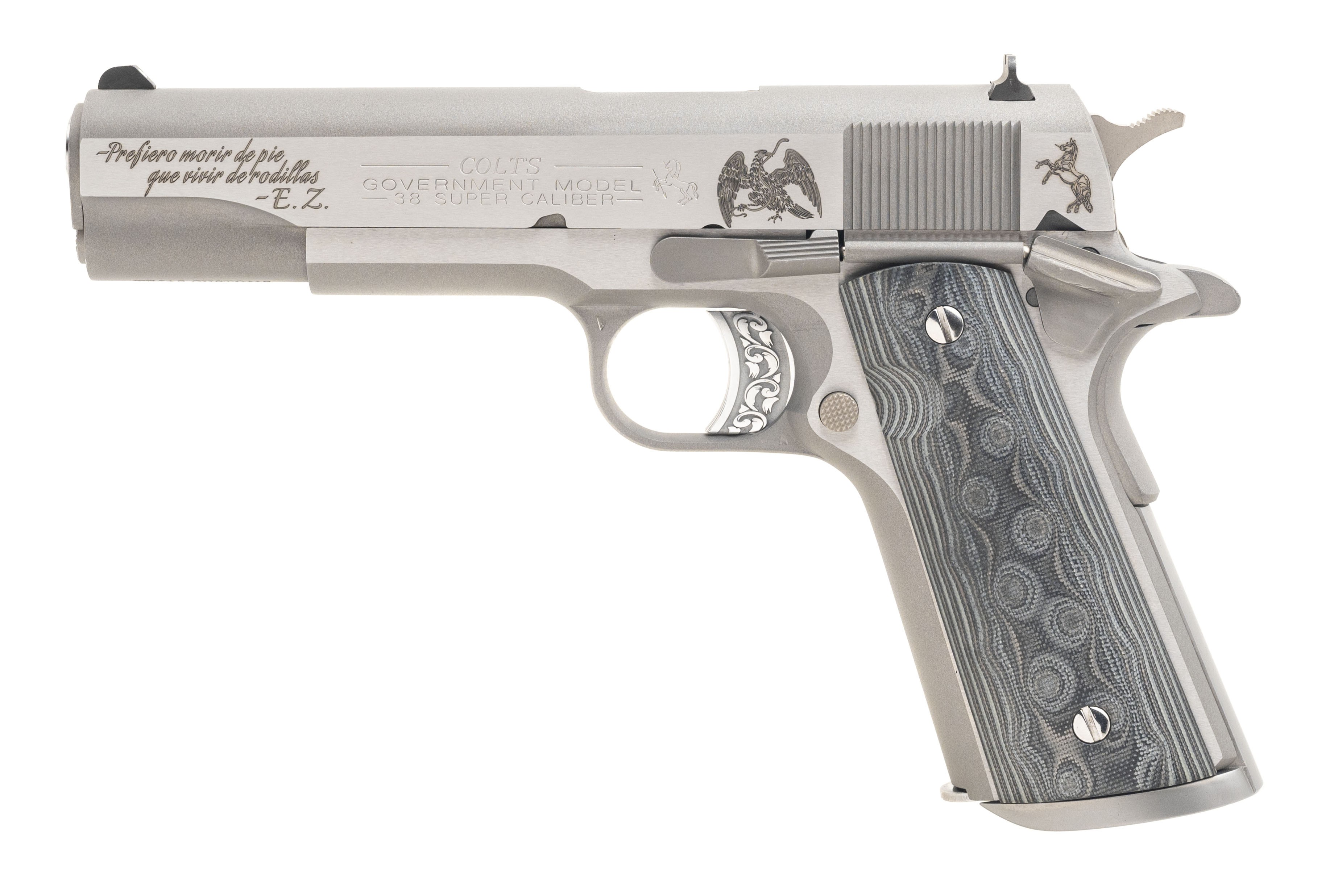 SN: 38SS09097. Modern production .38 Super with a 5" barrel. Custom engraved stainless steel 1911 with a Mexican motif. Has Mexican eagles, fighting rooster and Emiliano Zapata's famous saying, "Prefiero morir de pie que vivir de rodillas", which means "I'd rather die on my feet than live on my knees". The grips are smooth G-Mascus G10. A great looking "working" gun that you could carry and use. Consignment
