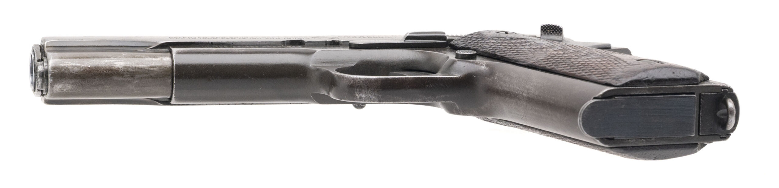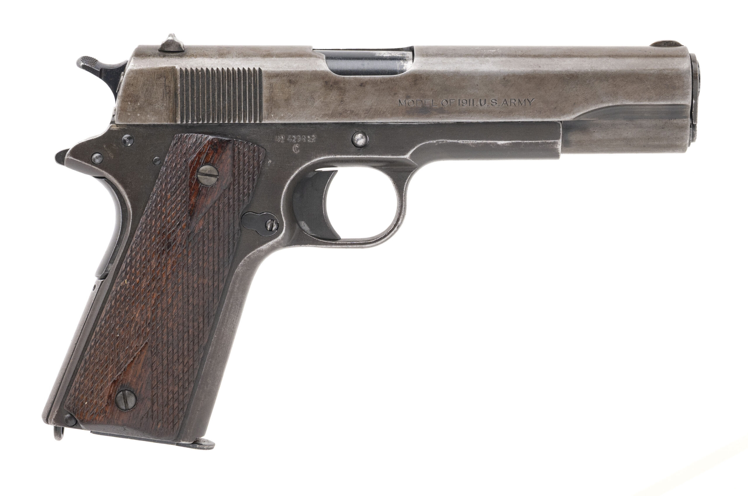 Serial No. 429892, made in 1918, .45ACP, 5" round barrel. Slide is a smooth light grey patina, Frame is a more of a darker patina with high edge wear noted. Grips show handling wear, crack in the barrel making it potentially unsafe to fireDALLAS LOCATION