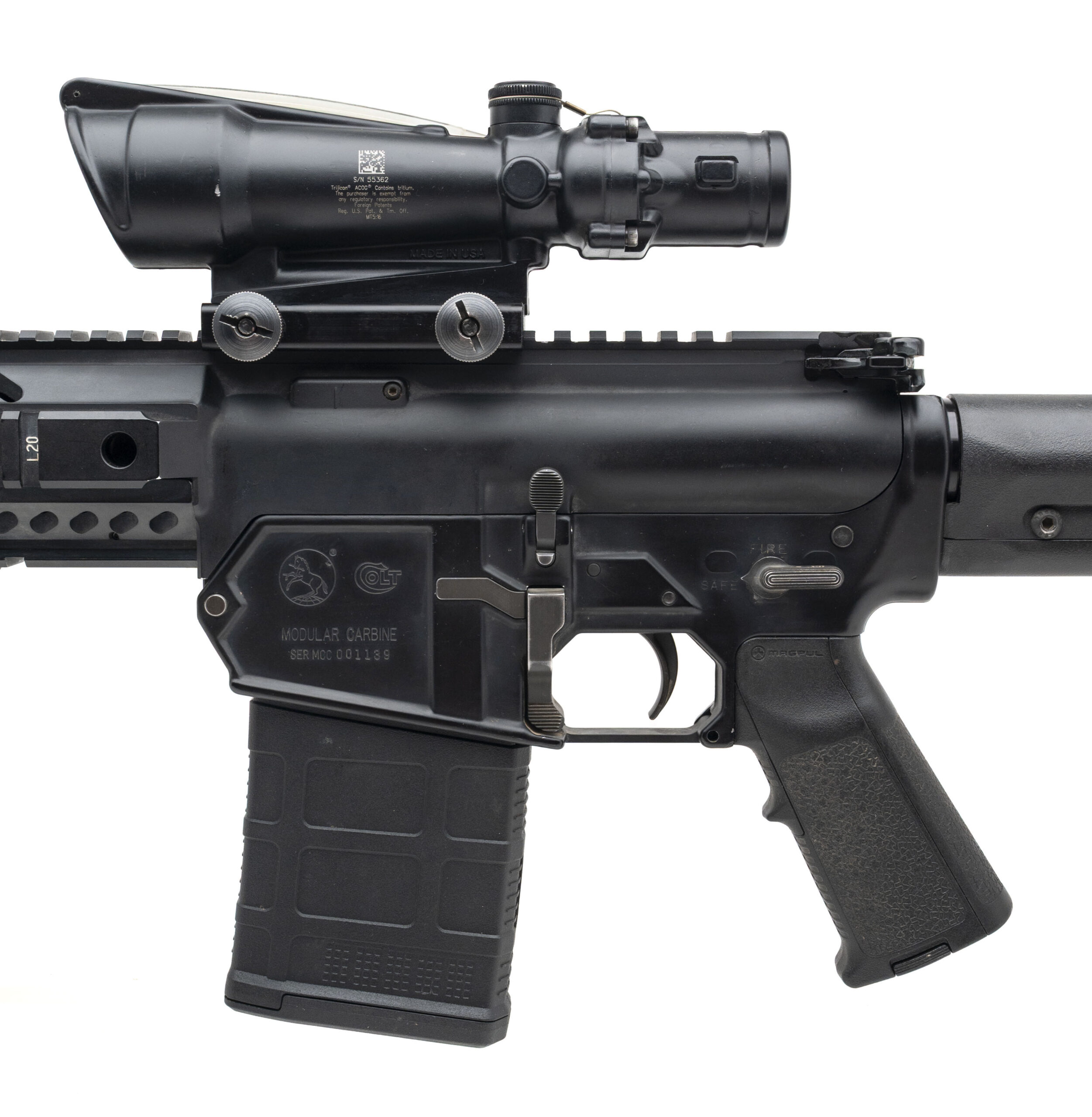 SN: MCC001139. Modern production, .308 Win with a 16" barrel. Bore is bright with strong rifling. Semi-auto tactical carbine with a Trijicon ACOG 3.5x35 scope w/green crosshair reticle and full ambidextrous controls. Very good condition overall. Includes original case for Trijicon ACOG optic.(CONSIGNMENT)