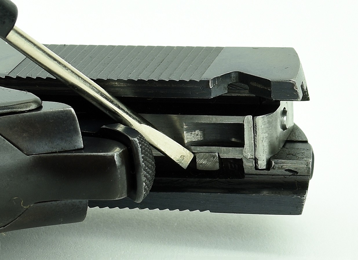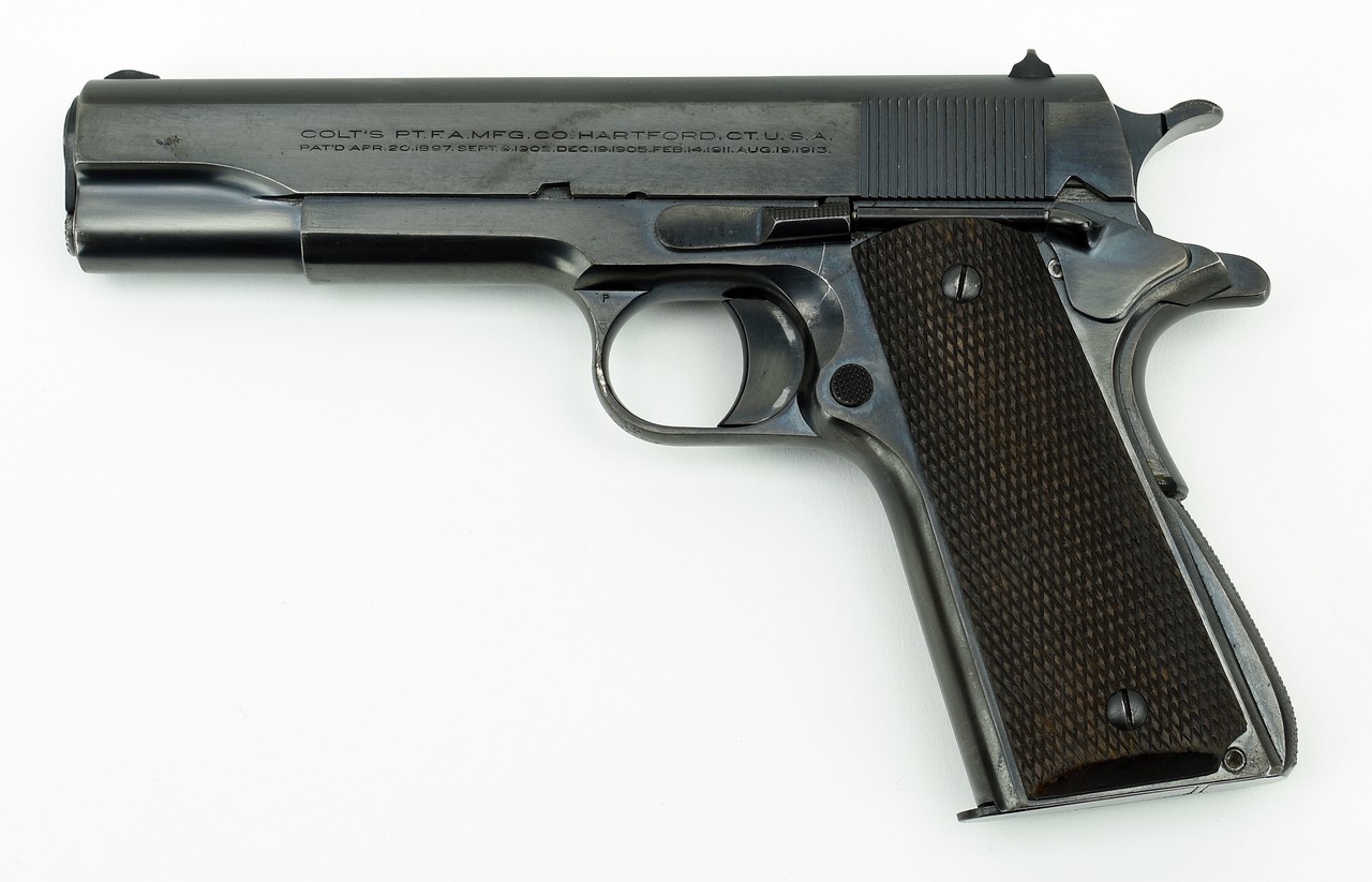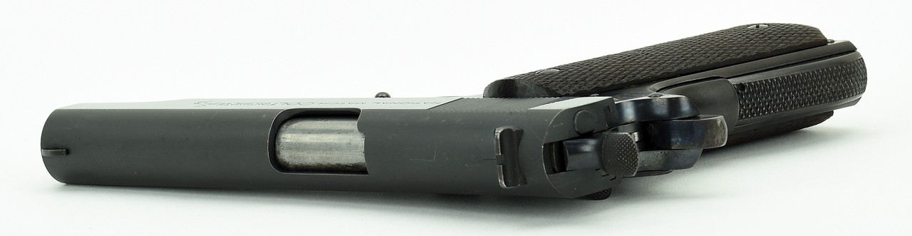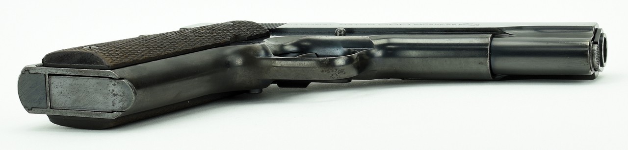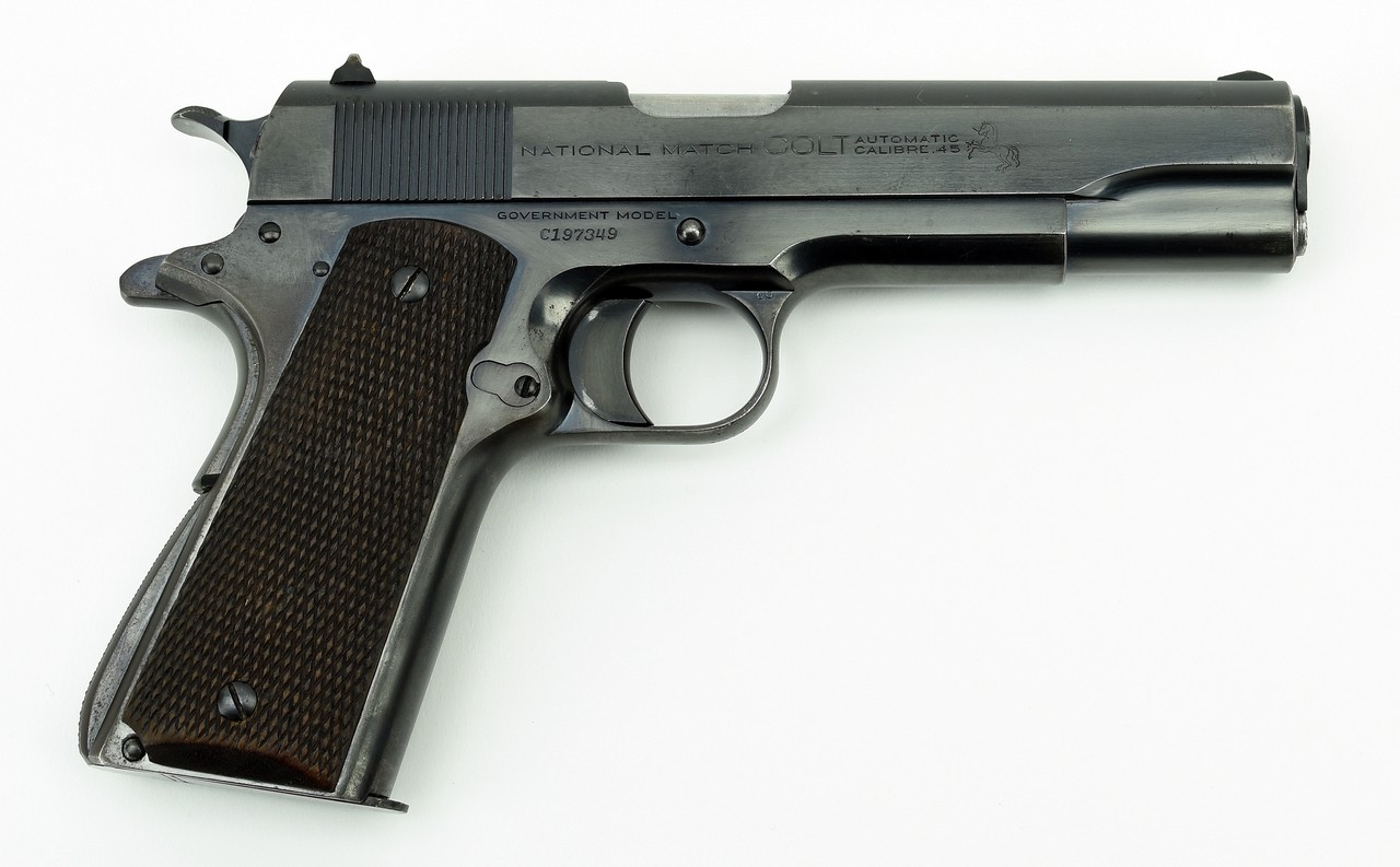 Colt National Match .45 ACP caliber pistol. Manufactured approximately 1939. Excellent bore. Action works perfectly. Grips are very good plus. Gun has a Schwartz safety. Gun has approximately 95-96% blue. Correct half blue magazine.