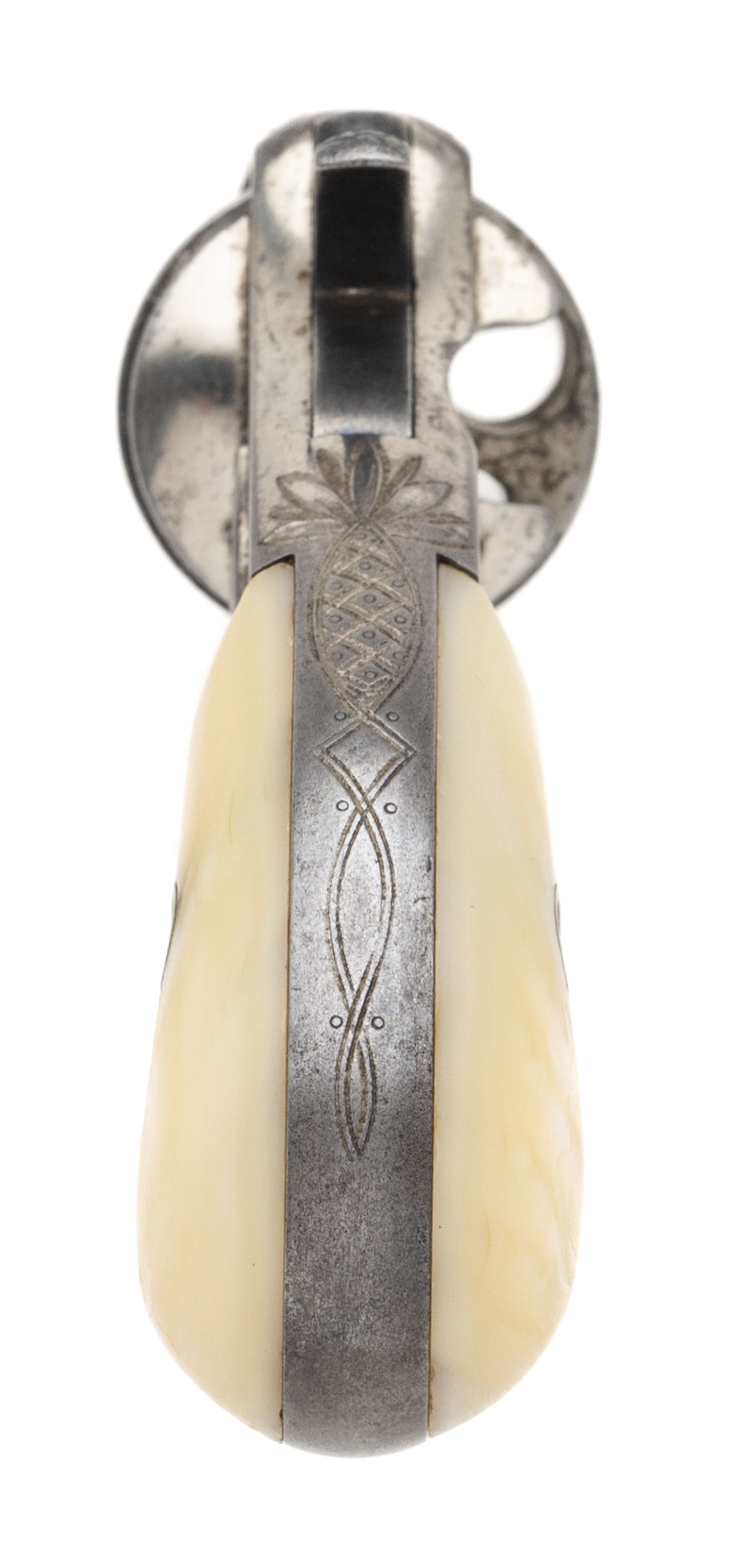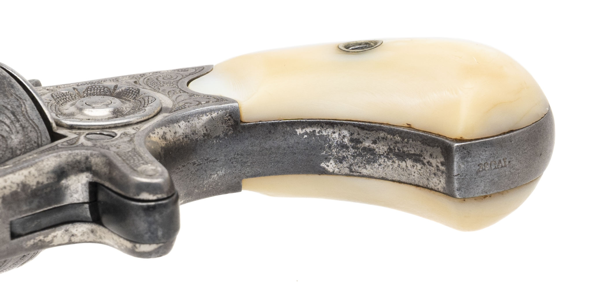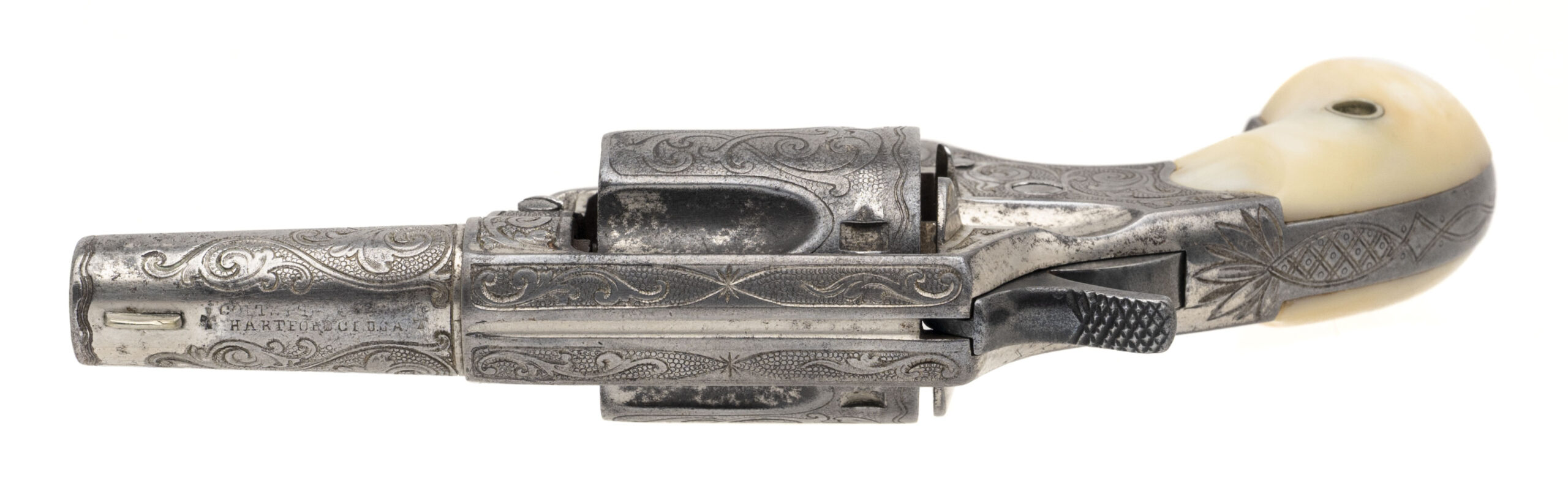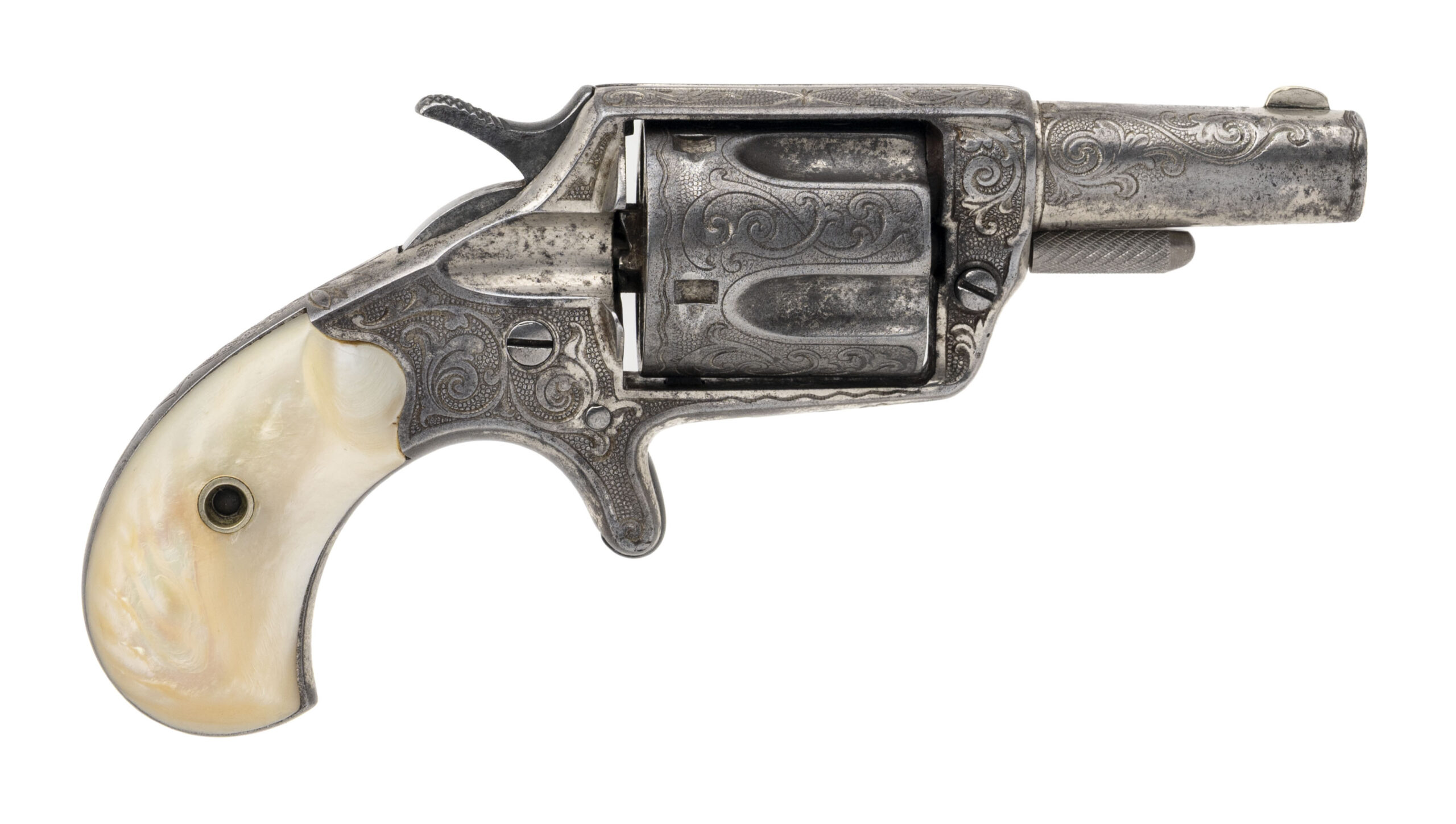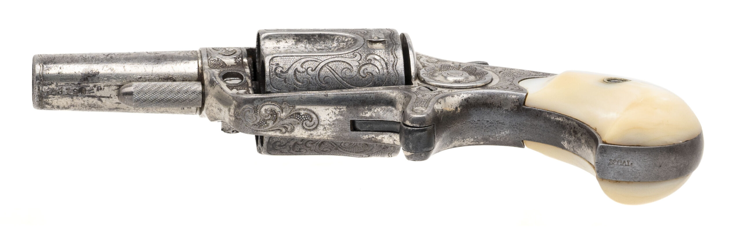 Serial number 3194. Made in 1875. 38 RF caliber with a 2.25” barrel. This is a factory engraved gun that has approximately 30% of the original nickel finish. This is a nice sharp gun with sharp engraving and clear markings. The grips are mother of pearl. Very fine factory engraved New Line 38 RF!