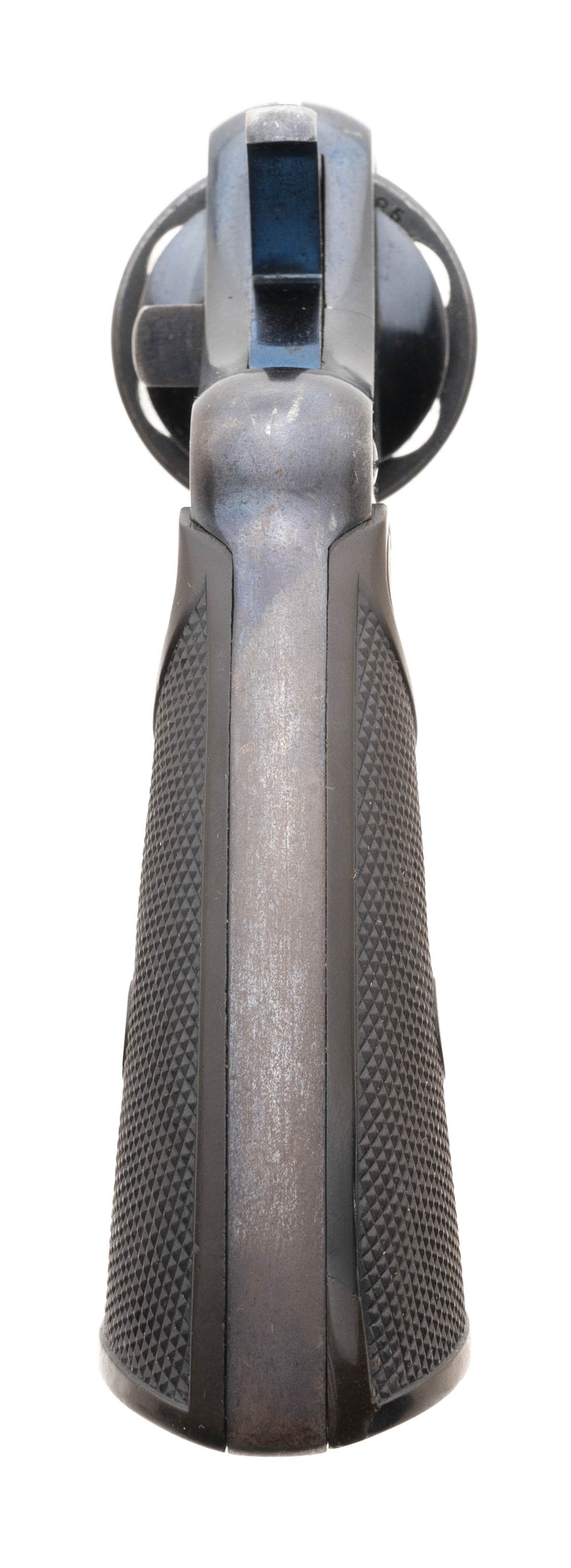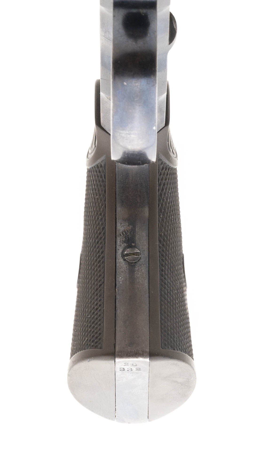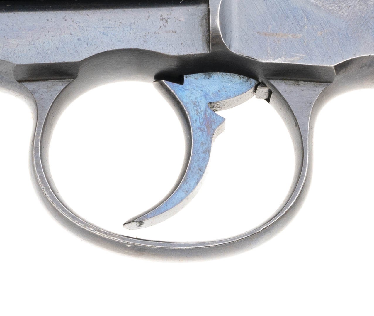 This 41 Long or Short Colt New Navy Model of 1889 is circa 1893. The 6" barrel has a fine bore with bright rifling with a couple of spots in the grooves. The gun retains approx. 95% bright Colt blue with grip strap and cylinder fading and light edge wear. While this is a true 1889 model, it has the 1892 style frame modifications with the cut outs for the 1892 hand and locking bolt which are not used on this pistol. The checkered hard rubber grips, with the oval COLT at the top, are excellent with no chips or cracks. The action functions correctly. One rarely finds a New Navy Model 1889 revolver in this condition. Most have little or no finish remaining. Don't miss this fine example!