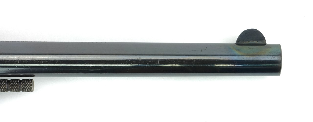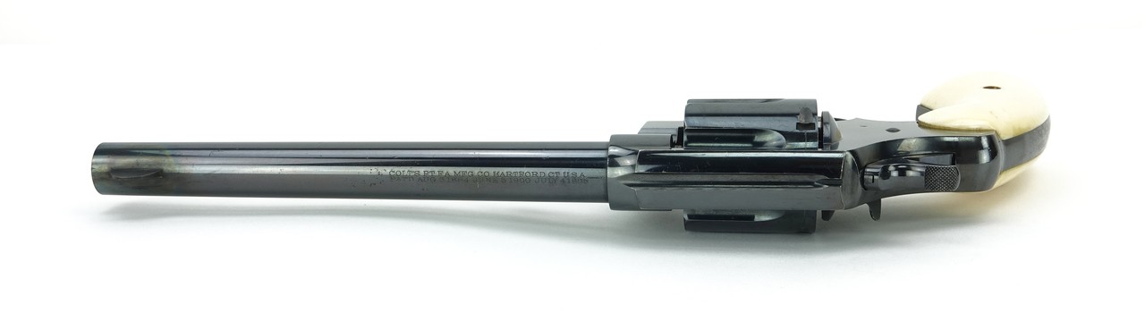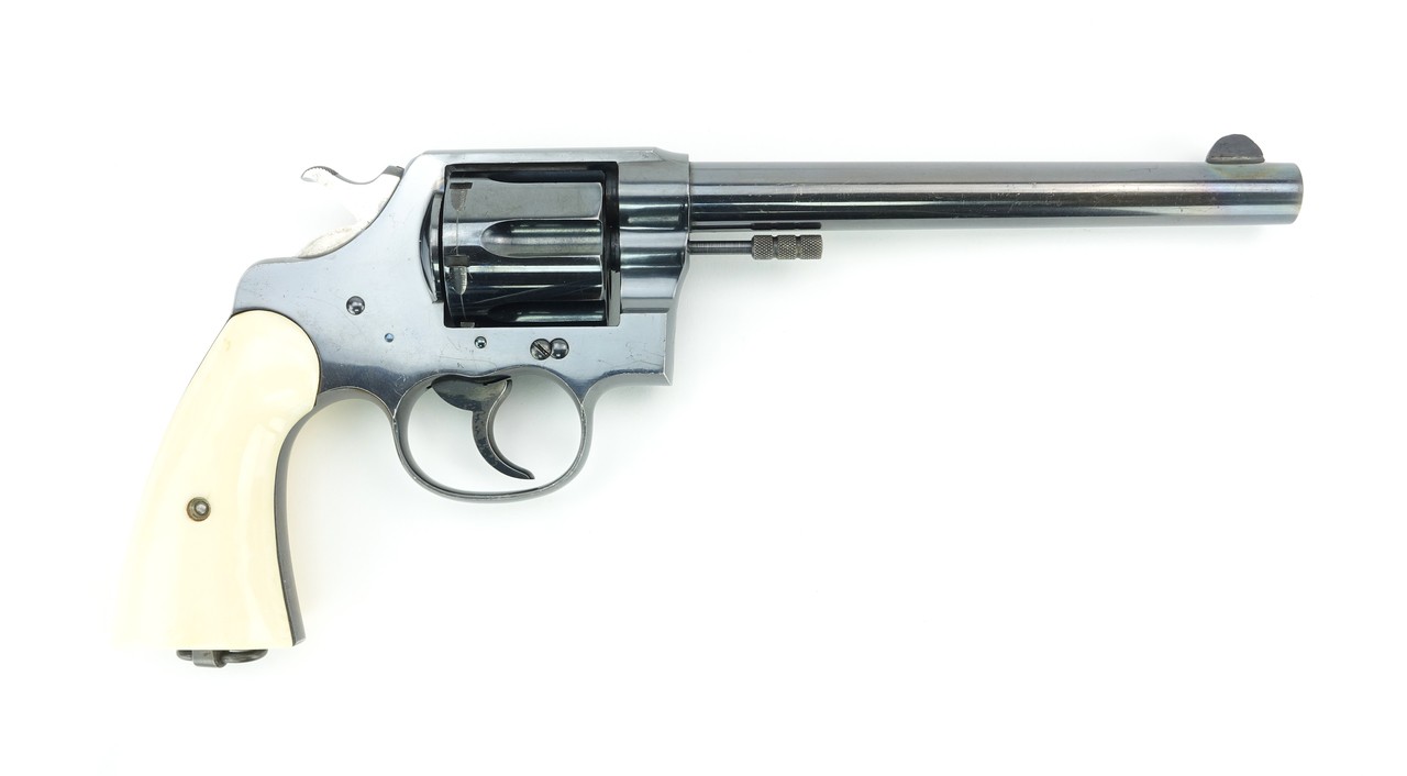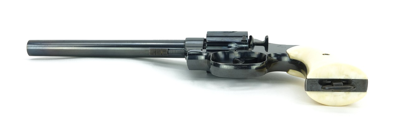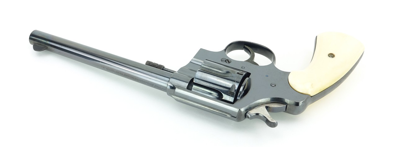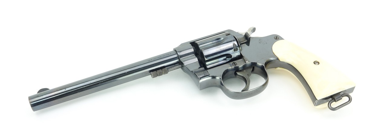 Colt New Service .45 Colt caliber revolver. Beautiful commercial New Service with flat latch. Manufactured in 1914. Gun has a perfect bore. Action works perfectly. Gun has approximately 96% beautiful early high luster blue. Note: front sight has been repaired and the repair was well done and not noticeable. Caliber is .45 Long Colt. 7 ½” barrel.