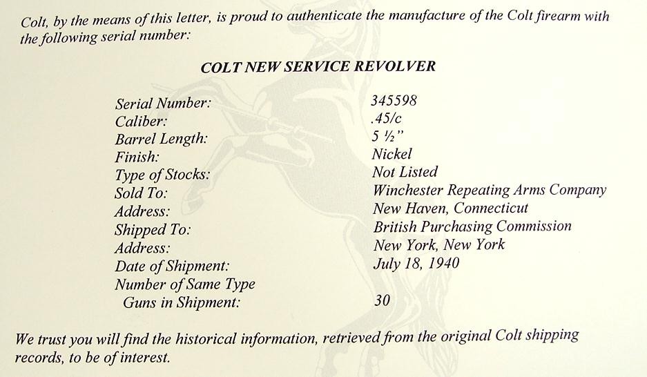 Colt New Service .45 Long Colt caliber revolver. Rare Battle of Britain New Service with factory letter stating gun was purchase (c5528)