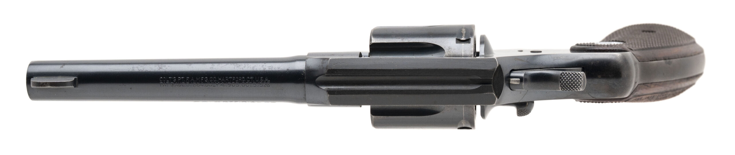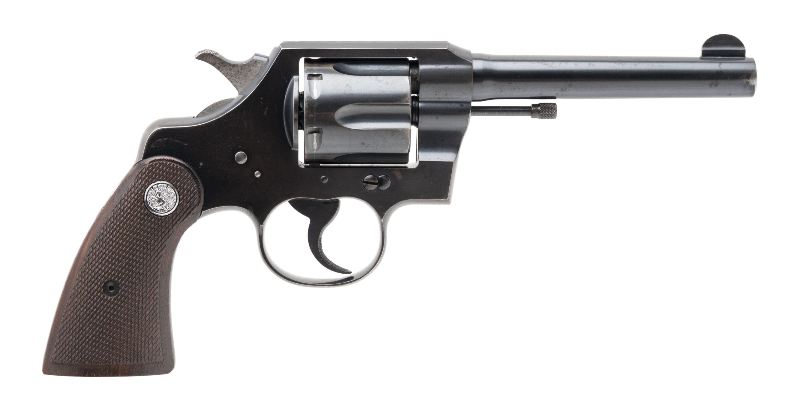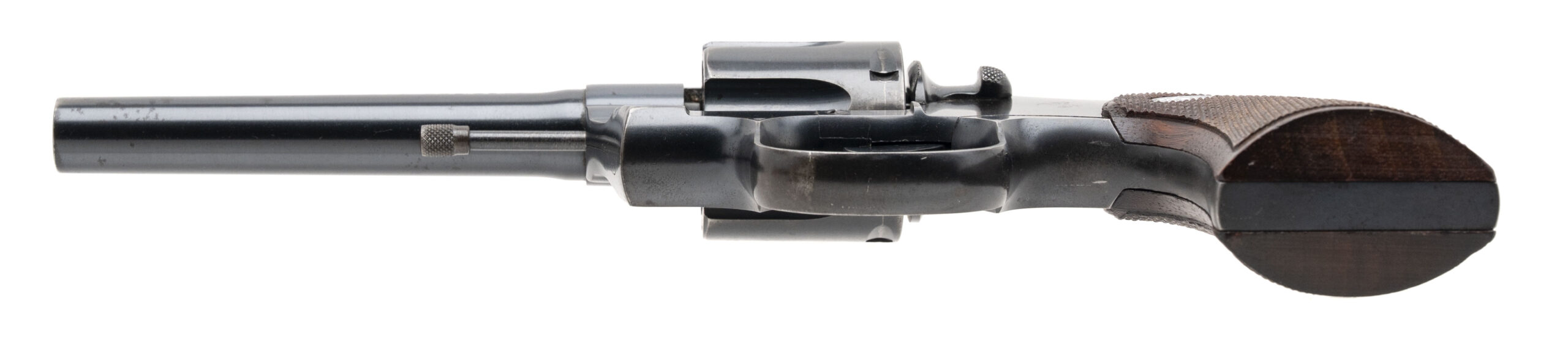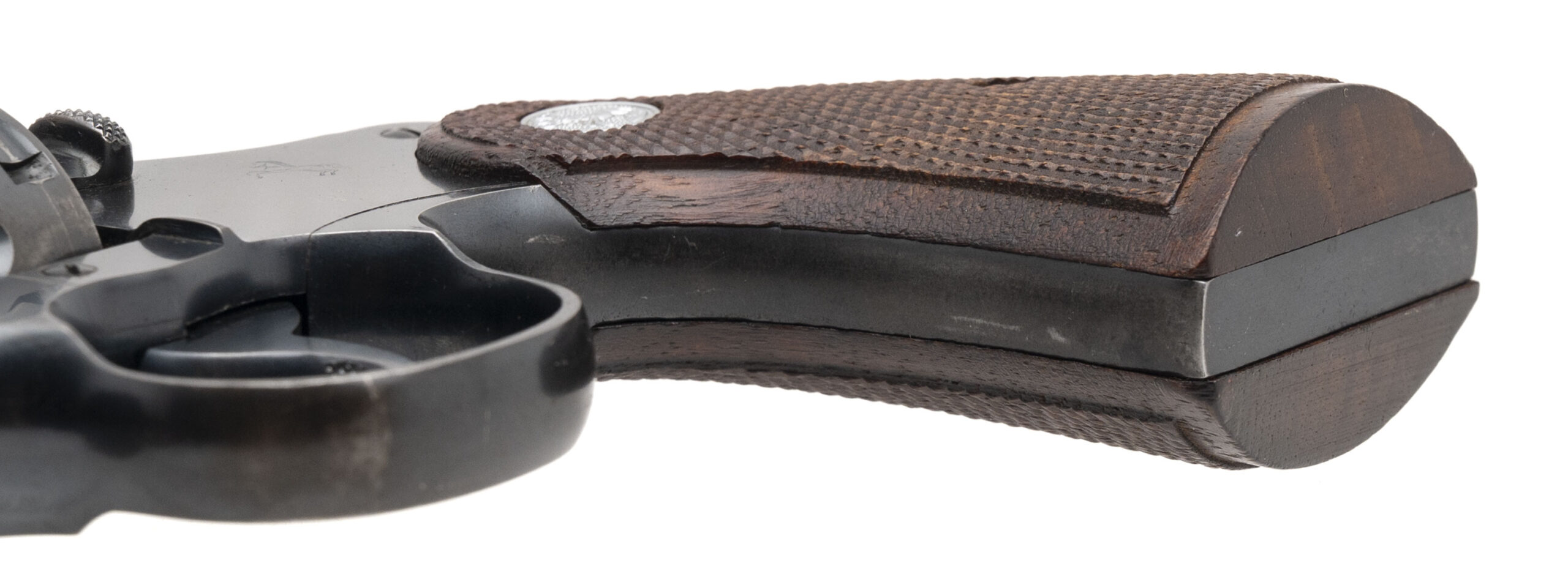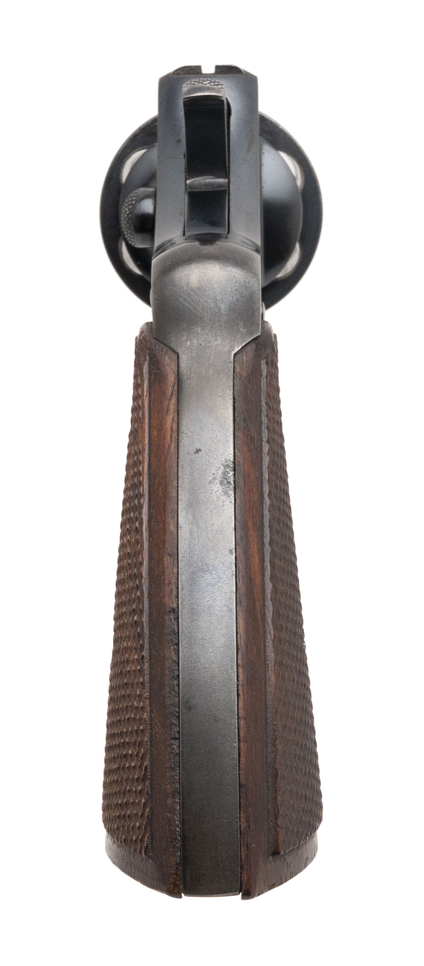 SN: 705078. Made in 1943, .38 Special with a 5" barrel. Bore is excellent. D/A service revolver with blue finish and wood grips. Has about 80% blue mixed with brown patina, mainly on the grip frame. The grips are very good with light wear.