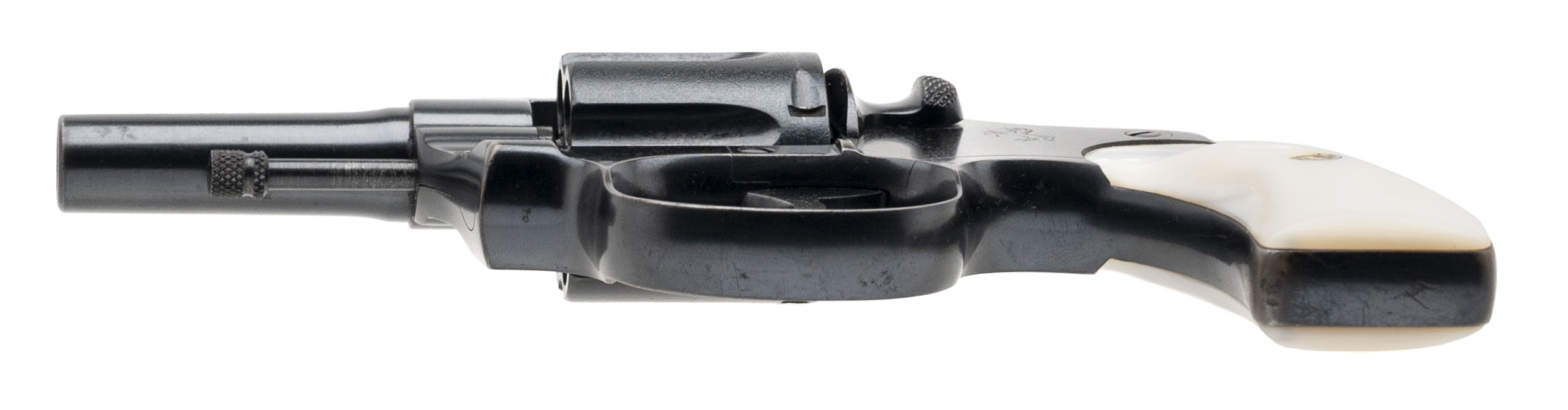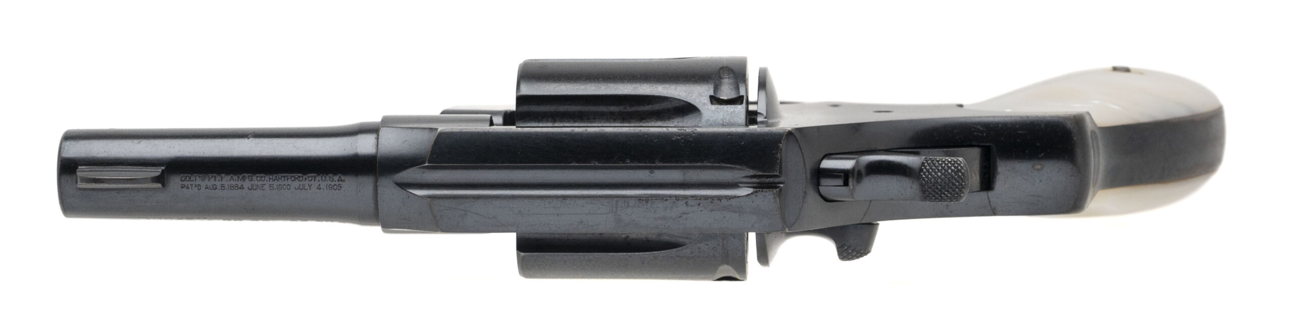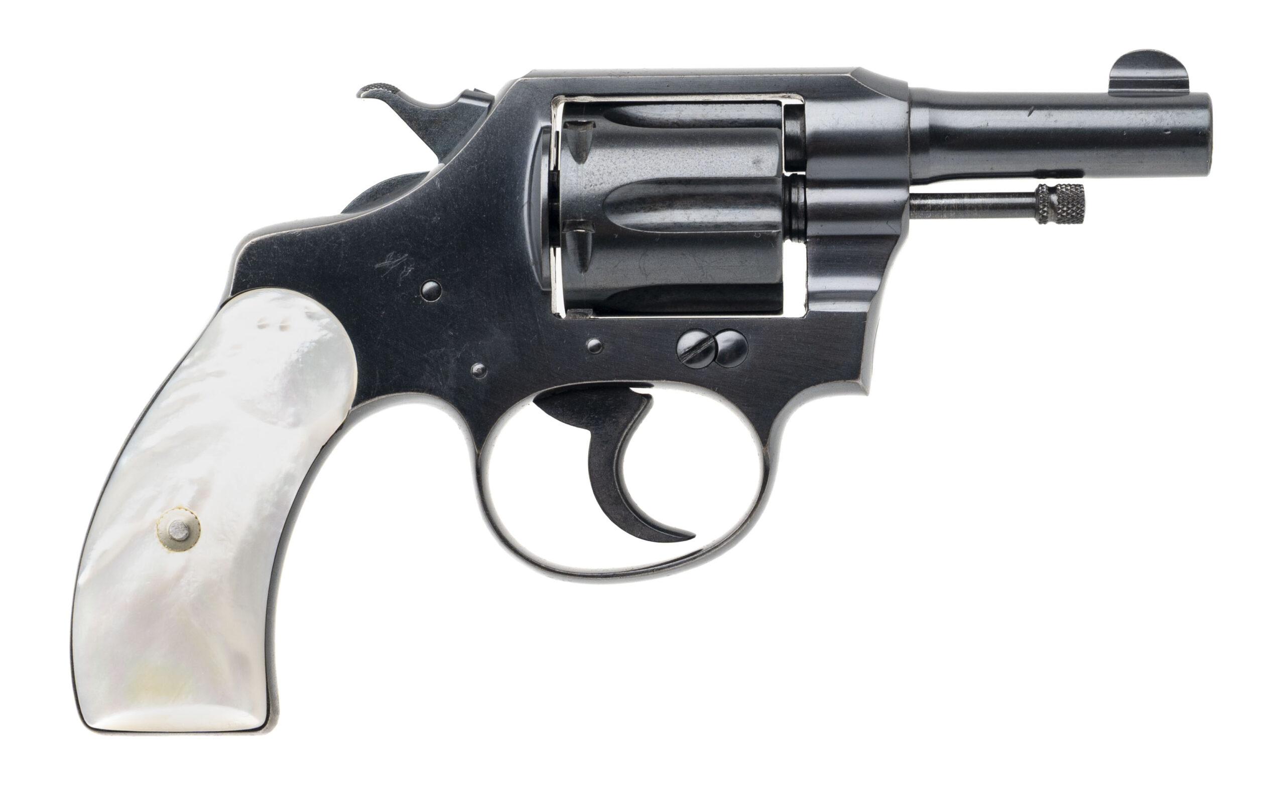 SN: 114313 made in 1923. Small frame 6 shot revolver marked on the barrel for “32 Police Ctg.” Which is a 32 S&W long with a flat nose but Colt did not want to mark their products with a competitors name when these were produced. This gun has a 2.5" barrel. This gun is in excellent condition as professionally refinished long ago. This gun has a beautiful pair of mother of pearl grips. The action works perfect and the bore is excellent.