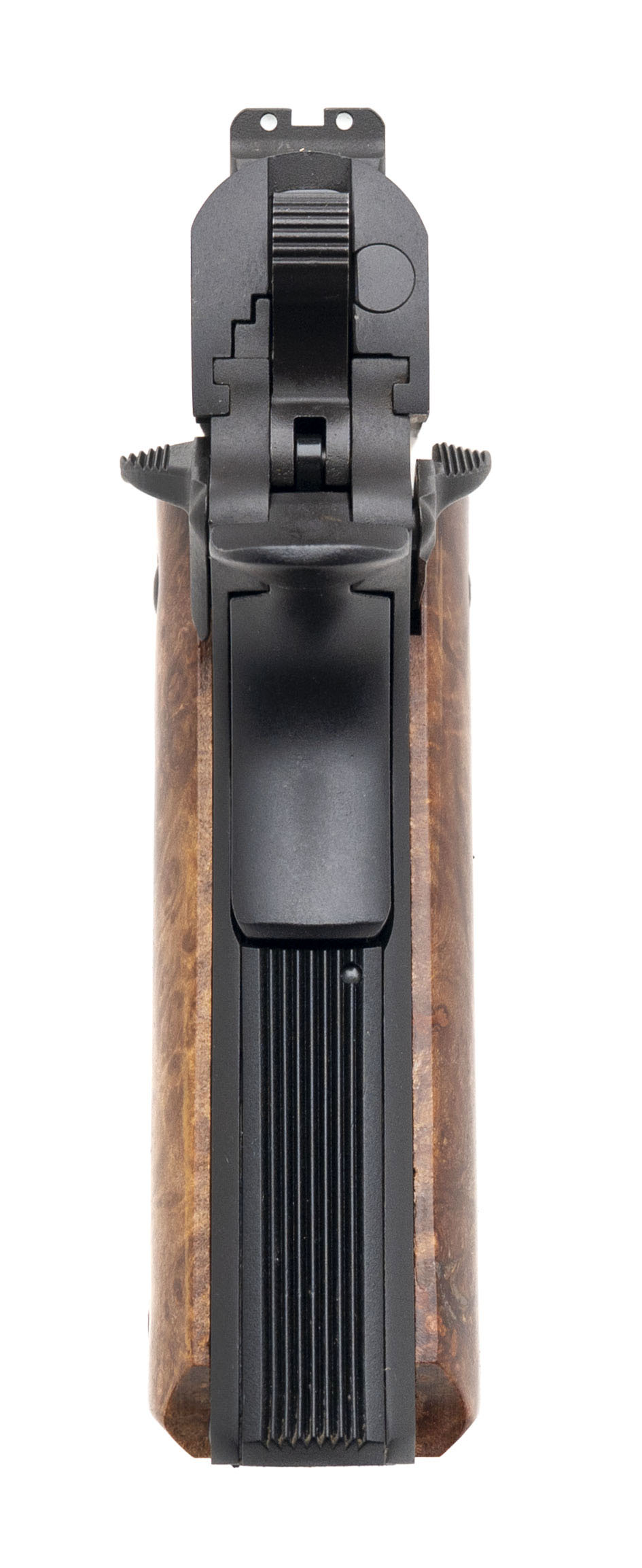 SN: PRE469. Made in 2003, .45 ACP with a 5" barrel. One of 750 deluxe engraved and gold foil decorated 1911 pistols. Has burl wood grips. Excellent condition with box.