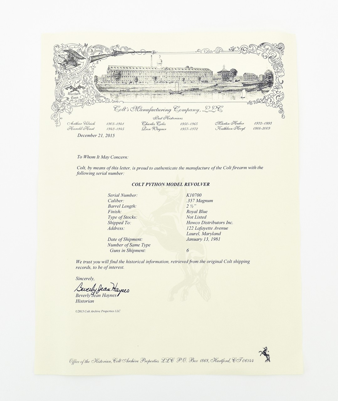 Colt Python .357 Mag caliber revolver. Rare 2 ½” blue model with royal blue finish. Made in 1981. Mint condition with box and factory letter. A beautiful snub Python.