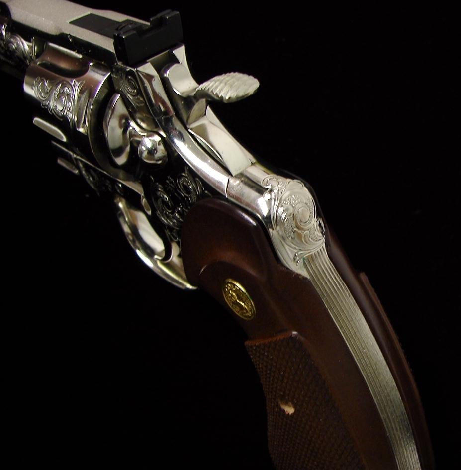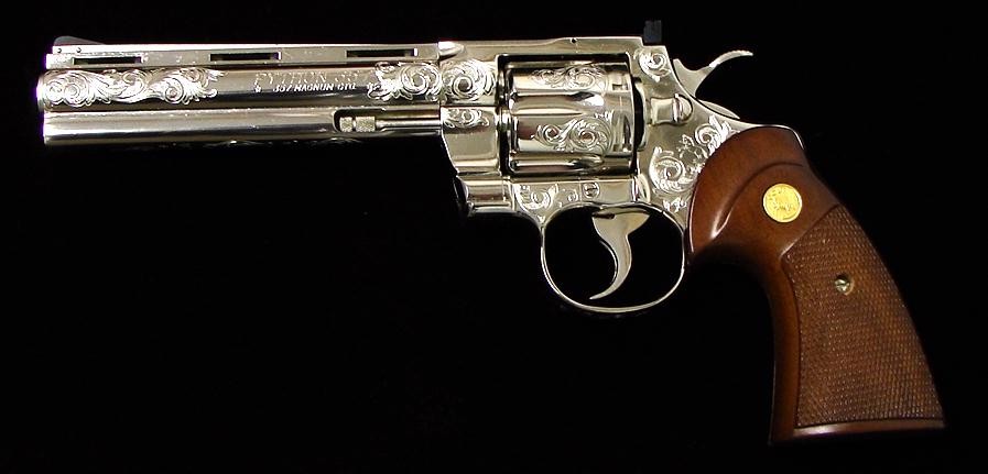 Colt Python .357 Mag caliber revolver. Beautiful factory "C" engraved 6" nickel Python. Very rare and desirable, in mint conditi (C7642)