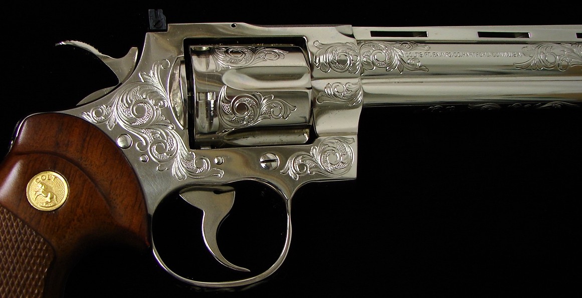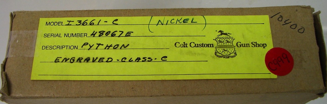 Colt Python .357 Mag caliber revolver. Beautiful factory "C" engraved 6" nickel Python. Very rare and desirable, in mint condition. With custom shop leatherette case and cardboard sleeve with customer shop label.