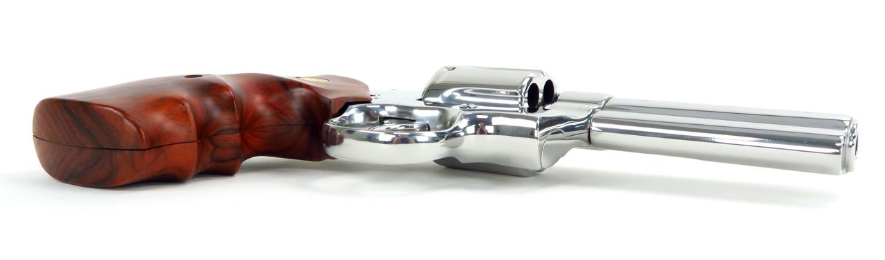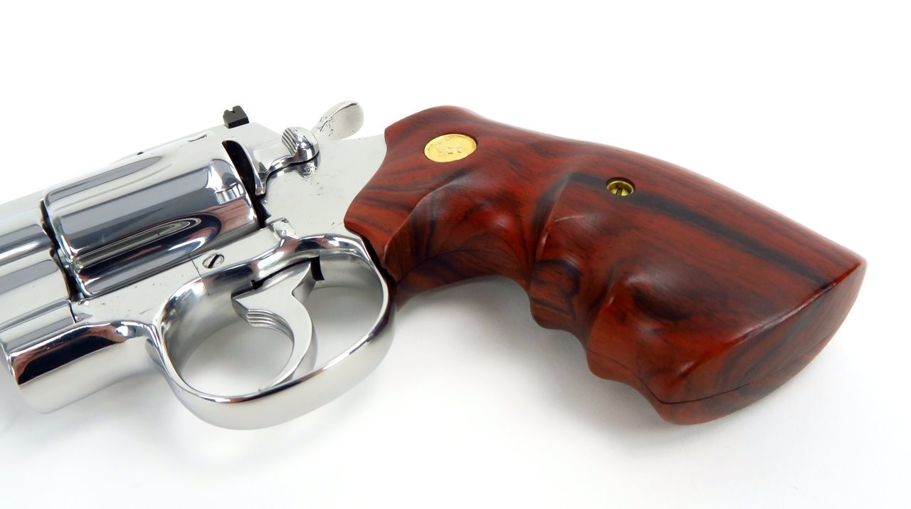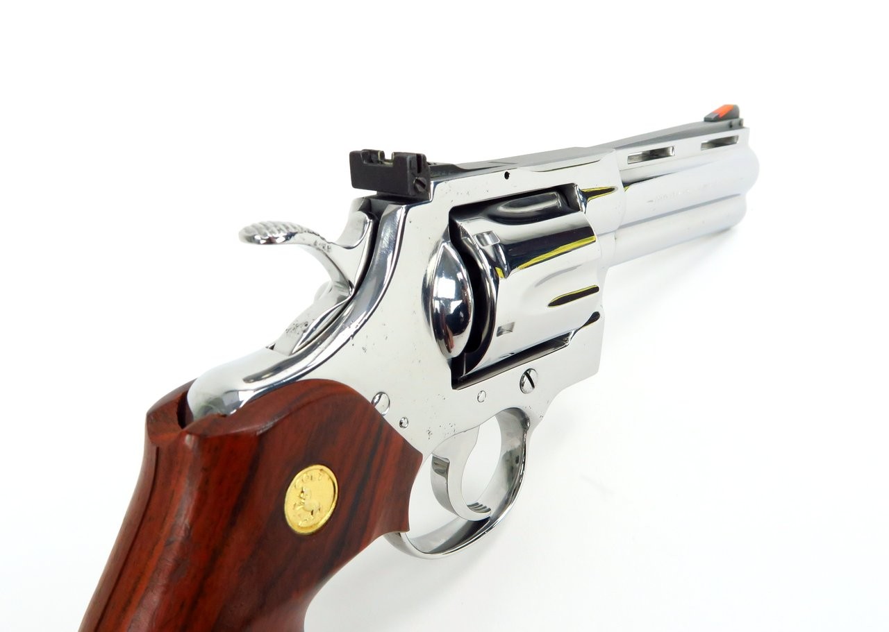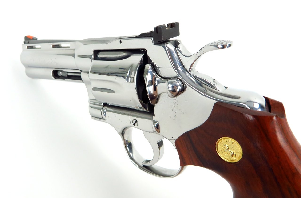 Colt Python .357 Magnum caliber revolver. 4” bright stainless steel model. Shows some pitting, probably from careless storage. It’s mainly on the frame, but has a bit on the barrel and cylinder too. The bore is excellent, and locks up tight. Has custom wood grips. A good gun with a few blemishes, great for shooting and carrying.
