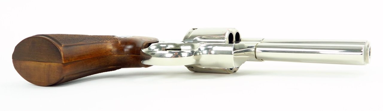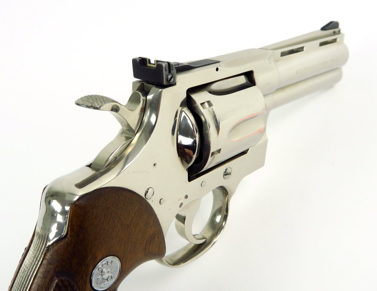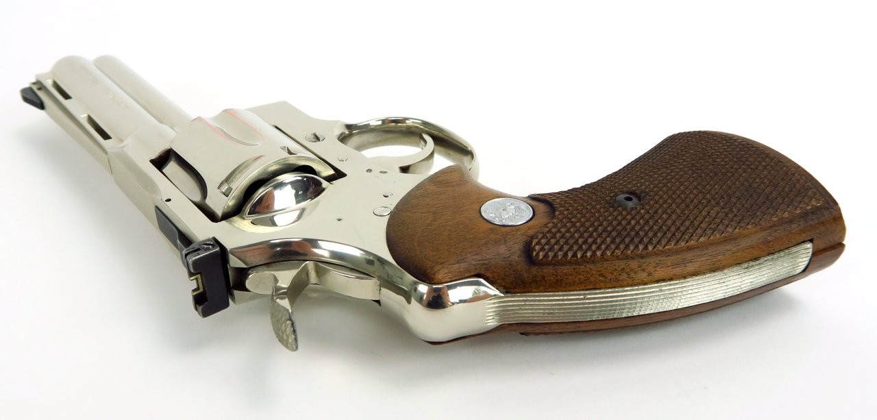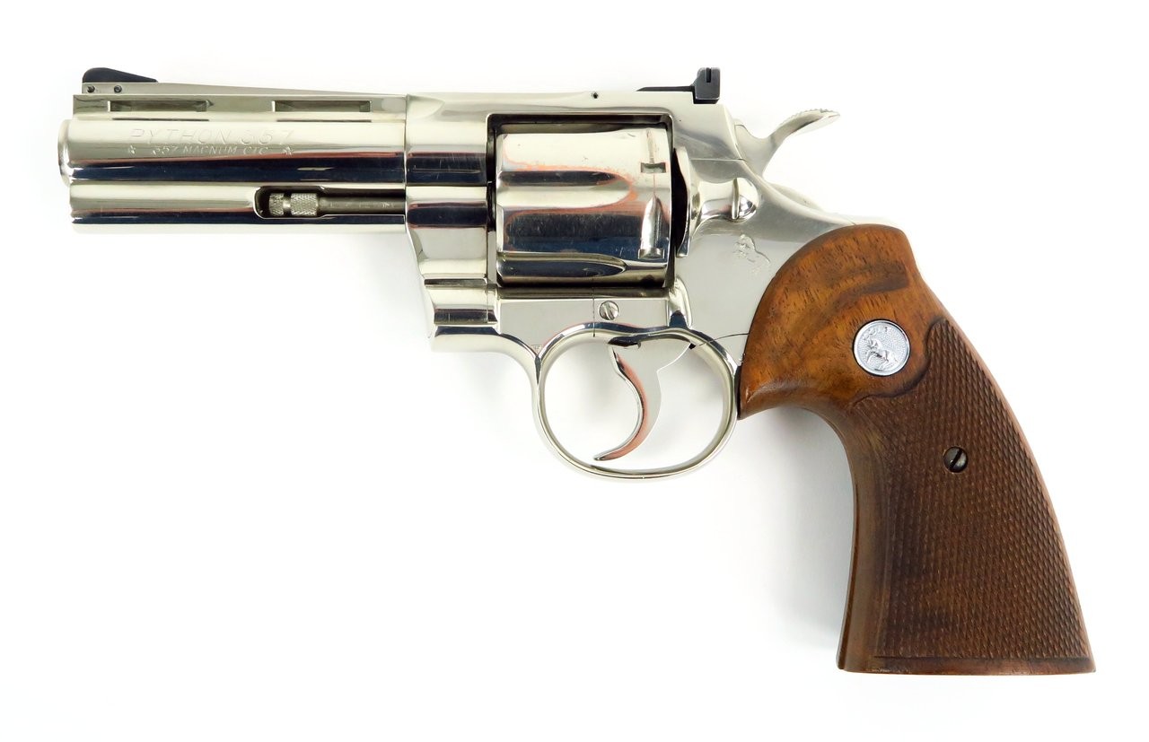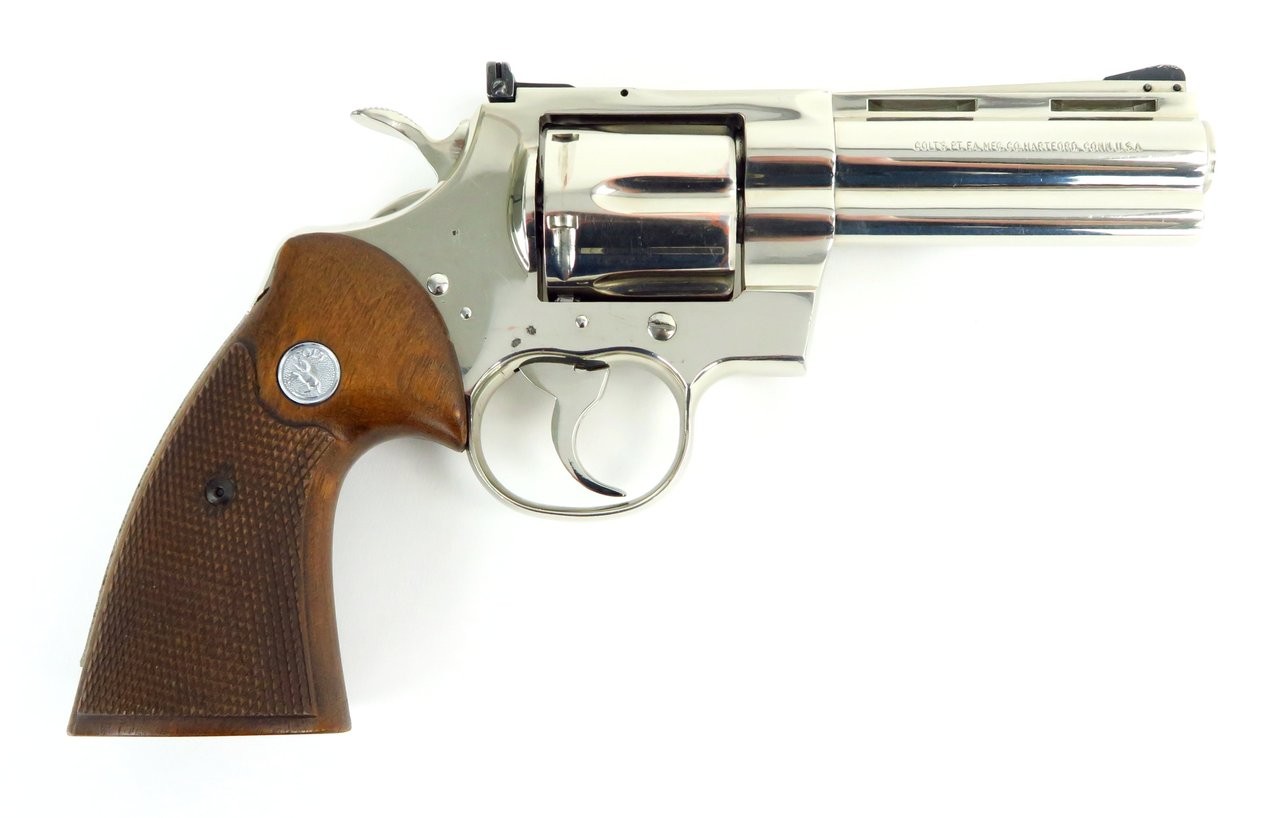 Colt Python .357 Magnum caliber revolver. 4” nickel model made in 1972. Shows light wear to the finish, overall excellent condition with 98% nickel finish. Bore and action are excellent. A desirable early python.