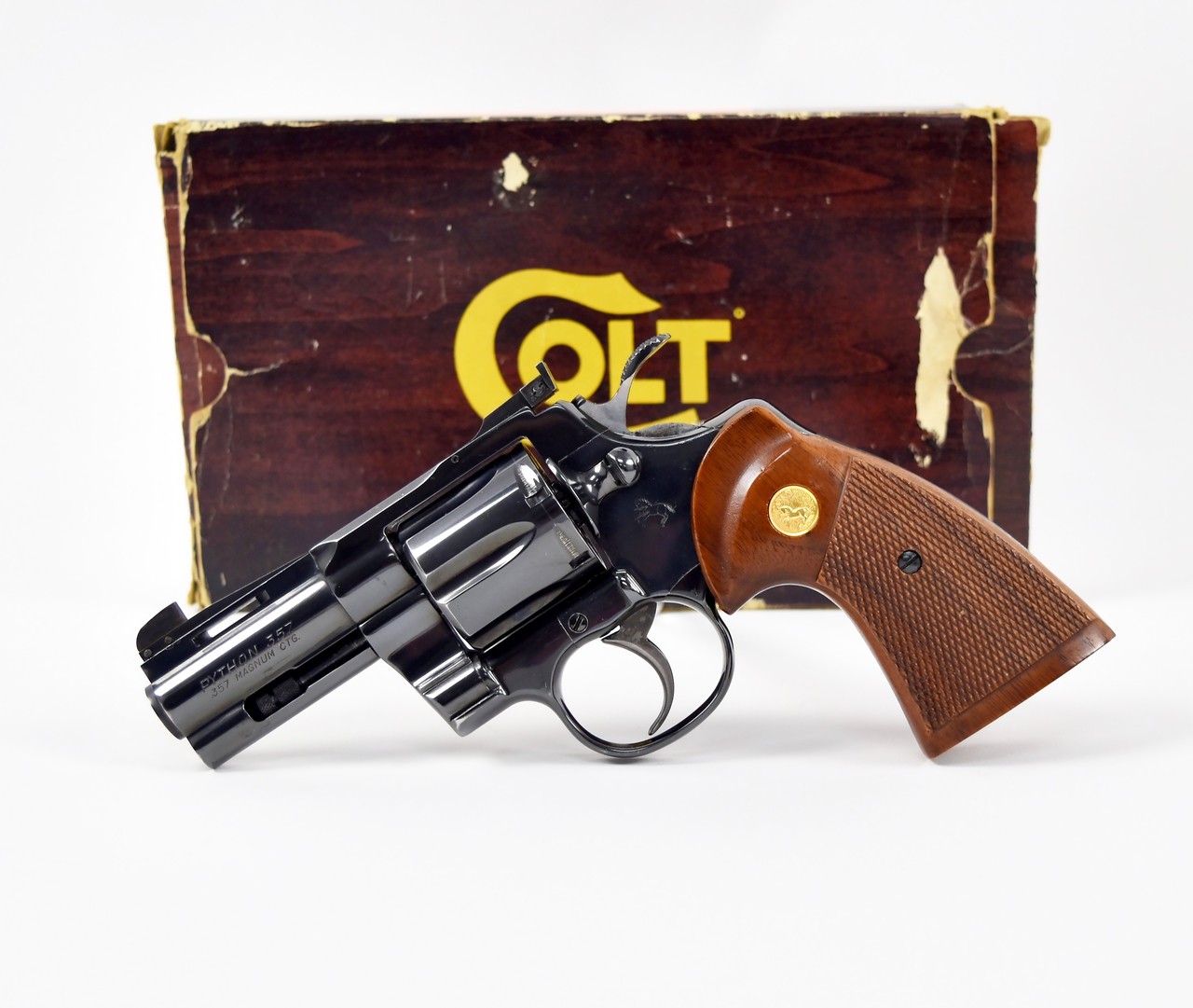 Colt Python .357 Magnum caliber revolver. Rare 3” blue Model, made in 1983. It has Royal Blue finish and elliason rear sight. The front sight appears to have been altered. We have confirmed with Colt that this is an original 3” gun and a letter has been ordered.